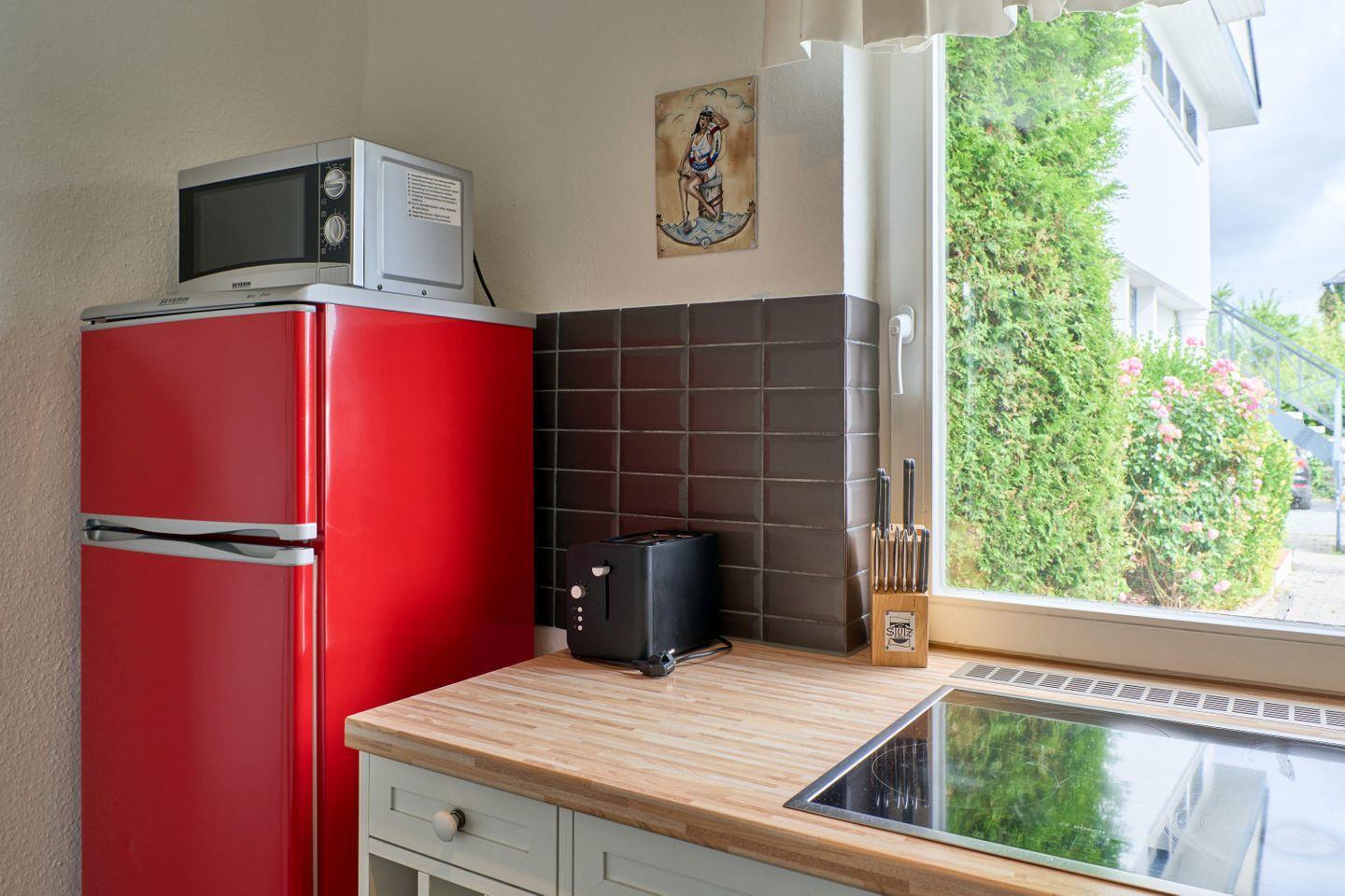 Die geschlossene Küche des Sonnenhofs ist großzügig eingerichtet und bietet Ihnen alle Annehmlichkeiten, um köstliche Mahlzeiten zuzubereiten. Ein Cerankochfeld, ein Backofen, ein Kühlschrank, eine Kaffeemaschine sowie Geschirr und Besteck stehen zur Verfügung. Der Esstisch in der Nähe der Küche lädt dazu ein, gemeinsame Mahlzeiten zu genießen und gesellige Abende zu verbringen. Angrenzend finden Sie ein Wohnzimmer, das mit einem bequemen Sofa, einem Sessel und einem Kamin ausgestattet ist, der für eine behagliche Atmosphäre sorgt – perfekt für entspannte Abende zu Hause.