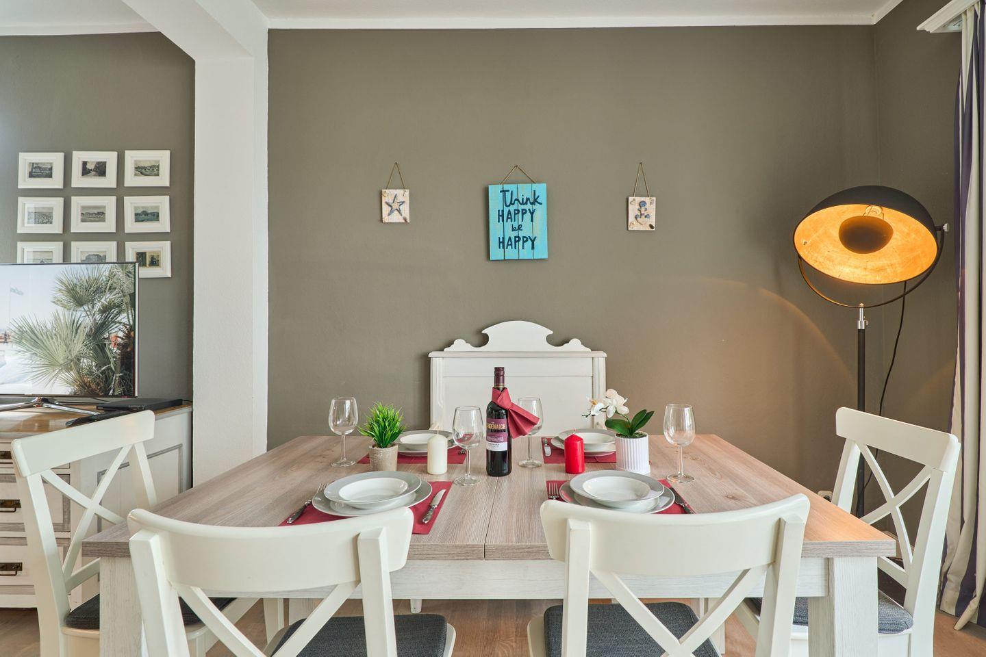 Zusätzliche Ausstattungsmerkmale wie WLAN, ein Fernseher sowie eine Waschmaschine und ein Trockner, die gemeinschaftlich genutzt werden können, runden das Angebot ab. Eine großzügige Terrasse steht Ihnen ebenfalls zur Verfügung und bietet die Möglichkeit, die frische Meeresbrise und die sonnigen Tage im Freien zu genießen. Hier können Sie die Seele baumeln lassen und den Alltag hinter sich lassen.
