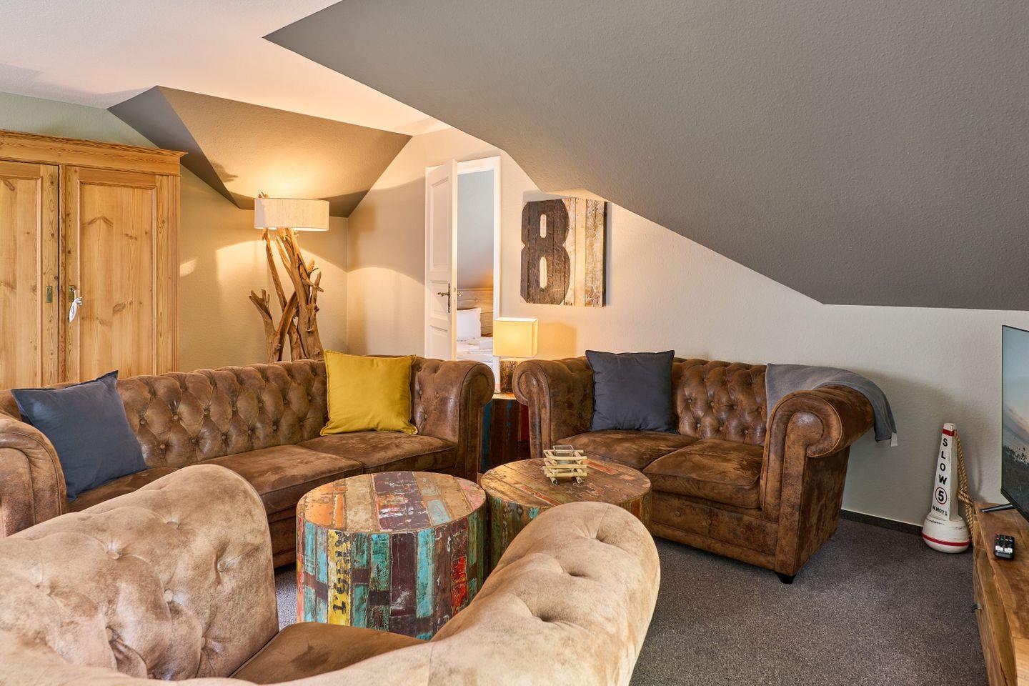 Der Wohnbereich ist liebevoll eingerichtet und verfügt über ein Sofa, einen Sessel sowie einen Esstisch, an dem Sie gemeinsam speisen oder entspannen können. Für Ihre Unterhaltung ist ein Fernseher vorhanden, und dank des kostenfreien WLANs bleiben Sie auch im Urlaub mit der digitalen Welt verbunden.