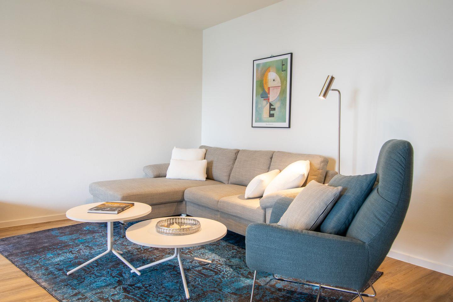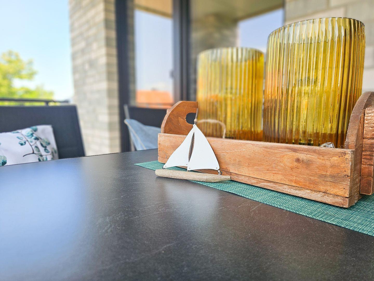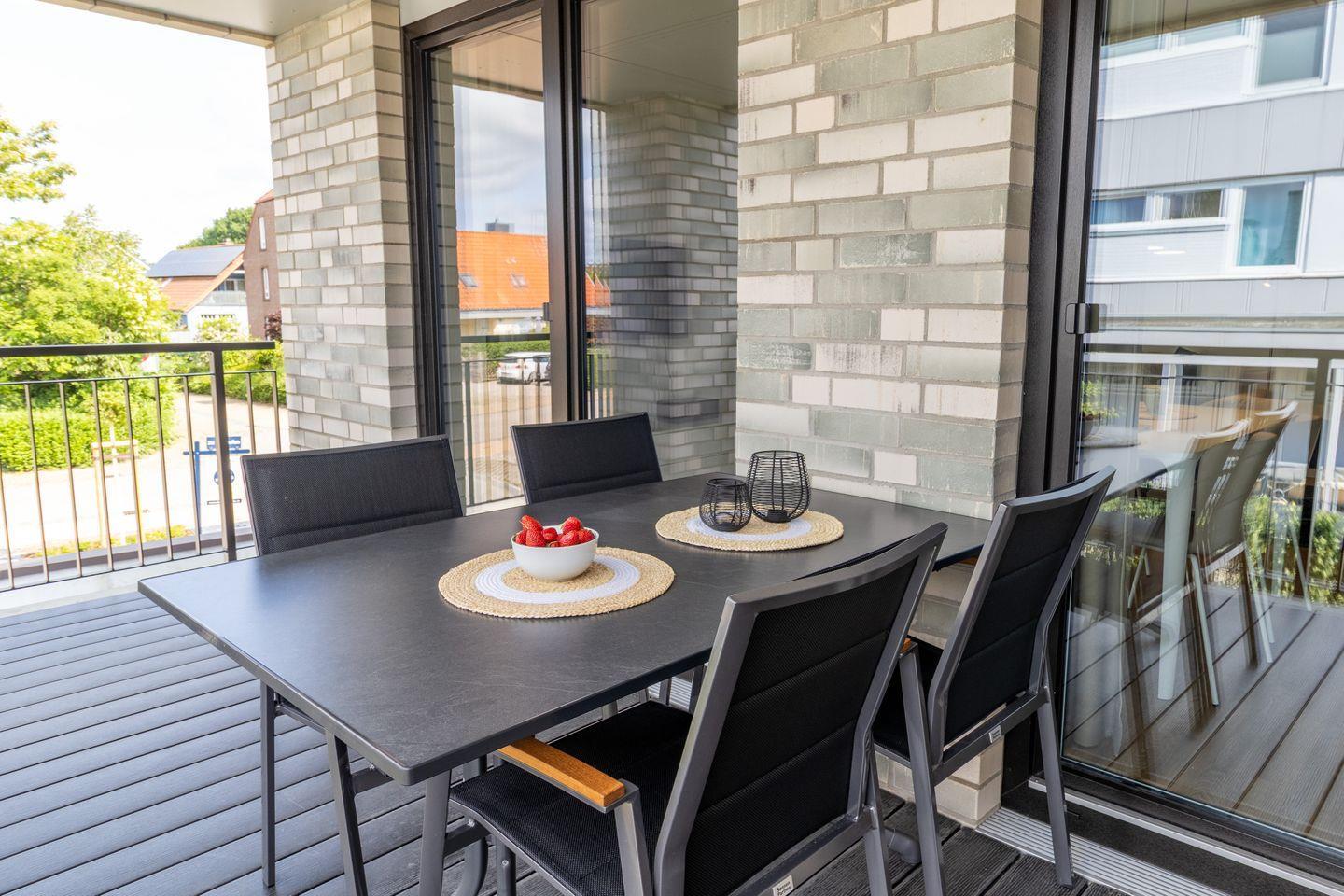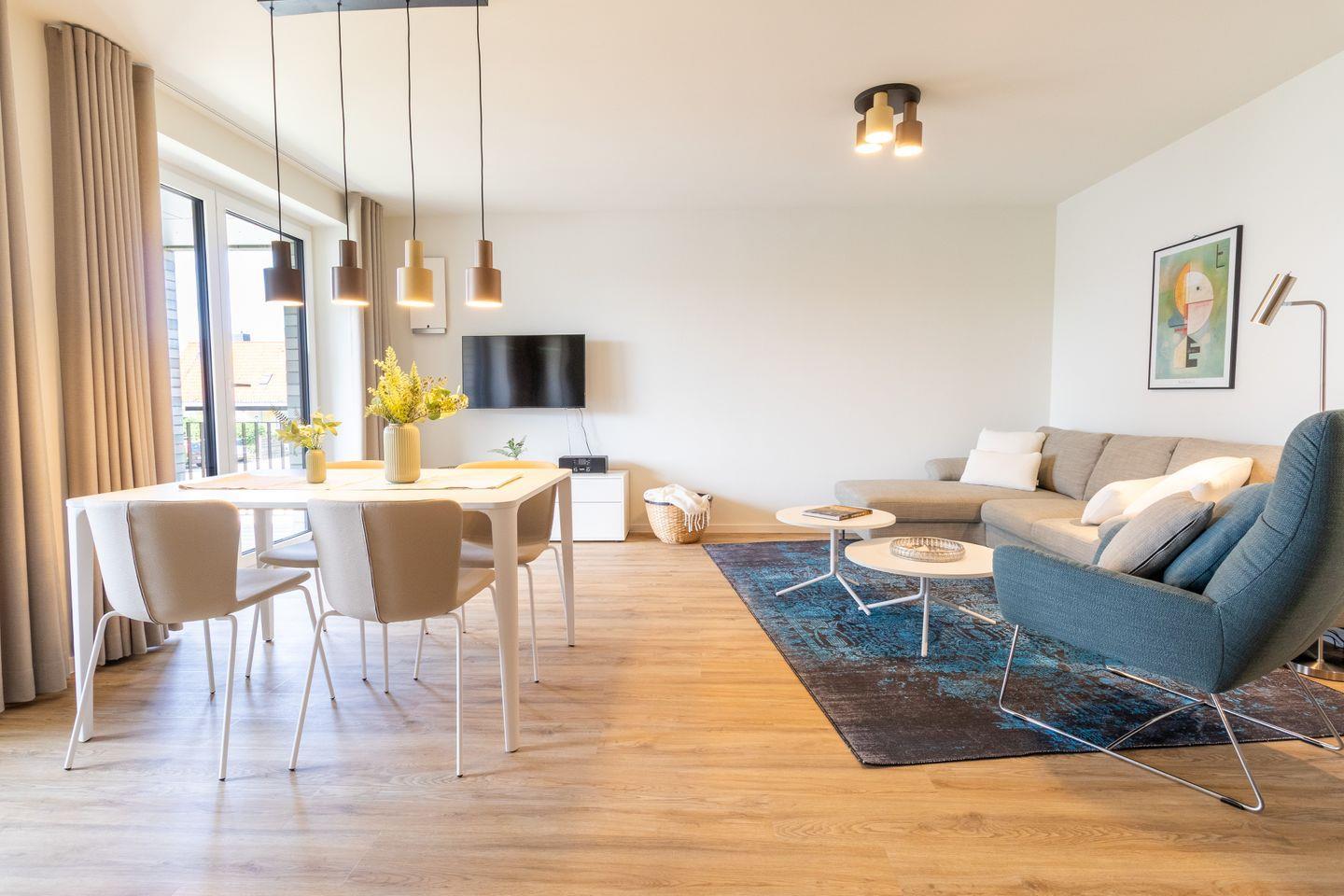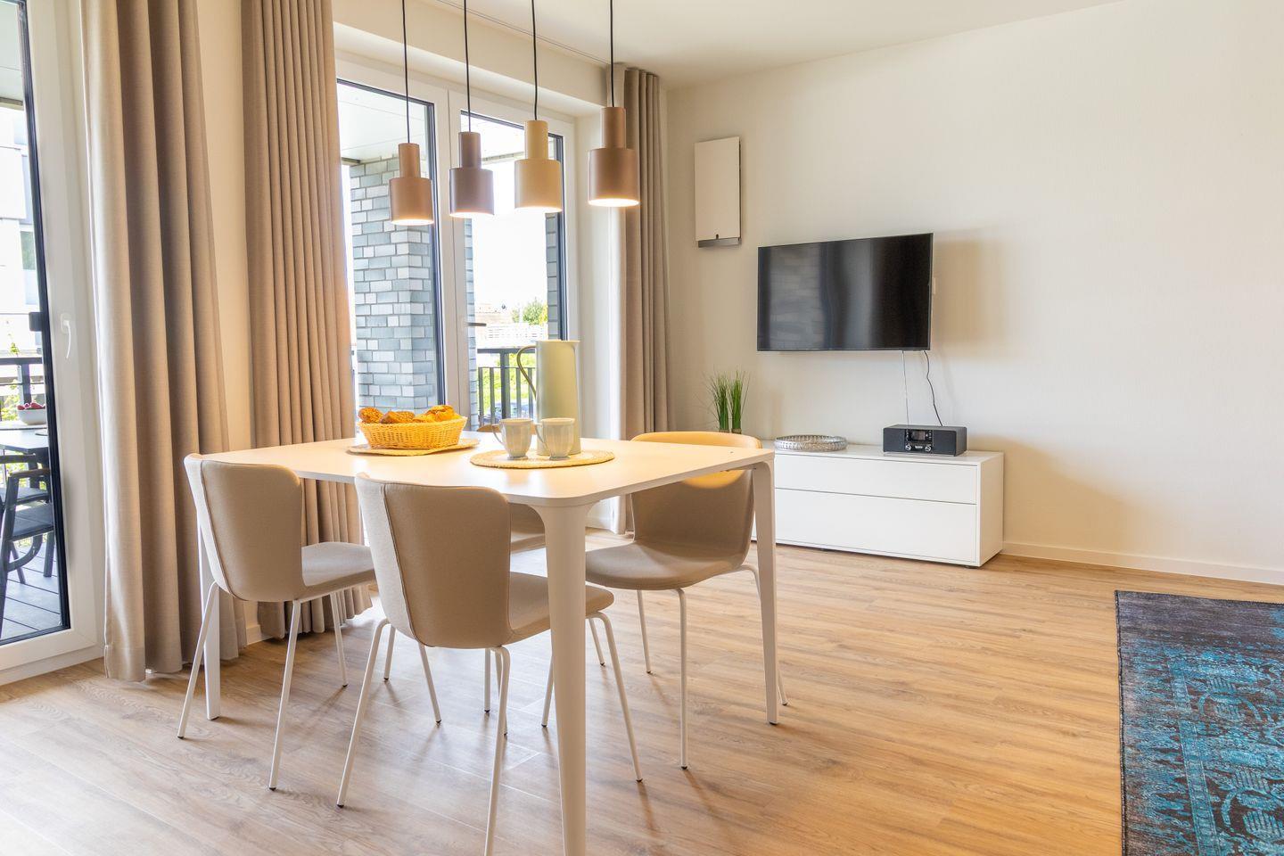 Der helle Wohnbereich mit bodentiefen Fenstern schafft ein luftiges Raumgefühl und bietet Zugang zur überdachten Loggia. Hier genießt du die frische Ostseeluft, egal ob beim Frühstück oder beim entspannten Tagesausklang. Die Fußbodenheizung sorgt für wohlige Wärme, die Wohnraumlüftung für stets frische Luft. Eine Waschmaschine und ein Trockner stehen ebenfalls zur Verfügung – besonders praktisch für Familien.
