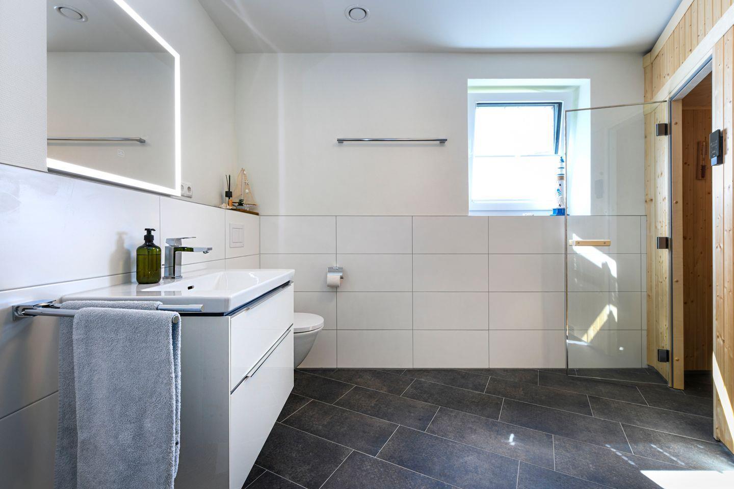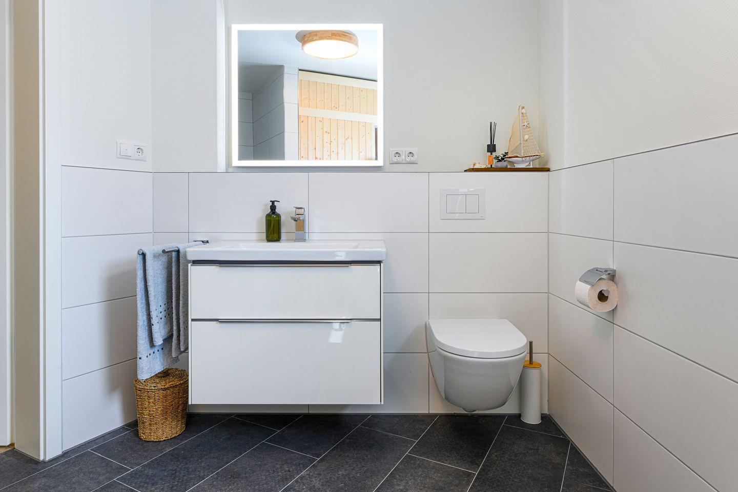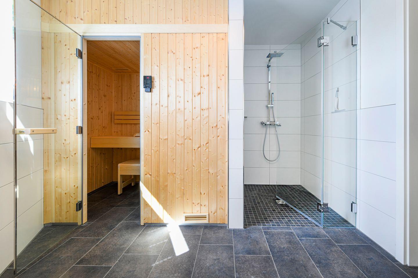 Dein persönlicher Rückzugsort: Das moderne Badezimmer verfügt über eine ebenerdige Dusche mit Regenduschkopf und eine private Sauna – ideal, um Körper und Geist zu entspannen, besonders nach einem langen Strandtag oder einer Radtour.