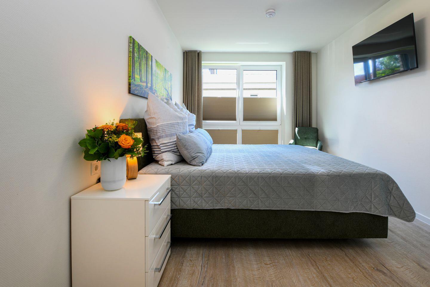 Das gemütliche Schlafzimmer ist mit einem bequemen Doppelbett und einem Smart-TV ausgestattet – perfekt zum Entspannen. Verdunkelungsplissees und Vorhänge sorgen für angenehme Dunkelheit und erholsame Nächte. Das ruhige Design schafft eine behagliche Atmosphäre, in der du dich sofort wohlfühlst. Für einen zusätzlichen Gast steht ein komfortables Schlafsofa bereit. (Liegefläche: 2,00 m x 1,40 m)