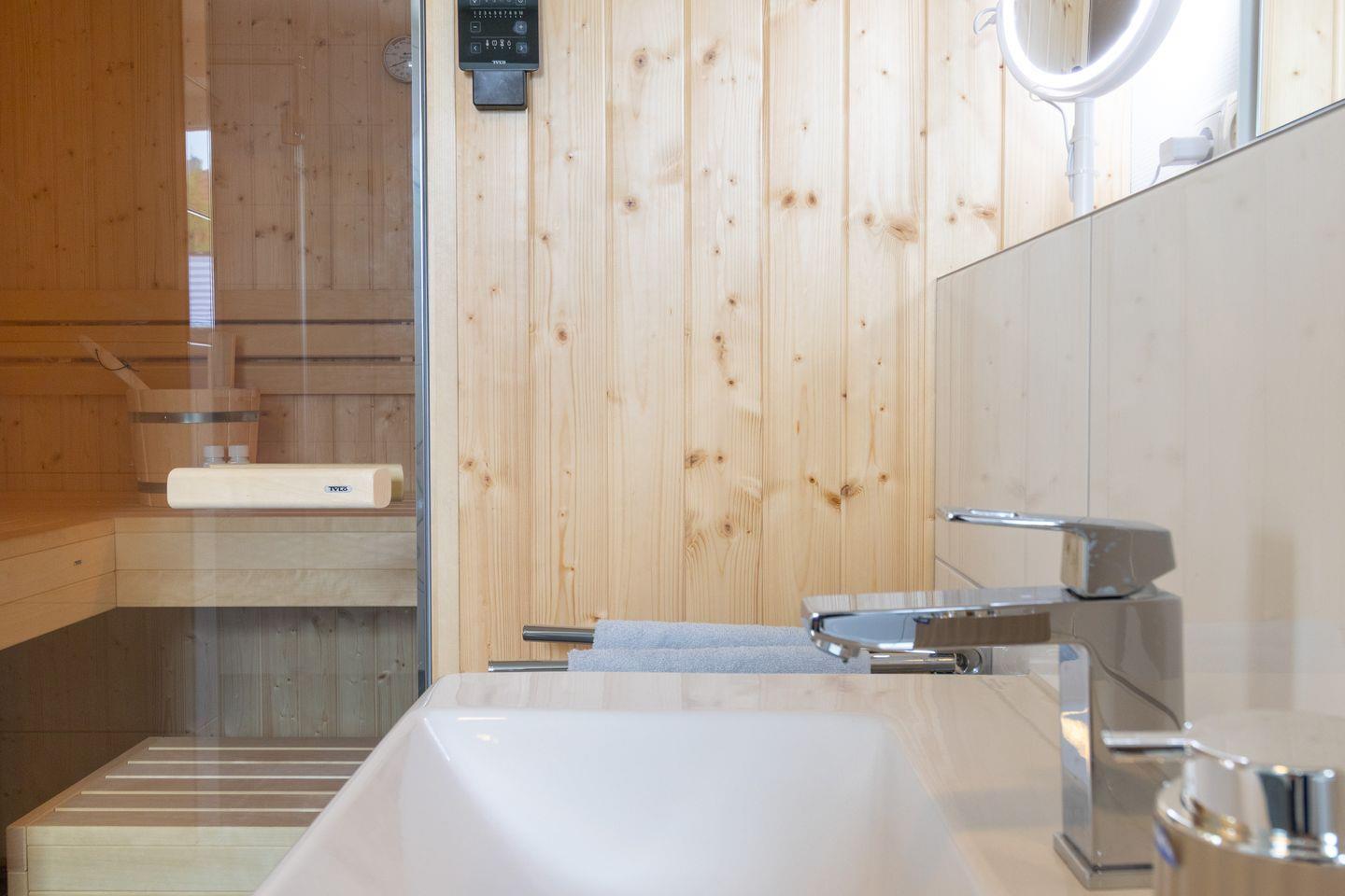 Deine private Sauna lädt zum Entspannen ein – ob nach einem Strandspaziergang oder an kühleren Tagen. Das Badezimmer ist mit bodengleicher Dusche und WC ausgestattet. Ein zusätzliches Gäste-WC erhöht den Komfort bei voller Belegung.