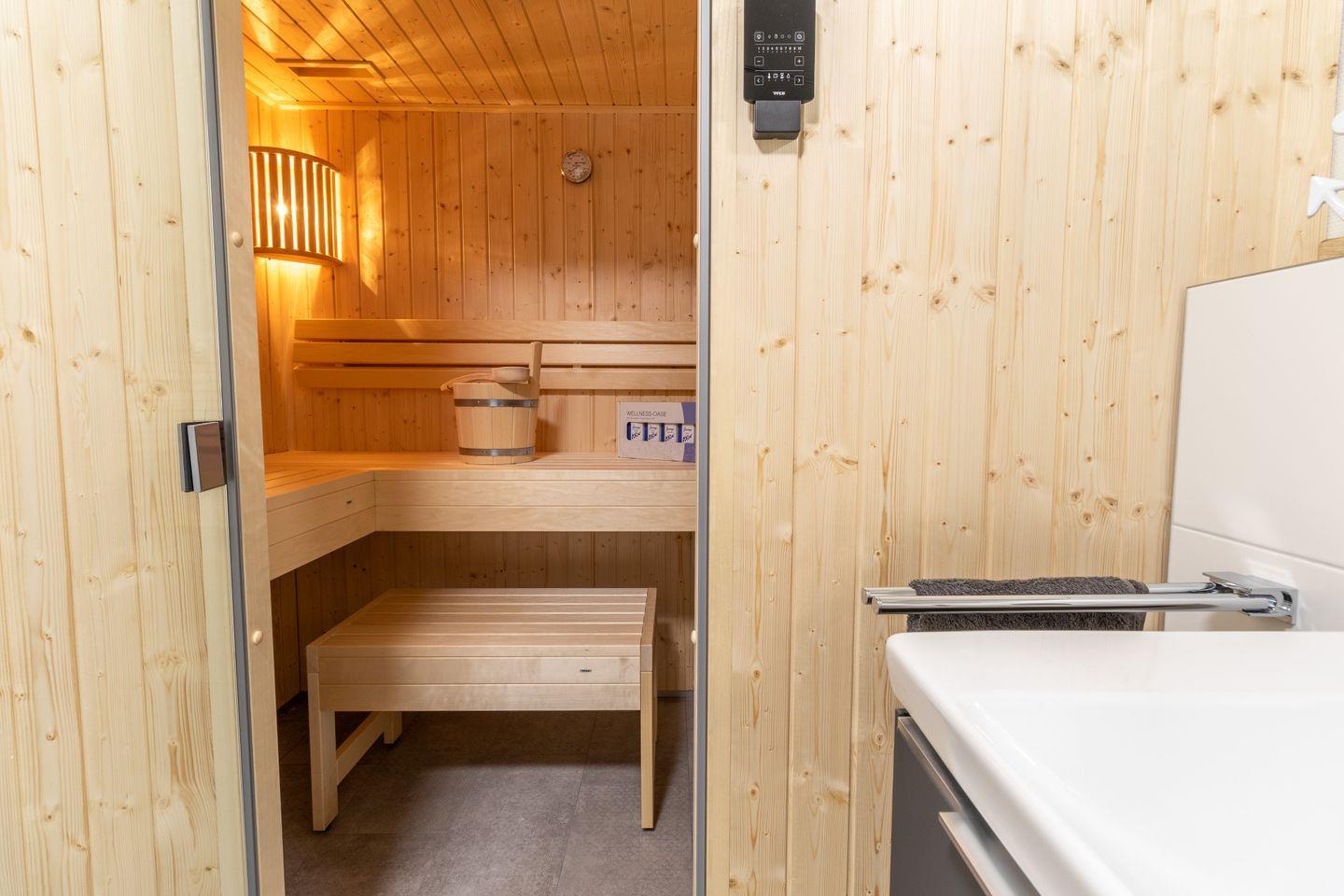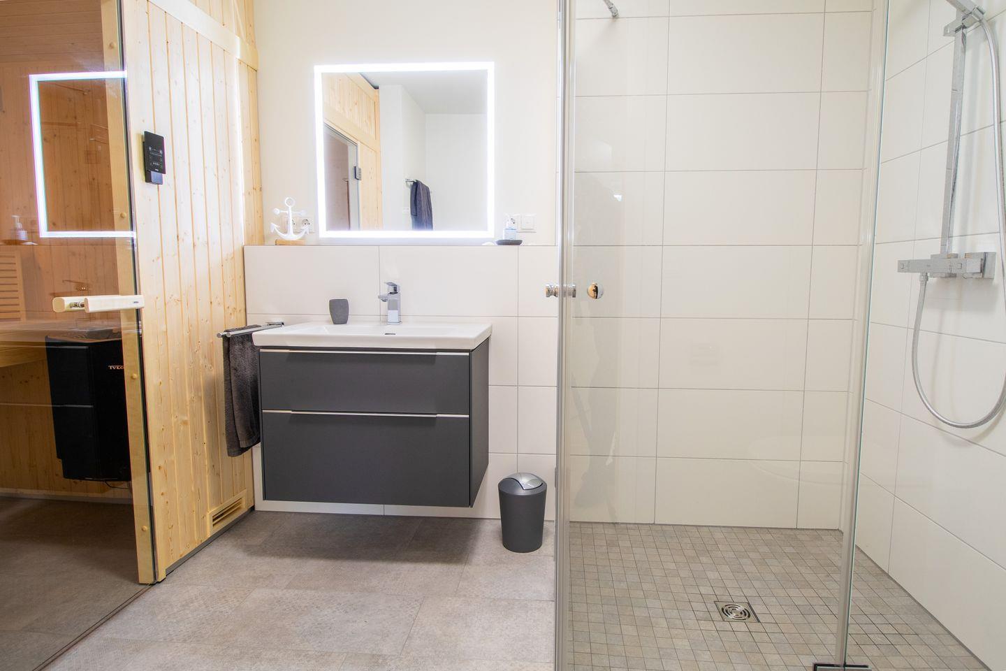 Dein modernes Bad mit bodentiefer Dusche empfängt dich mit Tageslicht und stilvollem Design. Für deine persönliche Entspannung sorgt die integrierte Sauna – ideal nach einem langen Spaziergang am Meer.