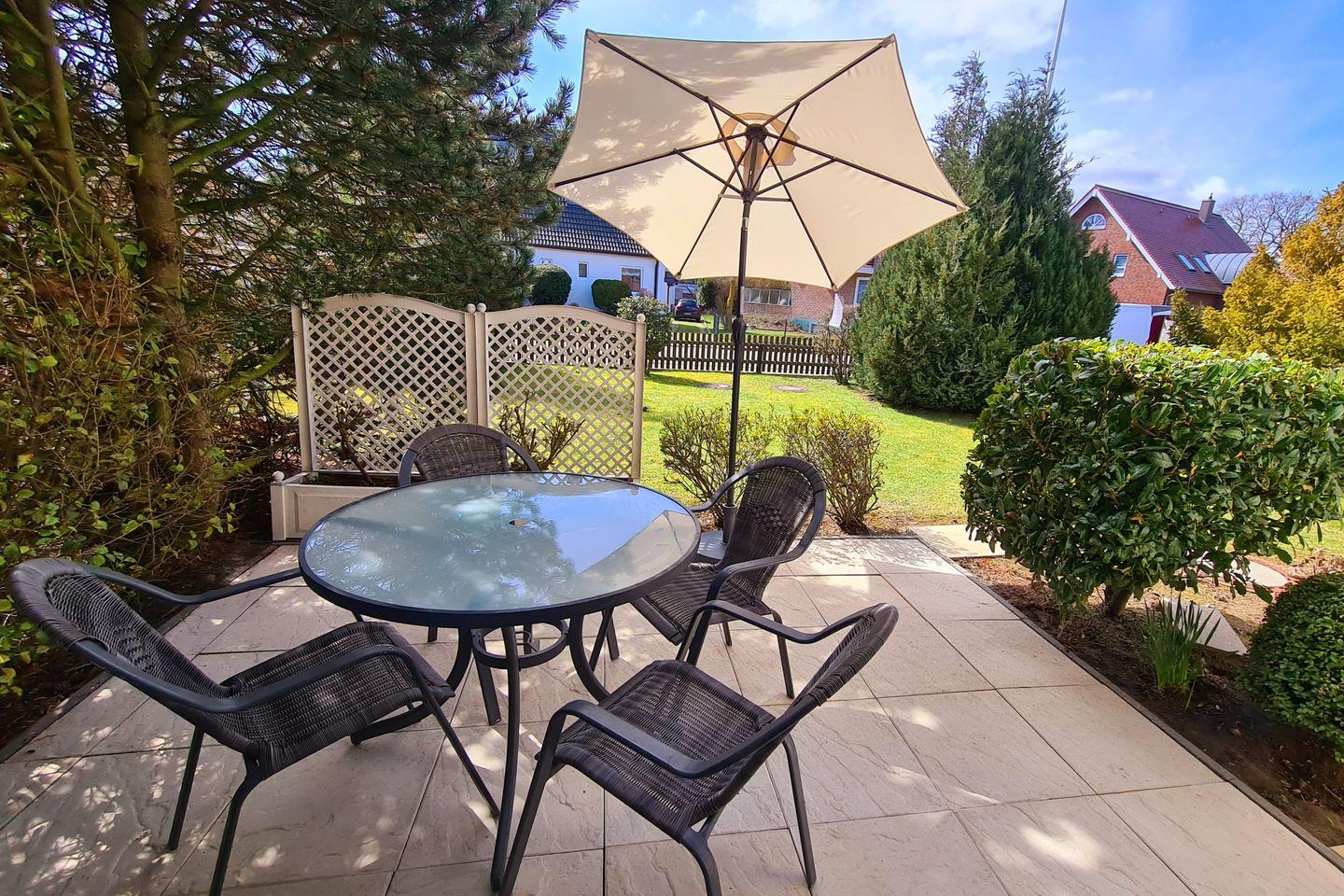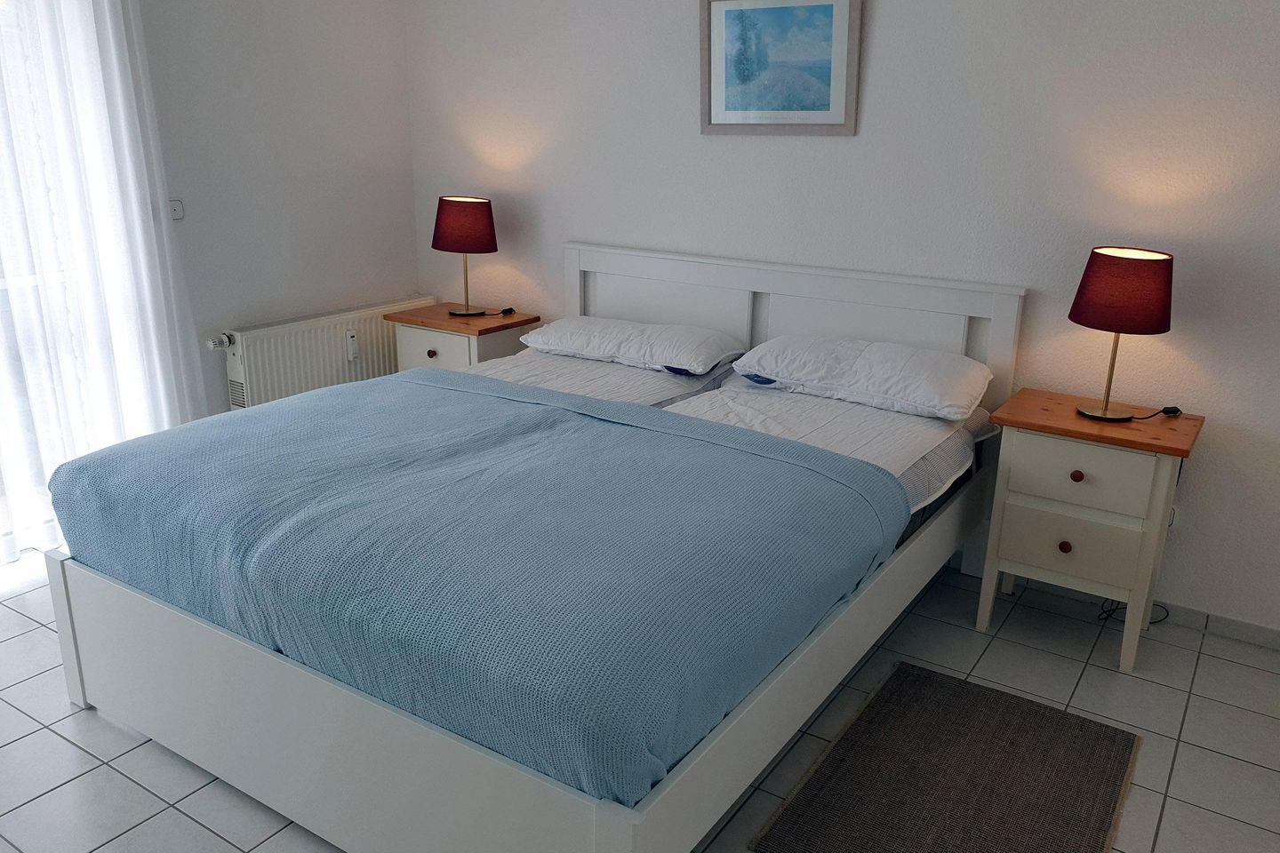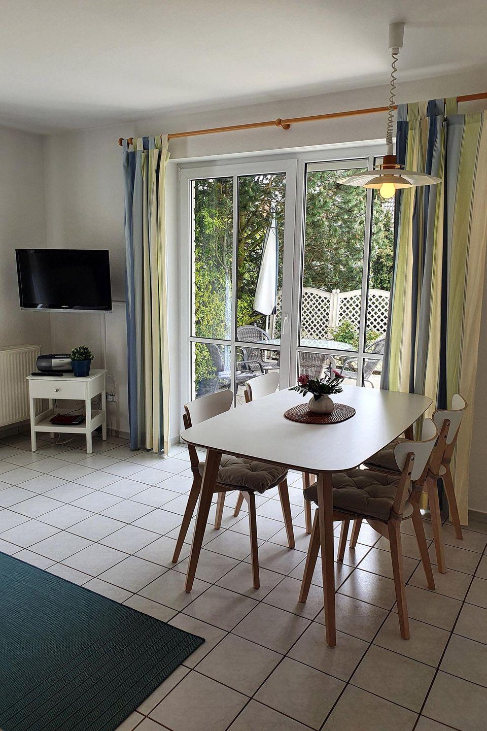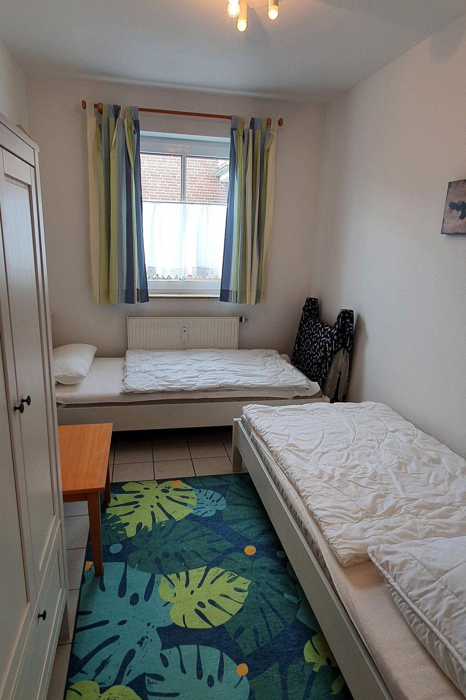 Gemütliche Erdgeschosswohnung mit 63qm für 4 Personen, großer Fensterfront im Wohnbereich für viel Licht, separate voll ausgestattete Küche, zwei Schlafzimmer (Doppelbett und 2 Einzelbetten), Kinderhochstuhl und Reisebett auf Anfrage, helles Duschbad mit Waschmaschine, sonnige Terrasse in Richtung Süd-Westen, Strand in weniger als 2 Minuten zu Fuß erreichbar, Haustiere auf Anfrage und gegen Aufpreis erlaubt, Fahrradabstellraum vorhanden, Wäschepaket gegen Gebühr buchbar.