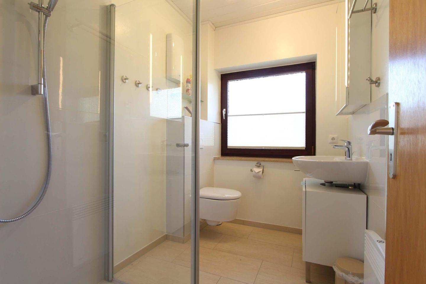 Das Badezimmer ist mit einer bodengleichen Dusche, Waschbecken und WC ausgestattet. Ein Fenster sorgt für angenehme Beleuchtung und Belüftung. Rauchmelder und Staubsauger sind ebenso Teil der Ausstattung wie ein Bügelbrett.