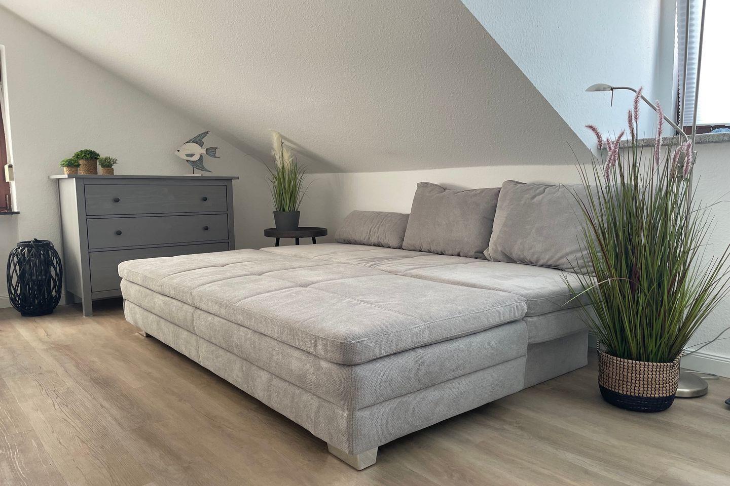 Das neue Schlafsofa im Wohnzimmer verfügt über eine großzügige Liegefläche von 2,00 m x 1,52 m und bietet eine weitere komfortable Schlafmöglichkeit. Zwei zusätzliche Stühle ergänzen den Essbereich. Im Bettkasten des Sofas befinden sich zwei Kissen, zwei Bettdecken sowie passende Matratzenschoner. Auch die Ausstattung mit Geschirr, Besteck und Gläsern wurde für Ihren Komfort erweitert. In Kürze ergänzt eine zusätzliche Kommode das Mobiliar.