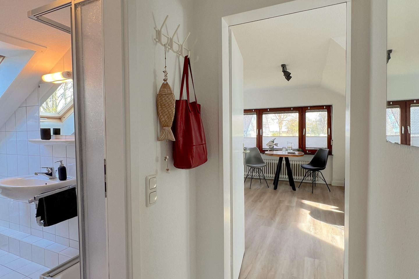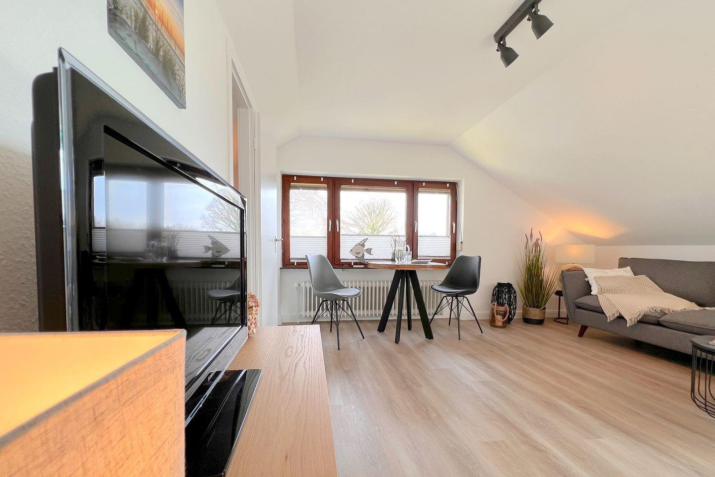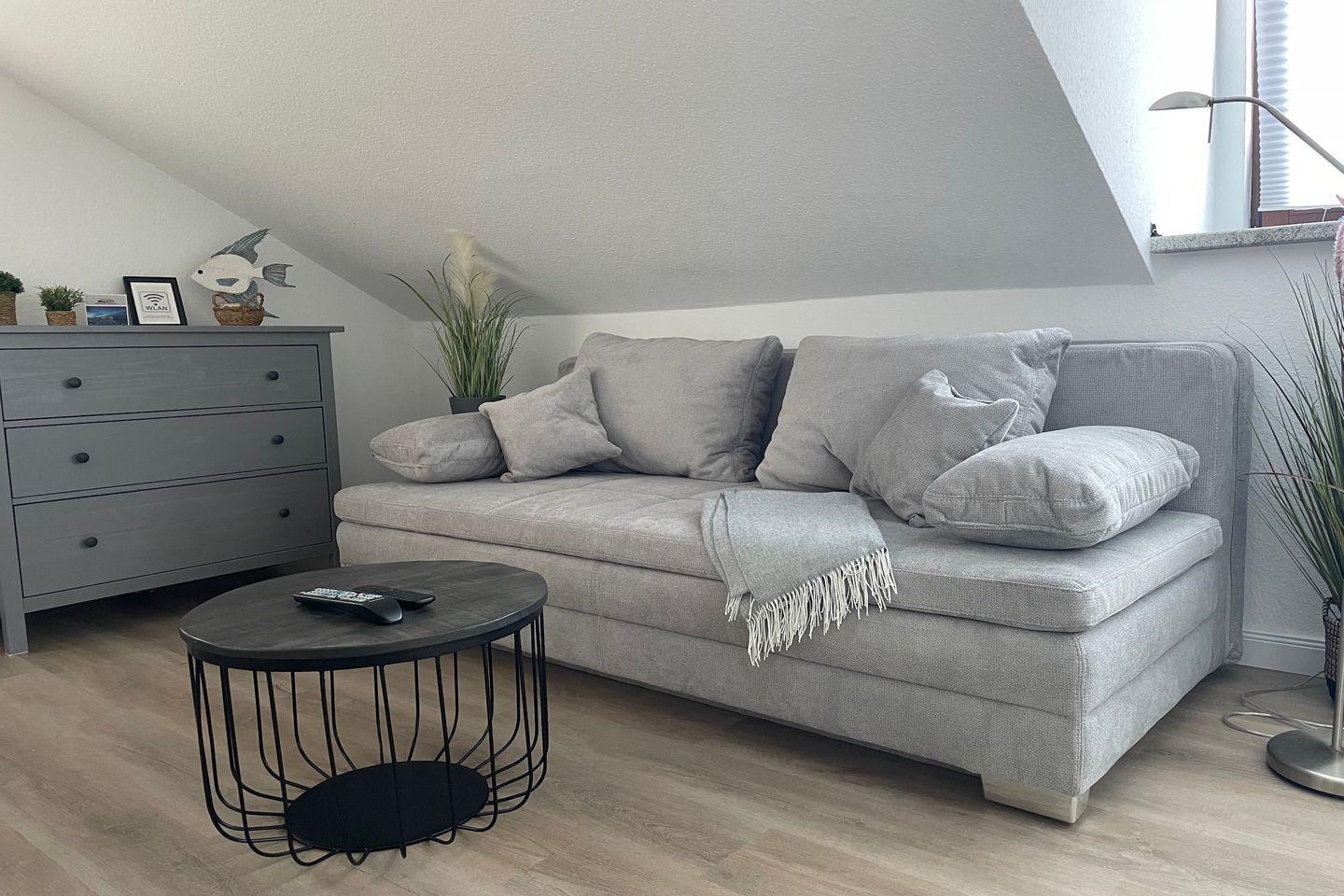 Die Wohnung Nr. 3 im Obergeschoss bietet auf ca. 40 m² ausreichend Platz für einen erholsamen Urlaub an der Ostsee. Der Wohnbereich ist offen gestaltet und mit einem gemütlichen Sofa, einem Esstisch sowie einer gut ausgestatteten Küchenzeile komfortabel eingerichtet.