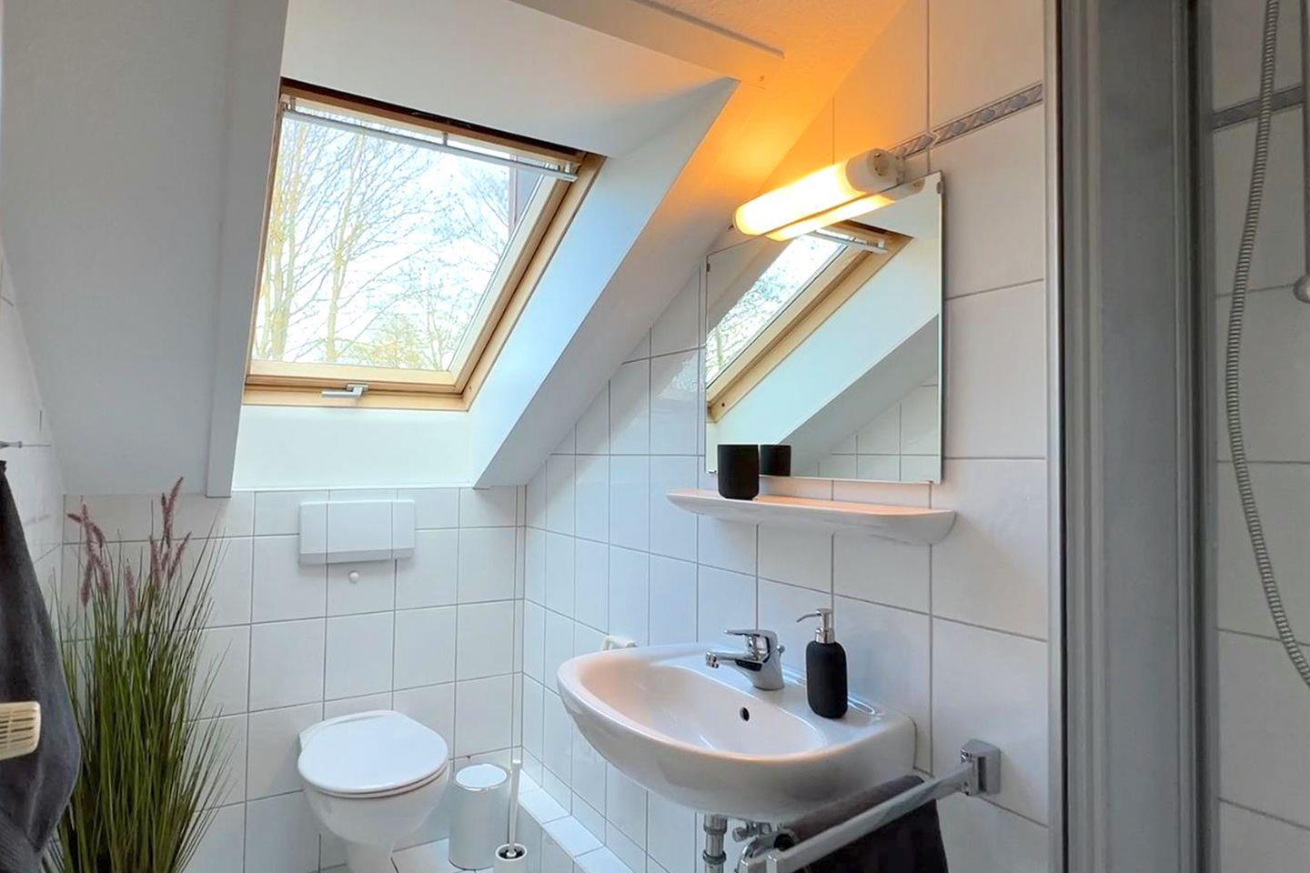 Das Tageslichtbad ist hell, modern gefliest und verfügt über eine Duschkabine sowie ein großes Fenster.