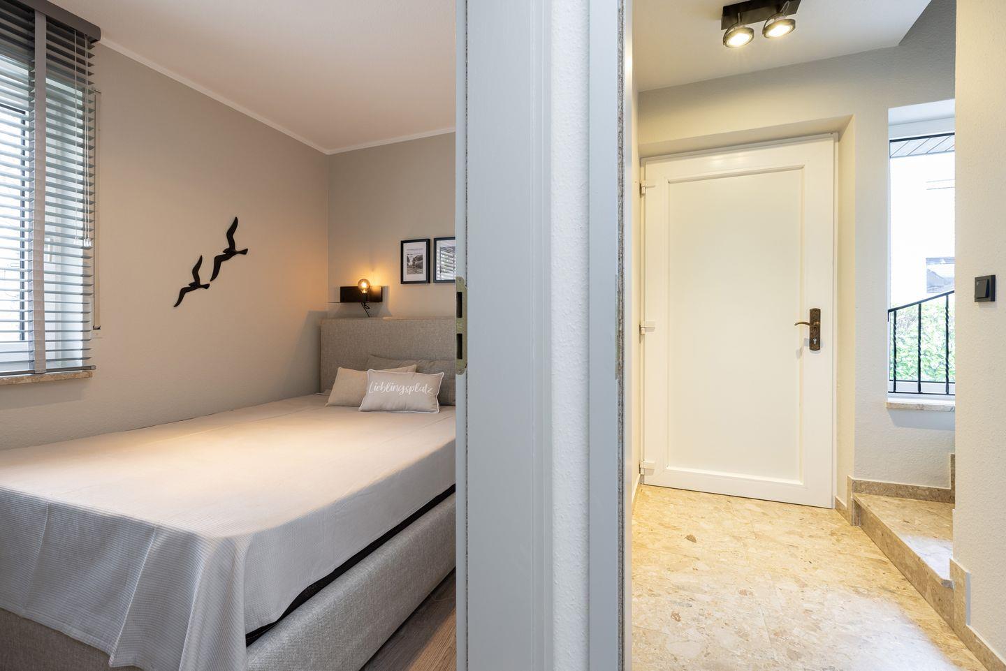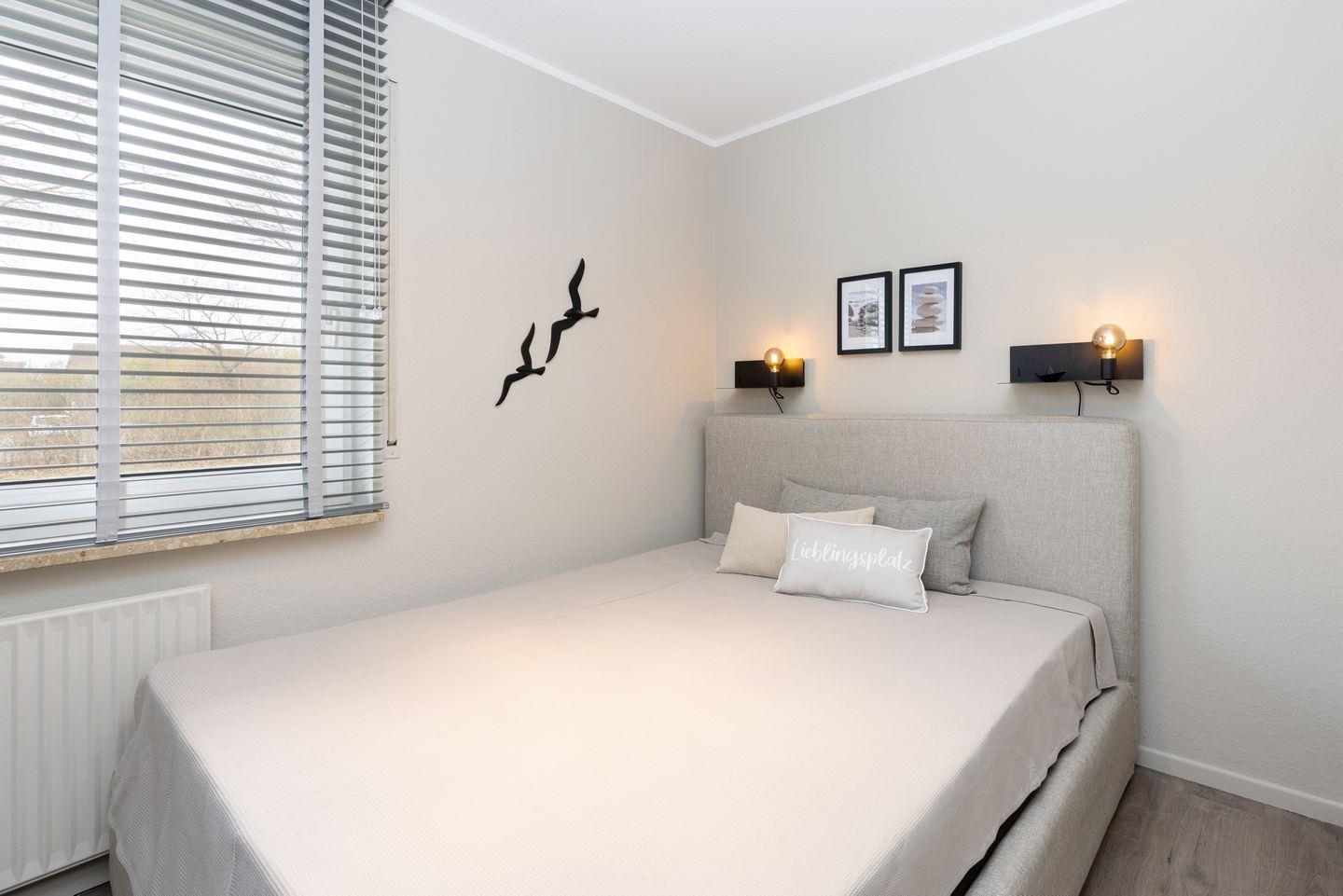 Ein separates Schlafzimmer ist mit einem Doppelbett (durchgängige Matratze 1,60x2,00m) ausgestattet. Für die ganz kleinen Gäste gibt es auf Anfrage ein Kinder-Reisebett und einen Hochstuhl.