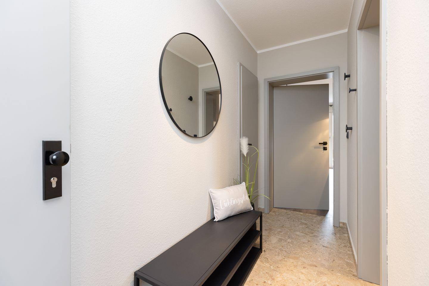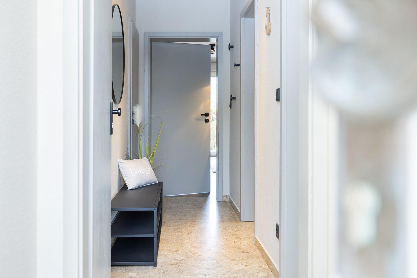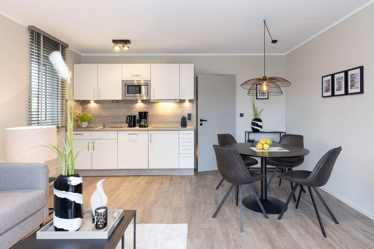 Die Wohnung 1 liegt im Erdgeschoss und ist ca. 45 qm groß. Der Wohnbereich ist offen und hell gestaltet durch eine schöne Fensterfront zum Garten. Integriert im Wohnbereich sind der Essbereich und die Küchenzeile mit Geschirrspülmaschine und Mikrowelle.