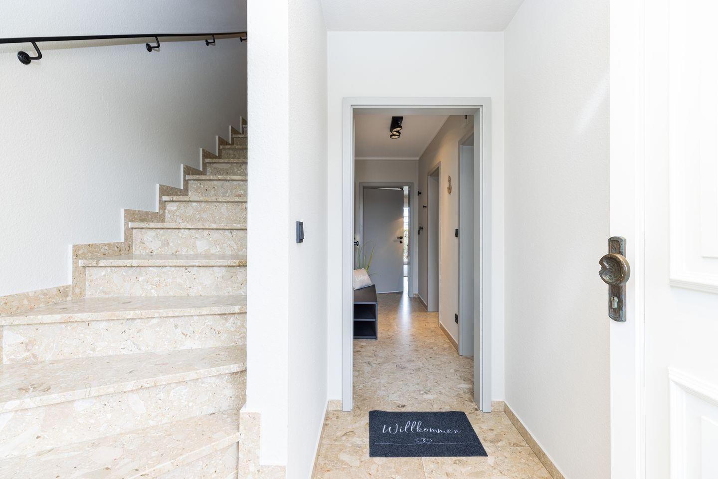 Das Badezimmer ist mit Duschkabine und hellen Fliesen gestaltet. Die sonnige Terrasse der Wohnung ist nach Süd-Westen ausgerichtet und zusätzlich ist der Garten gemeinschaftlich zu nutzen.