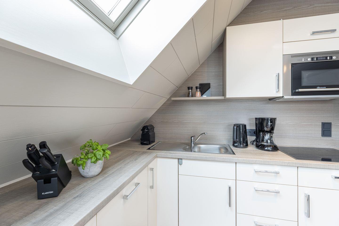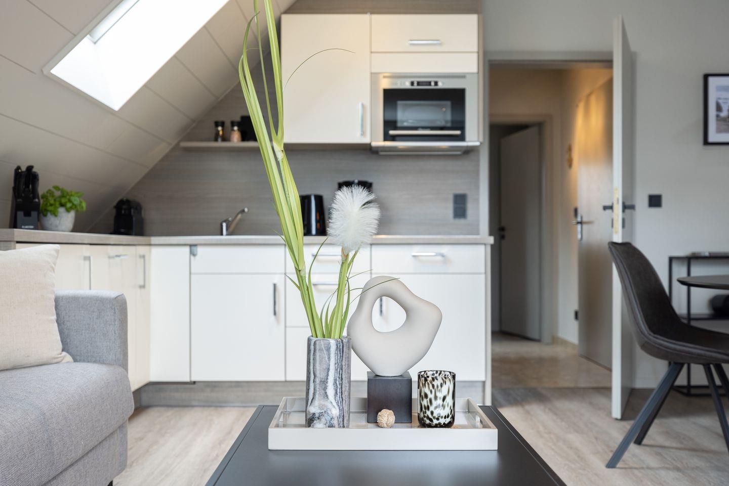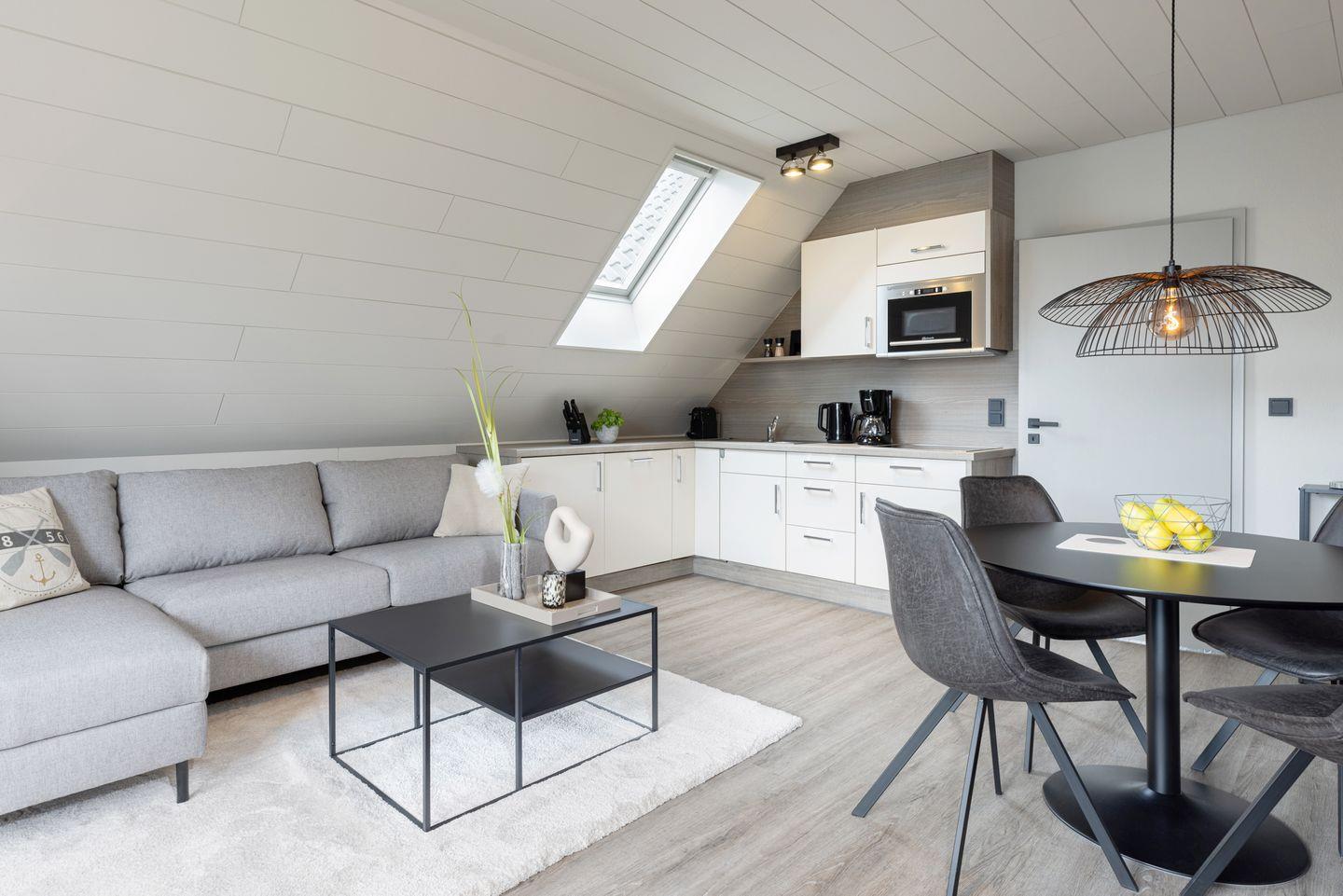 Die Wohnung 6 liegt im Obergeschoss und ist ca. 40 qm groß. Der Wohnbereich ist offen und hell gestaltet durch eine schöne Fensterfront zum Balkon. Integriert im Wohnbereich sind der Essbereich und die Küchenzeile mit Geschirrspülmaschine und Mikrowelle.