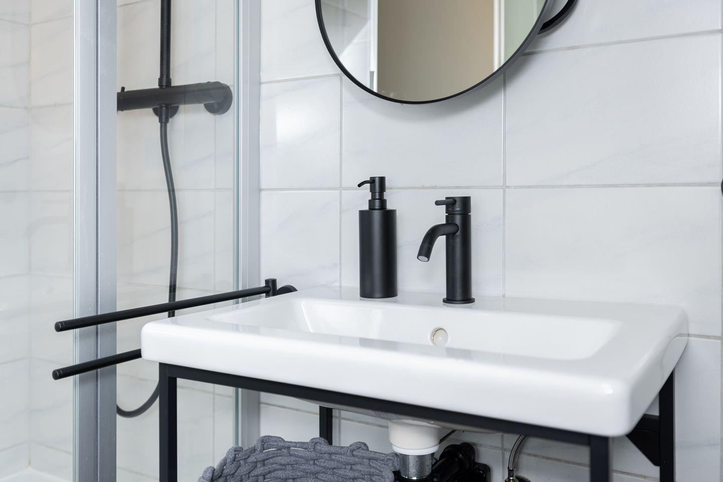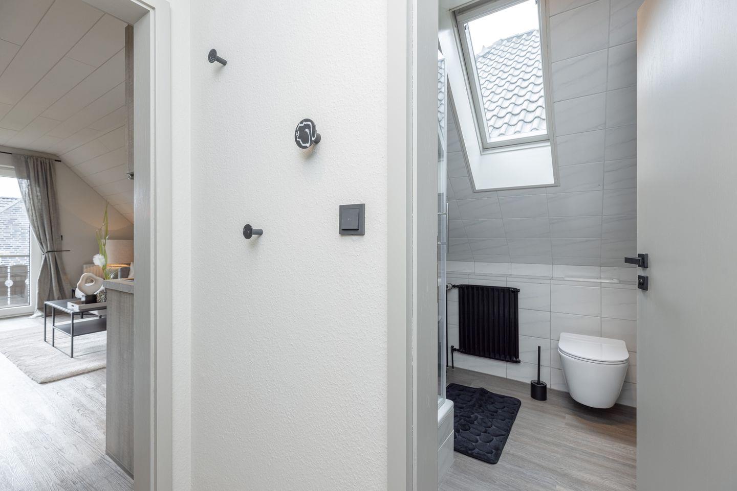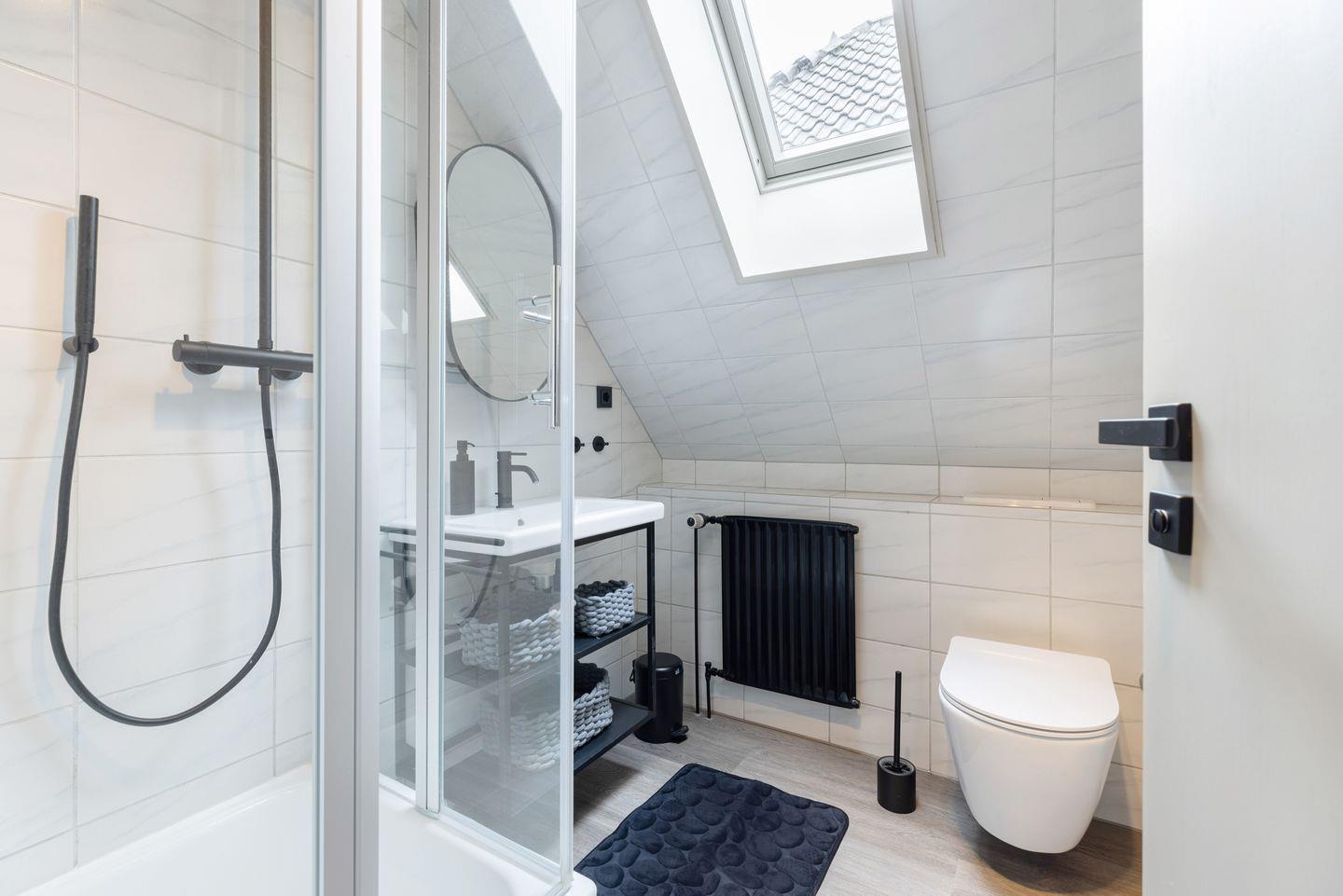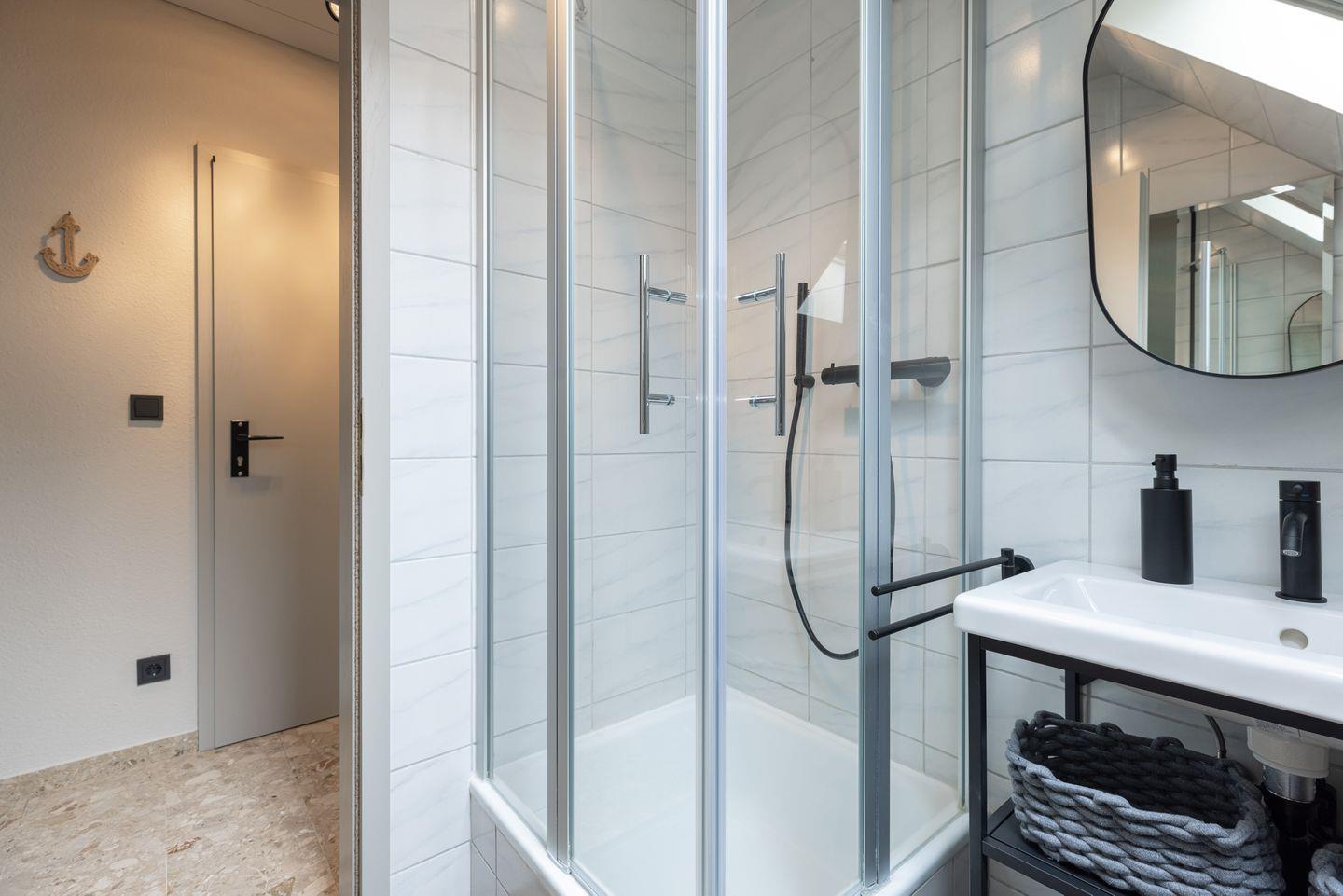 Das Badezimmer ist mit Duschkabine und hellen Fliesen gestaltet.