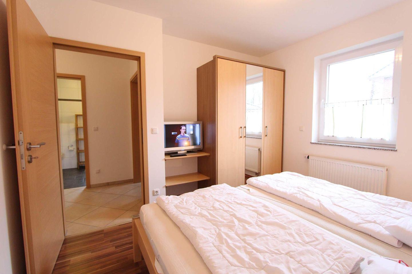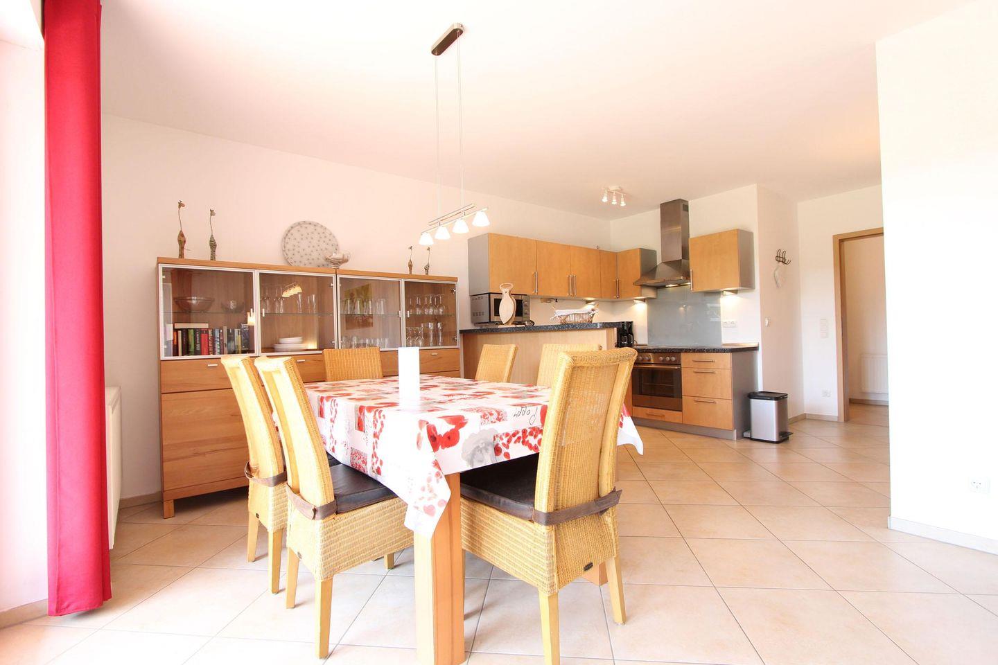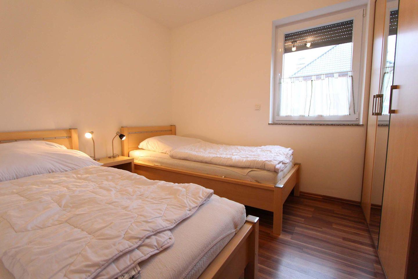 Diese sonnige und freundliche Erdgeschosswohnung ist mit ca. 71 qm bestens ausgestattet für 4 Personen. Die Nichtraucherwohnung besteht aus einem großen Wohnbereich, zwei separaten Schlafräumen und einem modernen Badezimmer. In dem lichtdurchfluteten Wohnbereich integriert befindet sich auch die vollwertig ausgestattete Küchenzeile. Mit Mikrowelle, Geschirrspülmaschine, Gefriereinheit im Kühlschrank, Backofen und Kaffeemaschine und Co. bleiben hier keine Wünsche offen. Der Wohnbereich ist geteilt in eine gemütliche Couchecke und den Essbereich. Beide Bereiche sind mit charmanten Accessoires bis ins Detail durchdacht. Das erste Schlafzimmer ist mit einem Doppelbett (2 Matratzen á 0,90x2,00m), einem Kleiderschrank und einem zusätzlichen Fernseher ausgestattet, das zweite ist hingegen mit zwei Einzelbetten (Matratzen á 0,90x2,00m) und einem Kleiderschrank. Für die ganz kleinen Gäste gibt es ein Kinder-Reisebett mit Matratze.