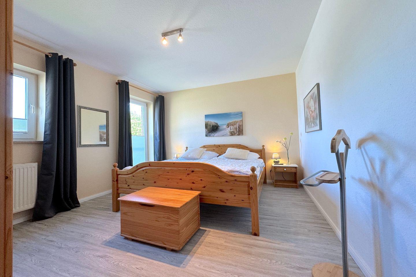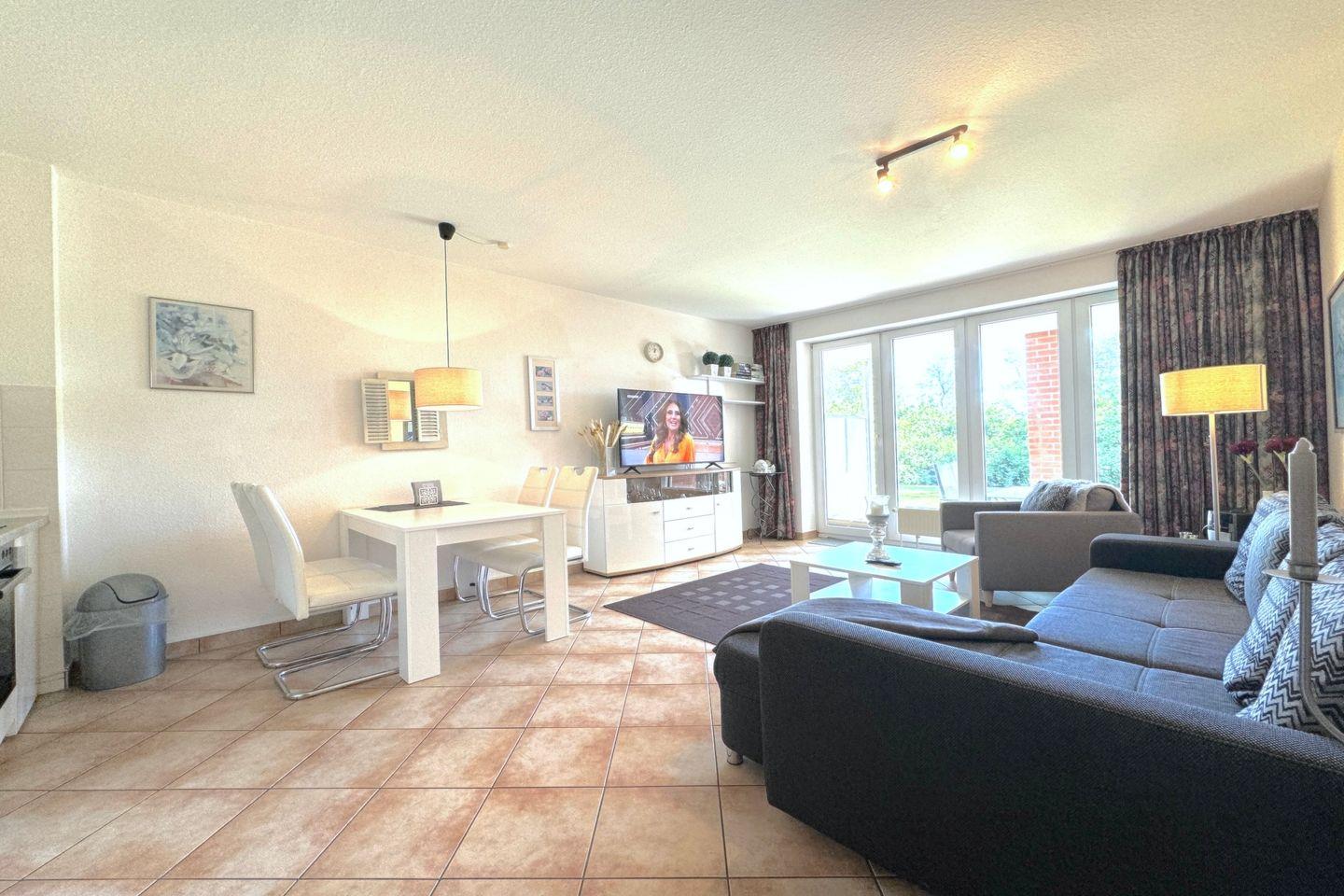 Diese ca. 50 qm große Erdgeschosswohnung ist direkt hinterm Deich gelegen und somit sehr Strandnah. Der Wohnbereich ist offen und hell durch die große Fensterfront. Mit der Sofaecke, einem Essbereich und der offenen Küche ist hier alles in einem Raum bestens vereint. Das Sofa bietet mit der Schlaffunktion genügend Platz um dort zu zweit zu schlafen. Die Küche ist mit einer Geschirrspülmaschine, einem Backofen, einer Mikrowelle und einem Gefrierfach im Kühlschrank ausgestattet. Das separate Schlafzimmer ist mit einem hochwertigen Doppelbett (2 Matratzen á 0,90x2,00m) und einem großzügigen Kleiderschrank eingerichtet. Das schlichte Badezimmer ist mit Dusche und Fenster einfach aber überaus ausreichend. Die Terrasse der Wohnung ist nach Osten gerichtet und bietet sogar eingeschränkten Meerblick. Mitgebrachte Fahrräder können im Abstellraum untergebracht werden. Die Wohnung ist direkt hinter dem Deich gelegen und so ist man dann auch in Windeseile am Strand. Hierfür braucht man nichtmal eine Minute. Auch dem Urlaub mit dem Haustier steht generell nichts im Wege, denn nach Rücksprache und gegen Aufpreis sind Haustiere gestattet. Sollte das Reisegepäck so gering wie möglich ausfallen, dann ist ein Wäschepaket für den Aufenthalt in Kellenhusen gegen Gebühr einfach buchbar. Im Nachbarhaus stehen auch eine Waschmaschine und ein Trockner gegen Gebühr zur Verfügung.