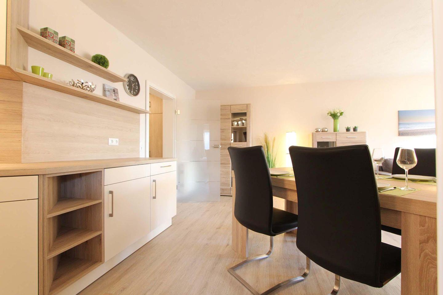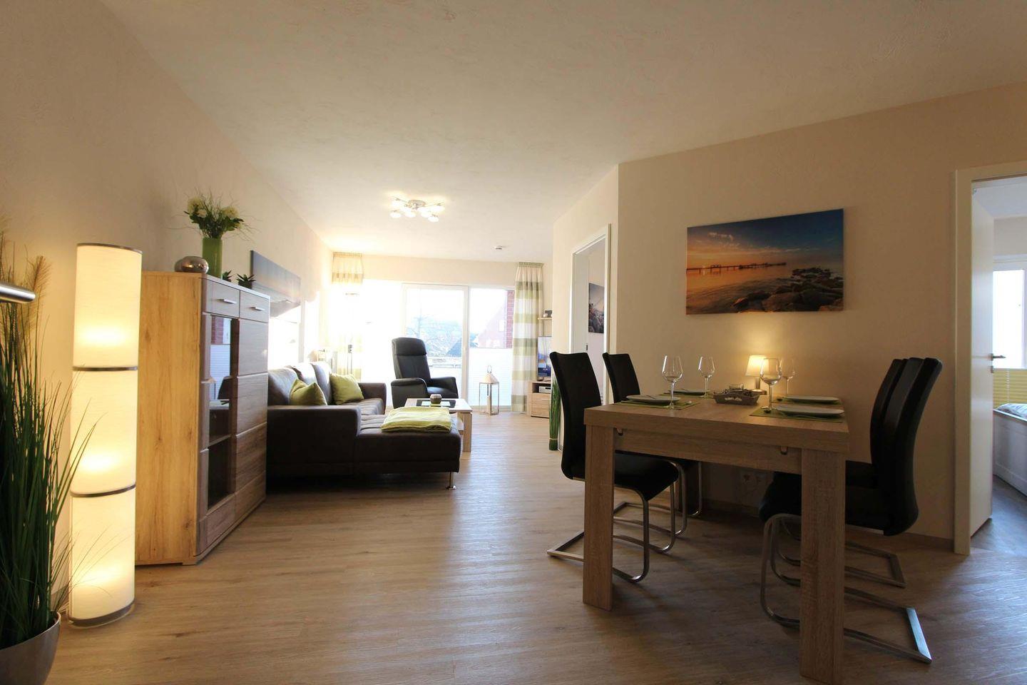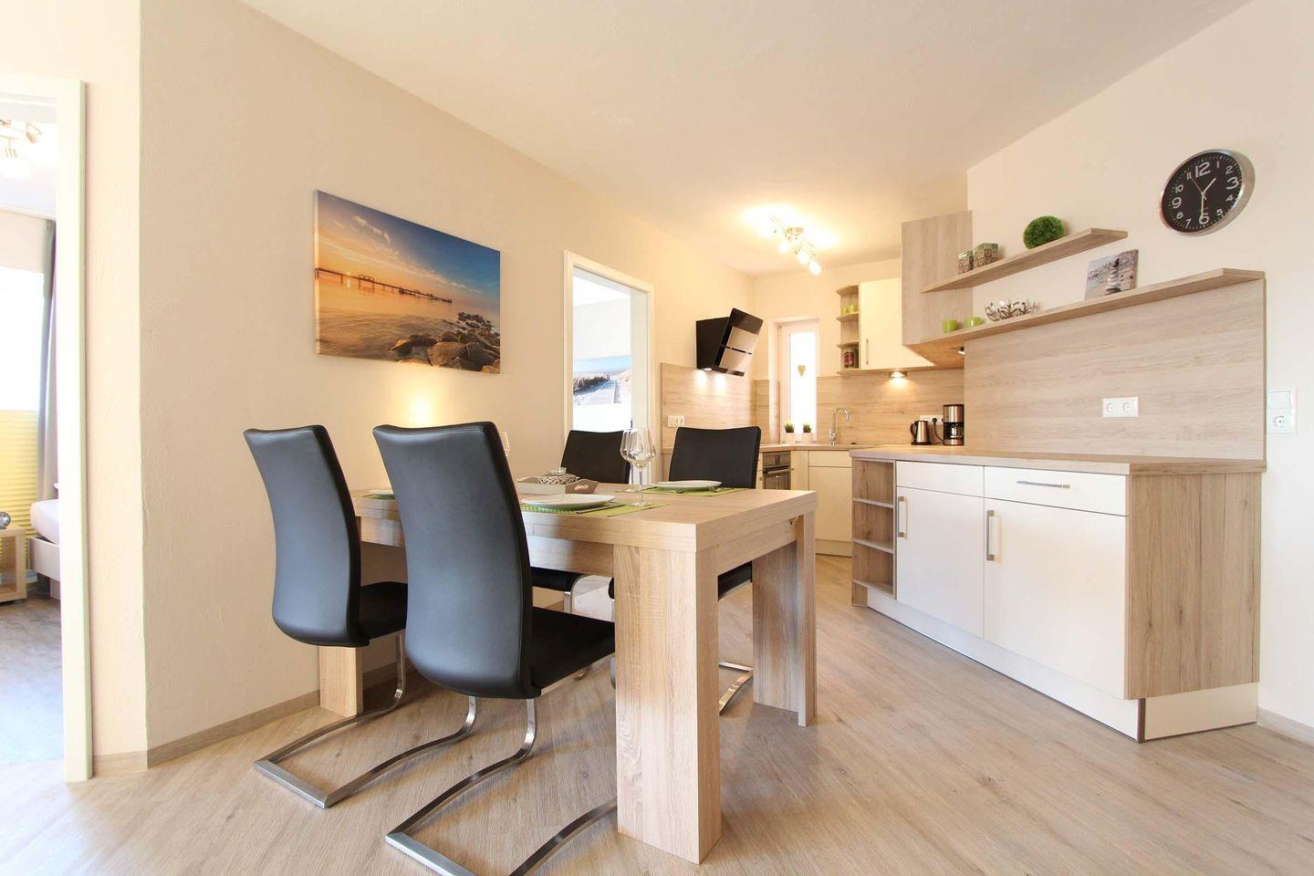Die moderne Wohnung Wohnresidenz Whg. 3 im 1. Stock in Kellenhusen bietet auf 61 m² Platz für bis zu 4 Personen. Sie verfügt über zwei Schlafzimmer, einen offenen Wohn- und Küchenbereich mit umfangreicher Ausstattung, WLAN, zwei TVs sowie einen überdachten Balkon. Ein privater Parkplatz, Waschmaschine und Trockner zur gemeinschaftlichen Nutzung sowie die strandnahe Lage runden das Angebot ab.
