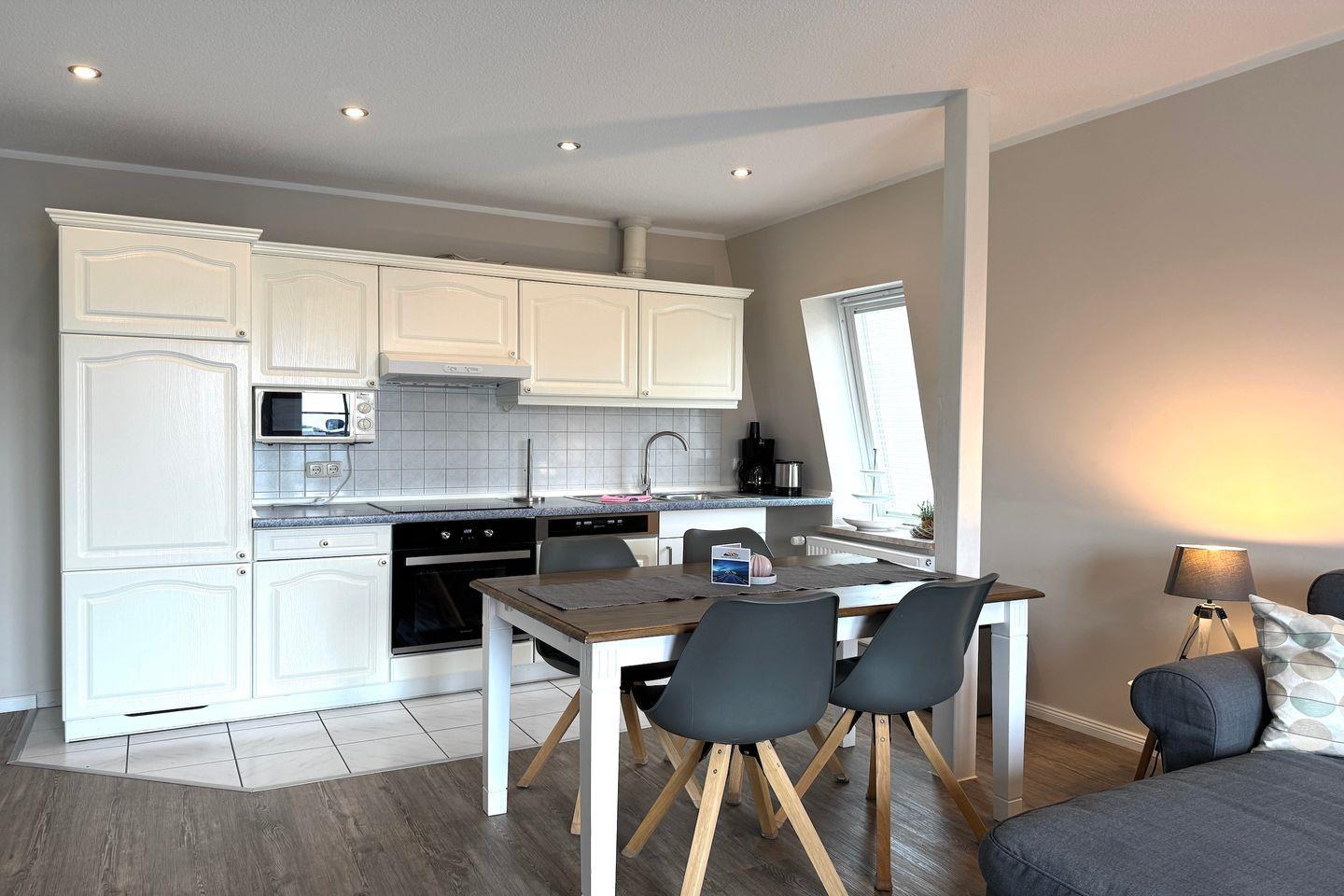 Der offen gestaltete Wohnbereich besticht durch eine gemütliche Sofaecke, einen einladenden Essplatz und die in 2025 neu installierte, moderne Küche. Ausgestattet mit Induktionskochfeld, Backofen, Mikrowelle und Geschirrspüler lässt die Küchenzeile keine Wünsche offen – perfekt für entspannte Kochabende und gesellige Stunden.