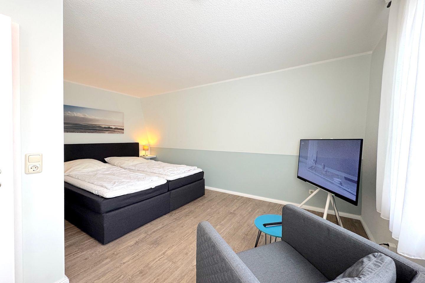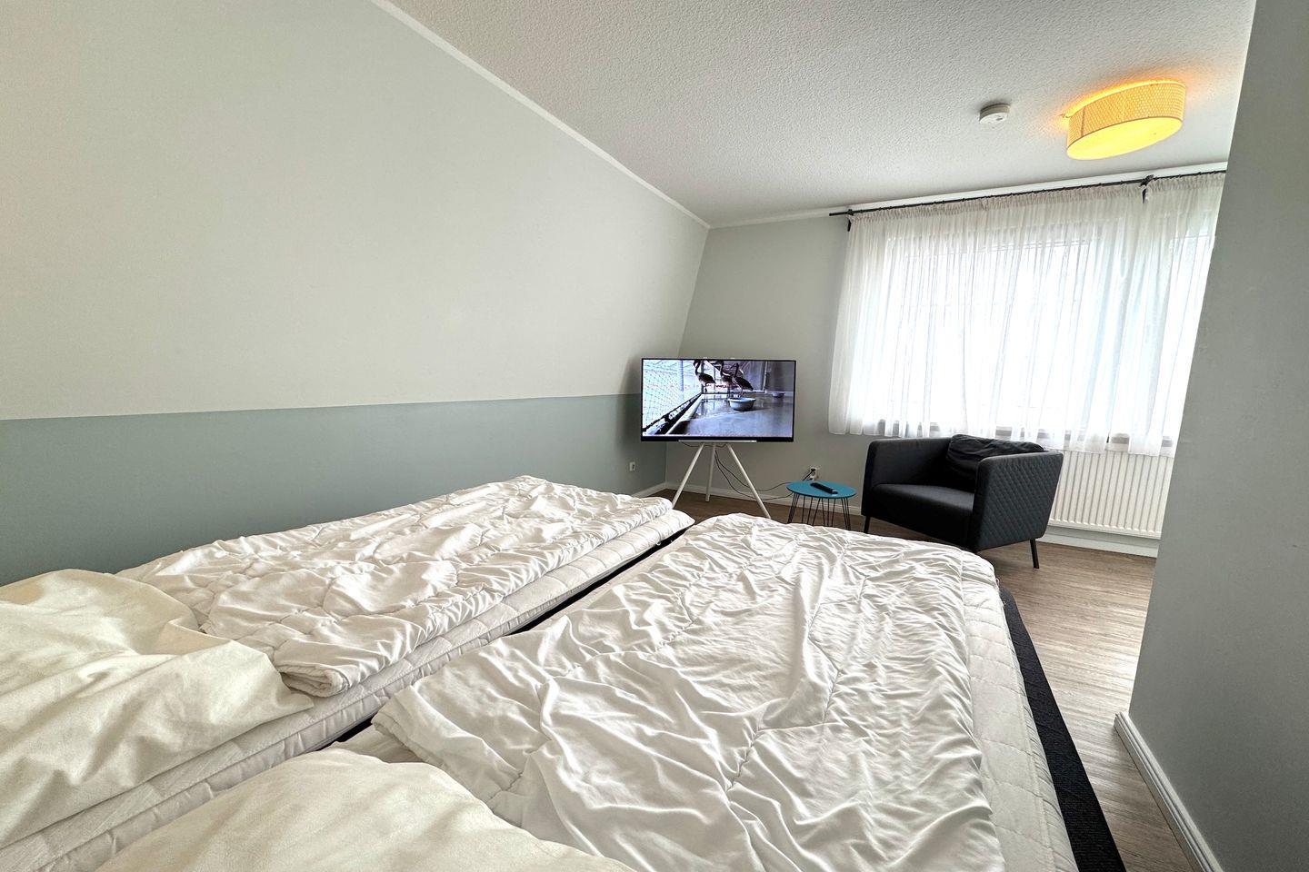 • Das zweite Schlafzimmer verfügt über ein hochwertiges Doppel-Boxspringbett (zwei Matratzen à 90x200 cm) und bietet zusätzlich einen eigenen Fernseher für entspannte Abende.