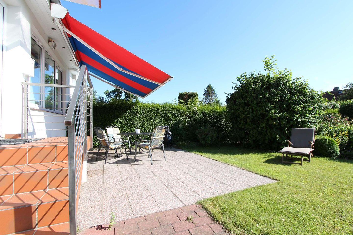Direkt am Haus erwarten Sie eine möblierte Terrasse sowie ein gepflegter Garten mit Sonnenliegen, Gartenmöbeln und Sonnenschirm, ideal für entspannte Stunden im Freien. Ein Grill steht für gesellige Barbecue-Abende bereit. Das abgeschlossene Grundstück sorgt insbesondere für Familien mit Kindern und Hund für zusätzliche Sicherheit.