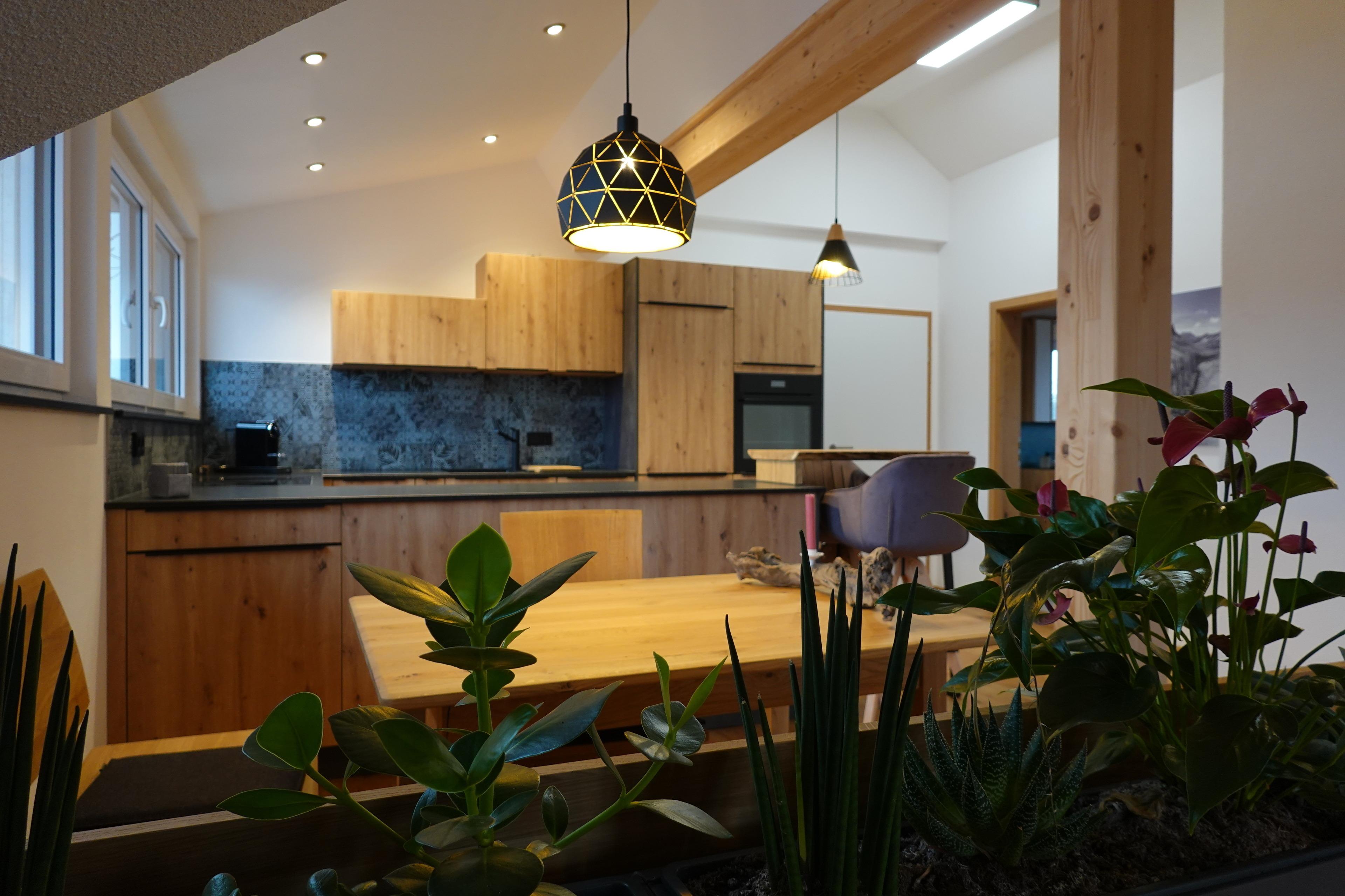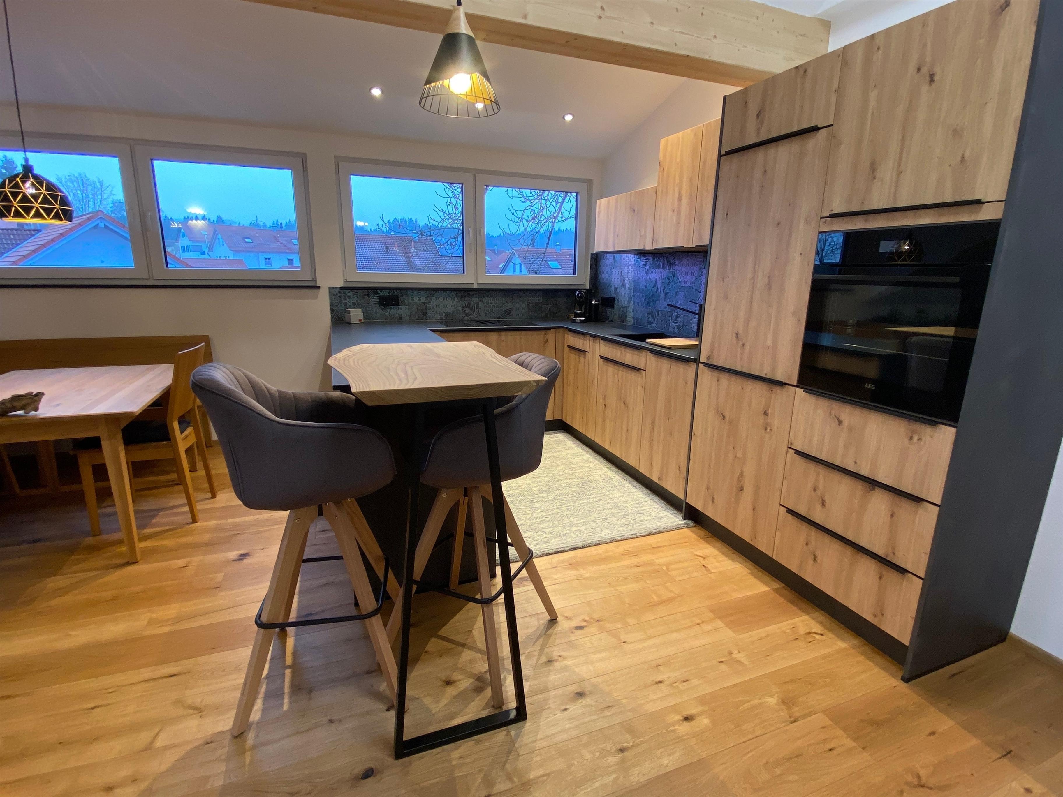 Die Küche ist sehr gut ausgestattet (Milchaufschäumer, Smoothiemaker, Kuchenformen, Auflaufformen und eine Kapselkaffeemaschine sowie weitere Utensilien), an der kleinen Theke können Sie den Tag gemütlich starten.