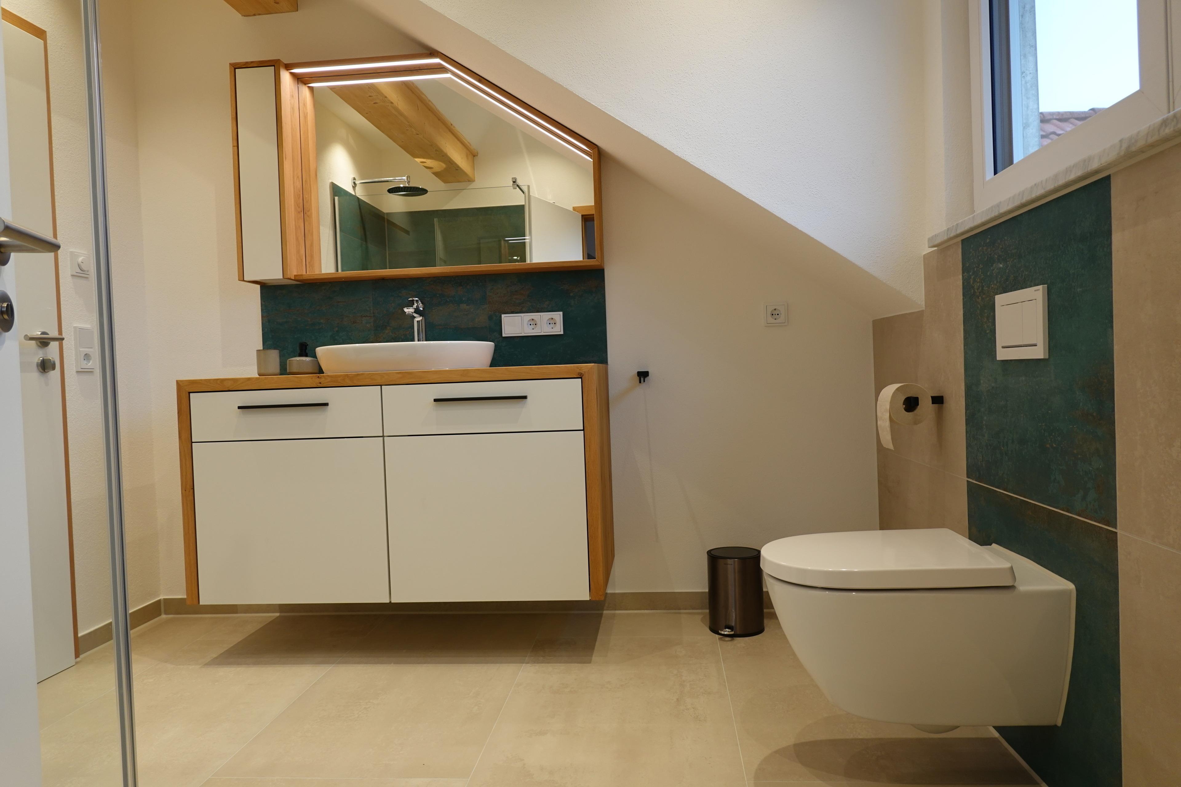 Eine große begehbare Dusche mit Regenbrause erwartet Sie im Badezimmer.