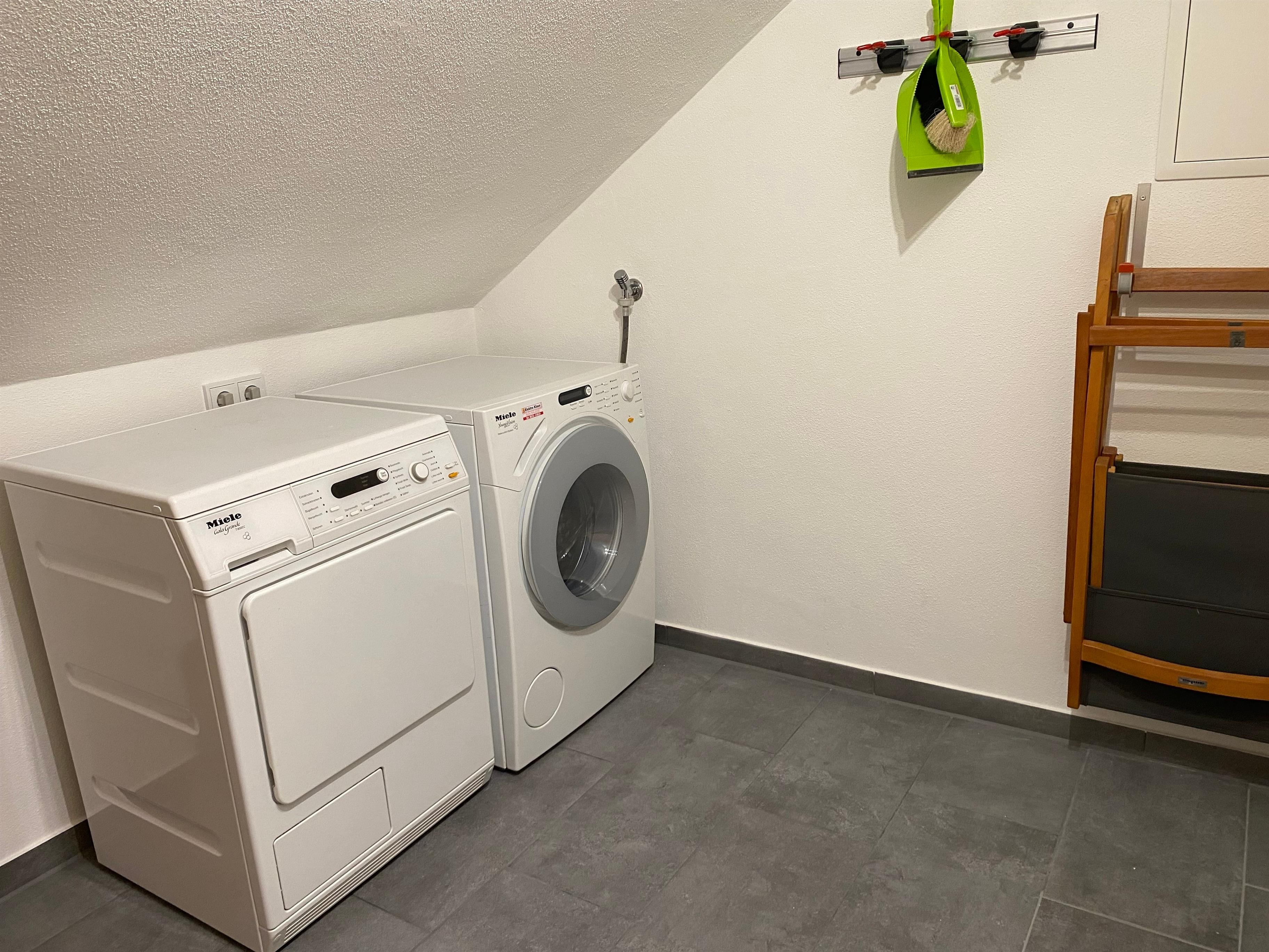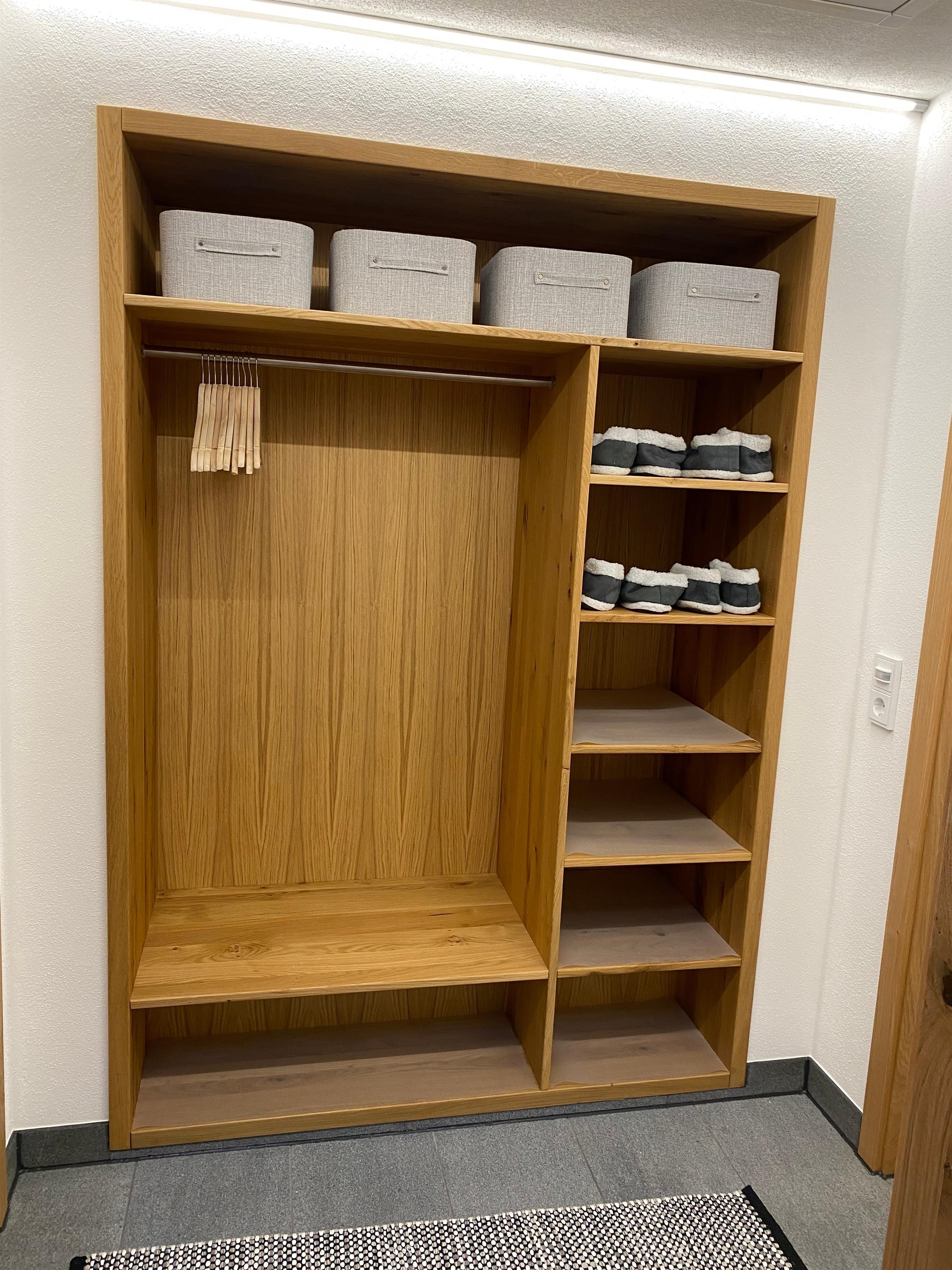 Eine große Garderobe im Eingangsbereich mit Hausschuhen steht bereit, sowie ein Abstellraum mit Waschmaschine und Trockner.