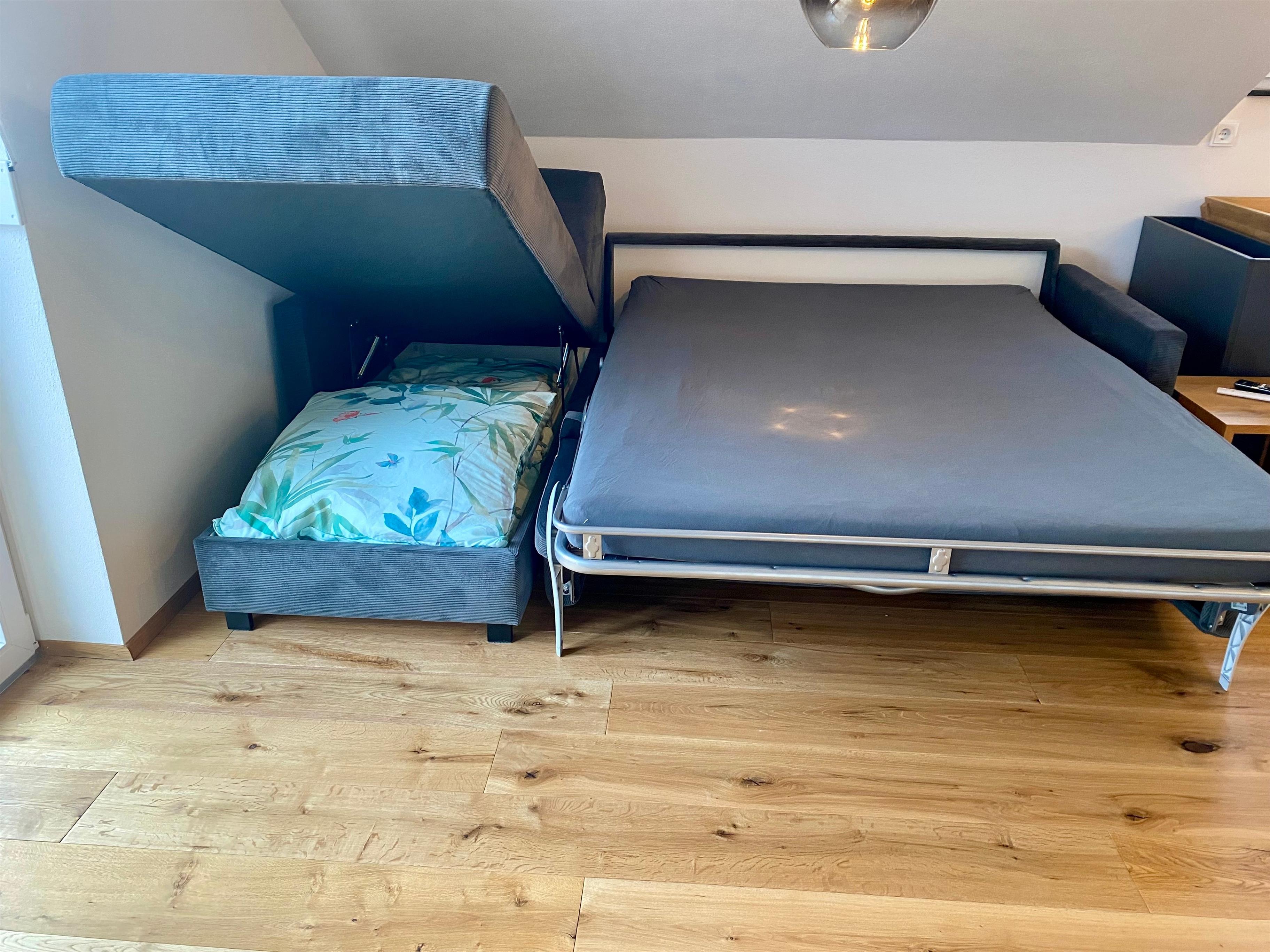 Der Wohnbereich, verfügt über ein Sofa, das ausgeklappt werden kann(1,40mx2,00m siehe Bilder) und Platz für zwei Personen bietet, ein großer Flachbildschirm-TV ist vorhanden.