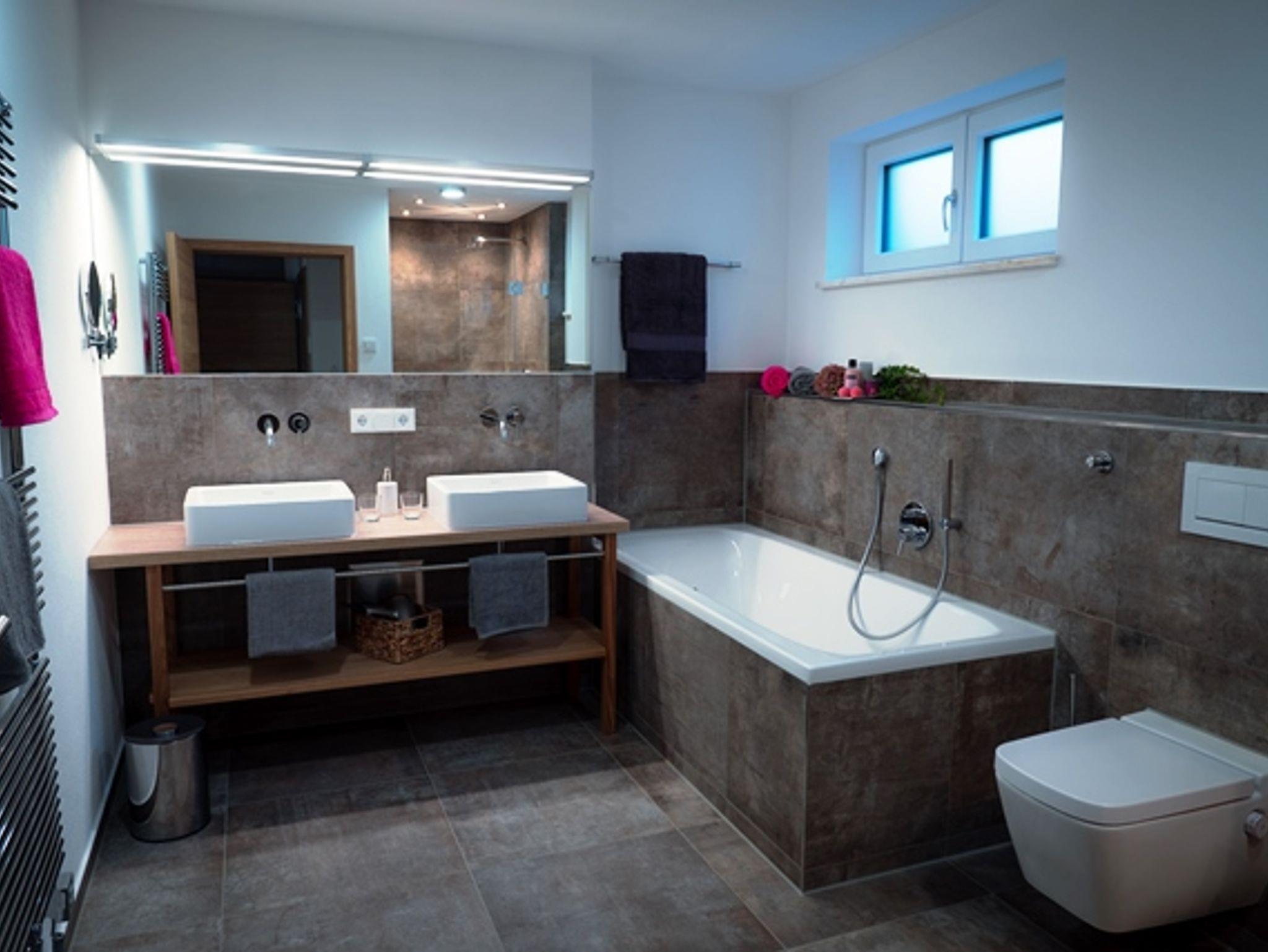 Die geräumige Ferienwohnung befindet sich im EG und ist bedingt behindertengerecht. Der große Eingangsbereich mit viel Stauraum führt direkt in den offenen Wohn- und Essbereich. Die Küche ist komplett ausgestattet. Boxspringbett, Flachbild-TV, Kaminofen und eine gemütliche Sitzecke laden zum abendlichen Entspannen ein. Das große, geräumige Badezimmer beinhaltet eine ebenerdige Dusche/ Rainshower und eine Badewanne und lässt somit keine Wünsche offen. Zusätzlich sind alle Bäder mit einem Bidet ausgestattet. An die überdachte Terrasse grenzt die Wildblumenwiese mit dem Naturgarten.