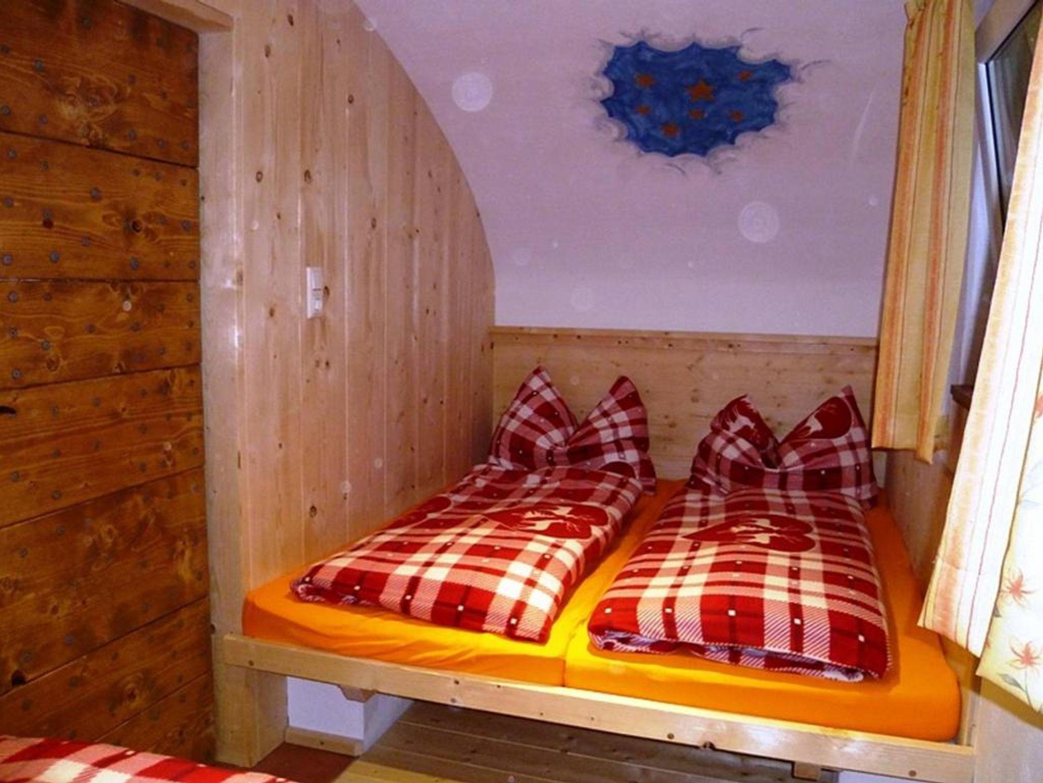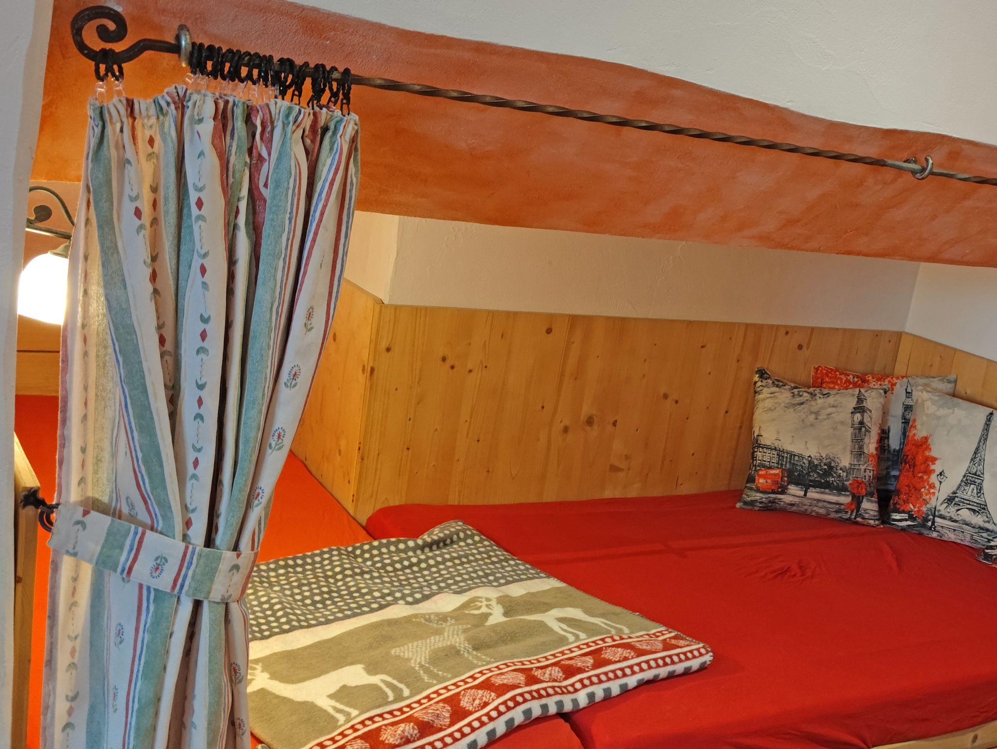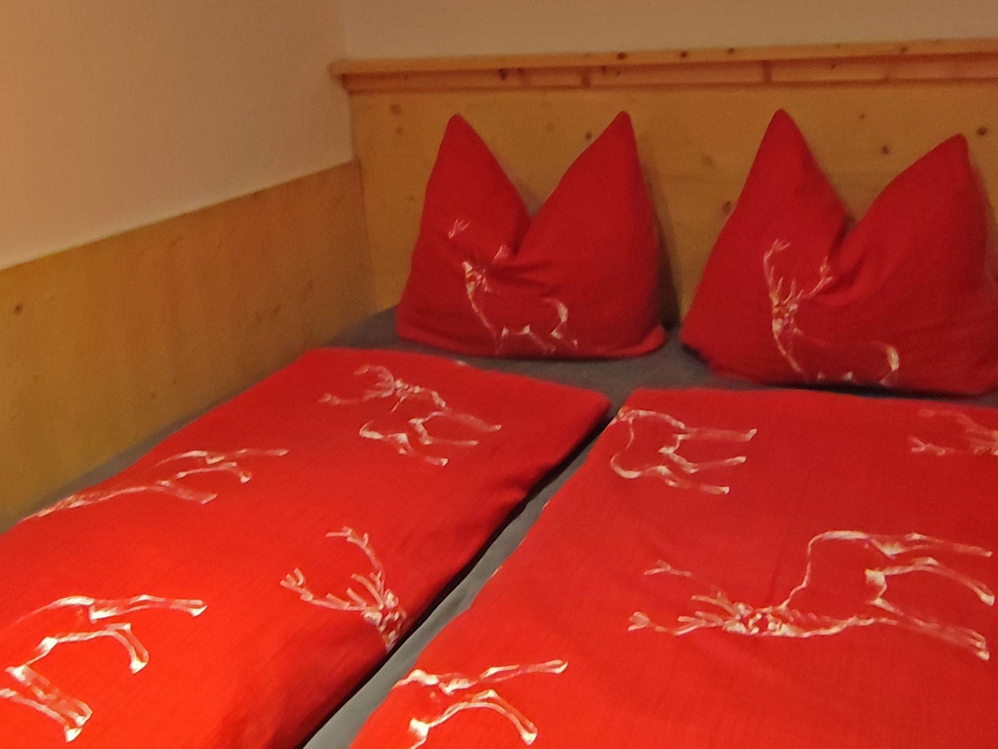 Im urigen Schlafzimmer mit Hüttencharakter stehen 2 Doppelbetten.