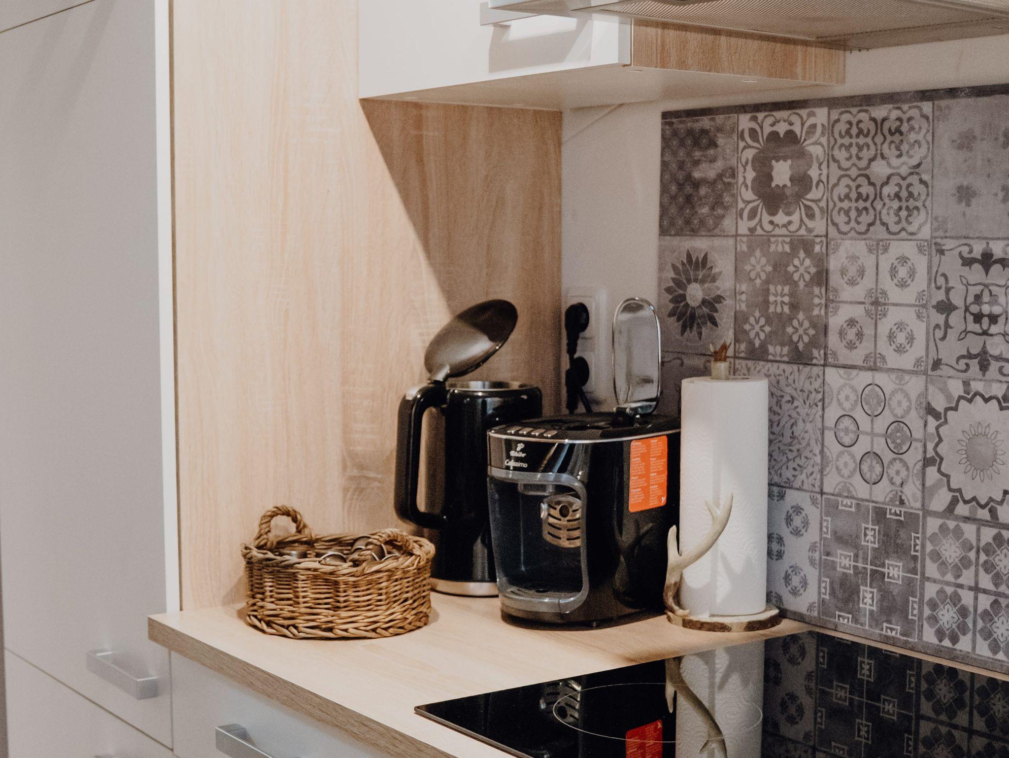 • Küche mit Kühlschrank, Herd, Backofen, Spülmaschine, Kaffeemaschine, Toaster