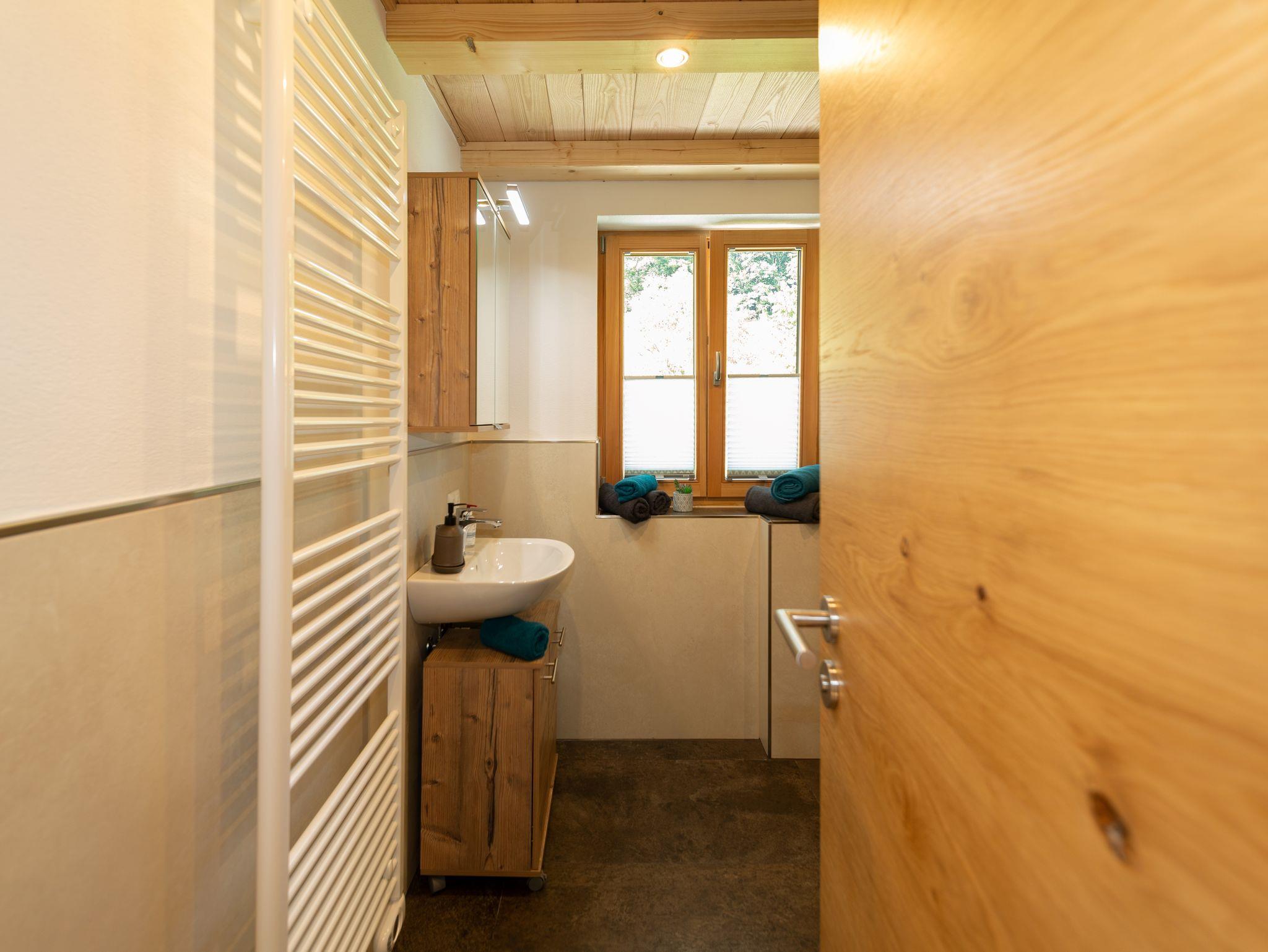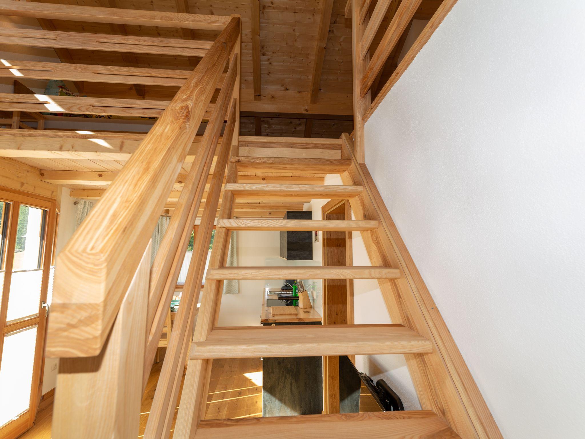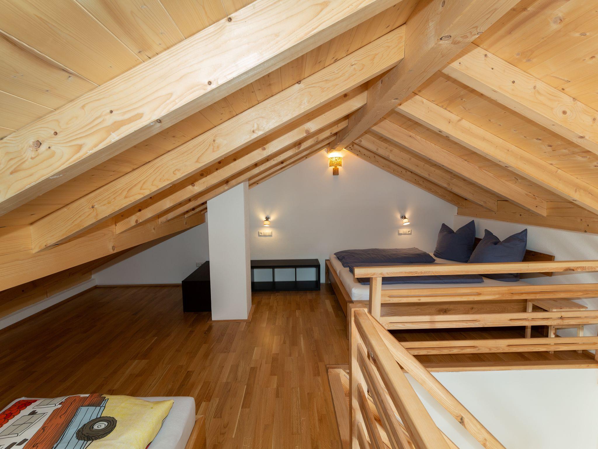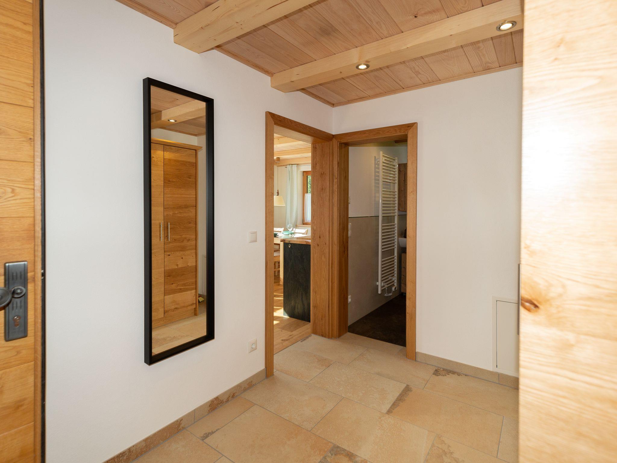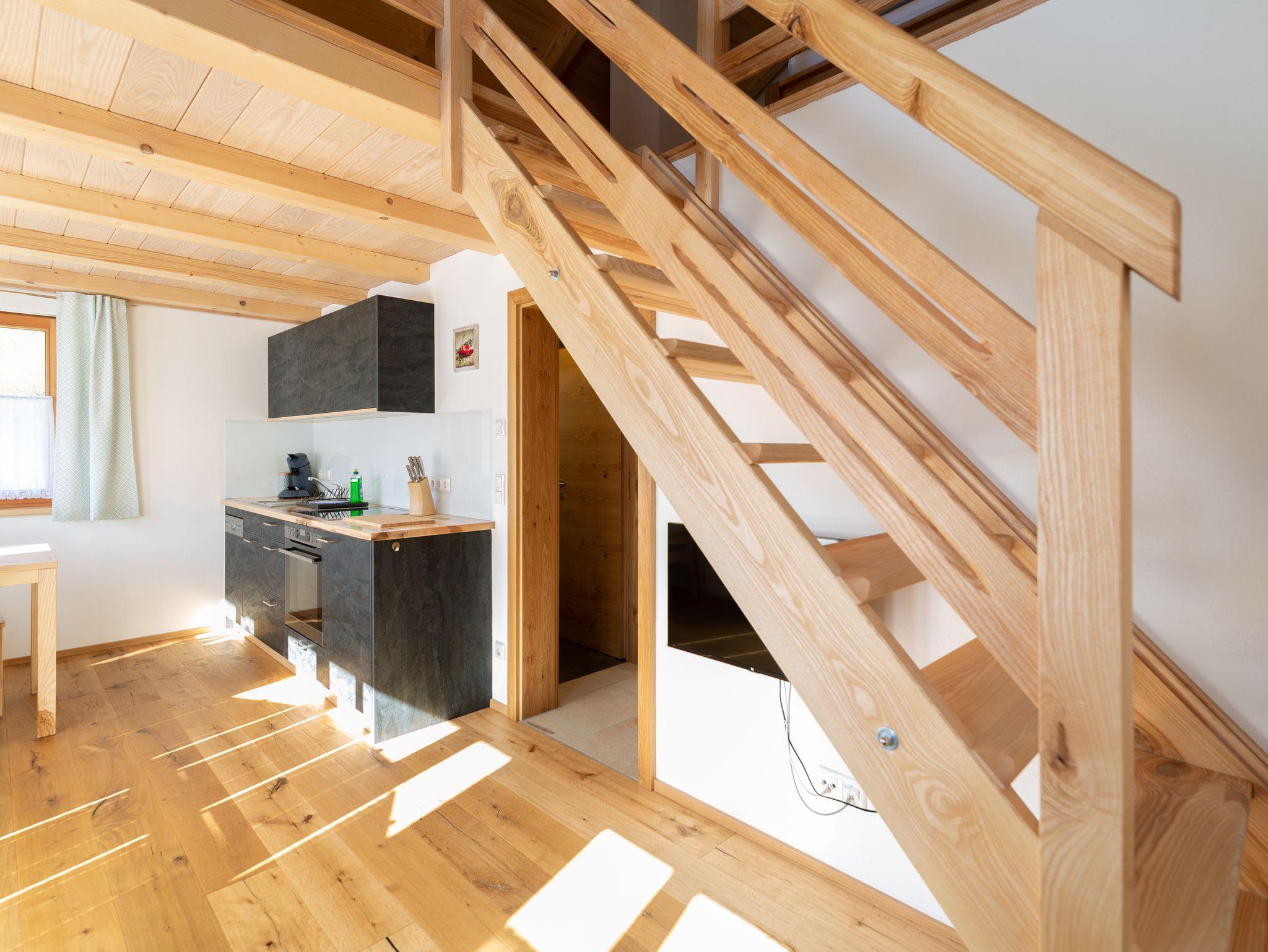 Unser neu erbautes Haus (Fertigstellung 2021) wurde ausschließlich aus Holz aus dem eigenen Wald erbaut. Im Erdgeschoß befindet sich eine Ferienwohnung mit einem Wohn- Esszimmer mit Kamin und zwei Schlafzimmer. Im 1. Obergeschoß gibt es zwei Ferienwohnungen mit jeweils einer Galerie zum schlafen. Das gesamte Gebäude wurde von Handwerkern aus der Region gebaut. Das Holz, aus eigener Forstwirtschaft, wurde direkt am Hof gesägt und zum trocknen gelagert. Die Möbel wurden ebenfalls aus eigenem Holz von regionalen Schreinern gefertigt, auch die Innenausstattungen stammen von regionalen Herstellern. Unser Ziel ist es dem Ausdruck Nachhaltigkeit ein Bild zu verleihen. Zusätzlich wird die Heiz- und Warmwasserenergie ausschließlich aus Sonne und Holz gewonnen.