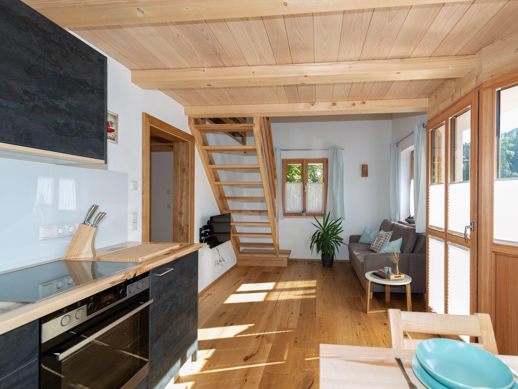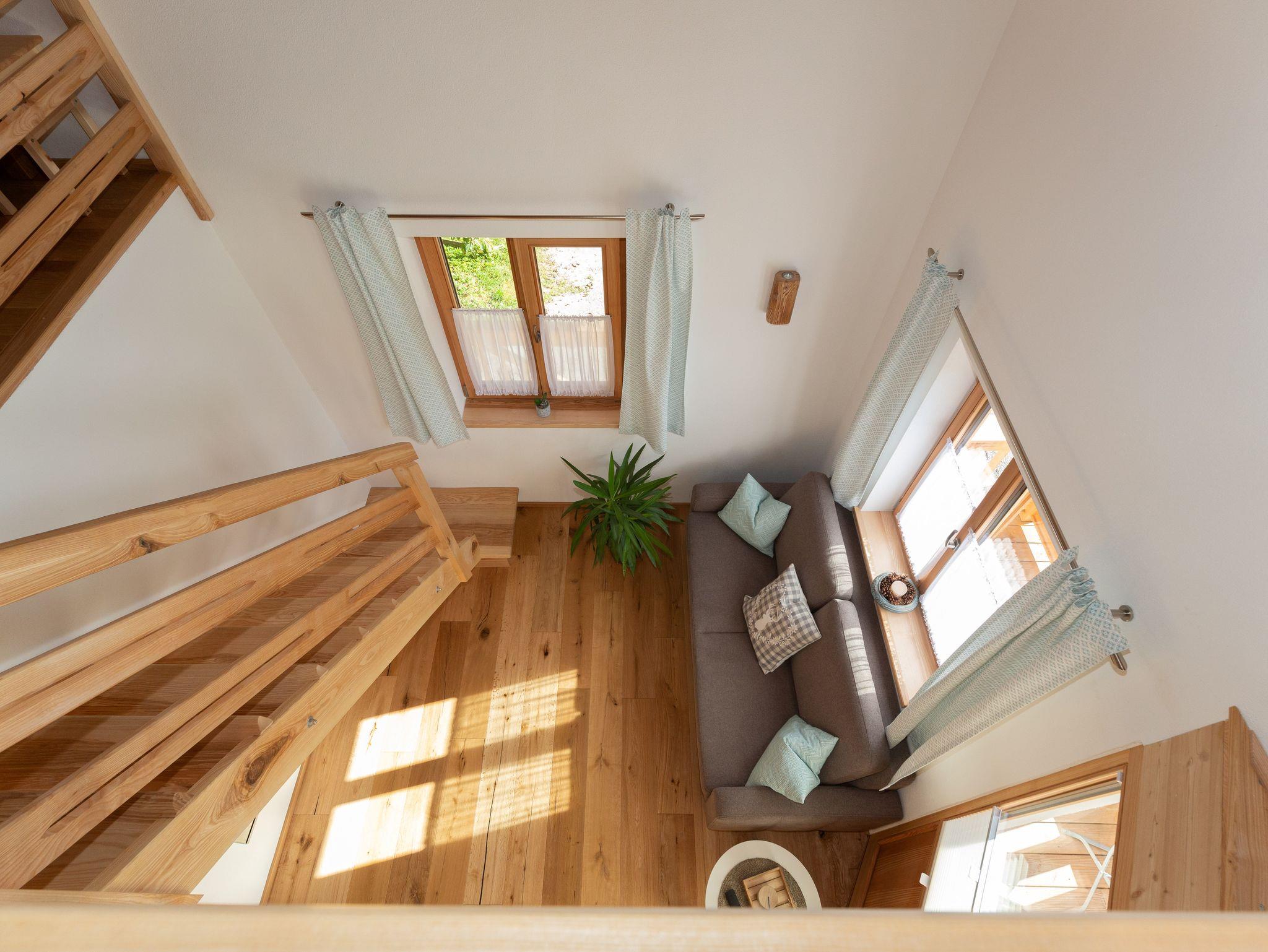 Die Ferienwohnung Brünnstein liegt im 1. Stock mit eigenem Eingang und Balkon. Die Betten befinden sich auf einer Galerie, es gibt ein Einzelbett und 1 Doppelbett. Der Wohn- Essbereich verfügt über eine voll ausgestattete Küche inkl. Senseo-Padmaschine. Kostenloses W-Lan ist vorhanden.