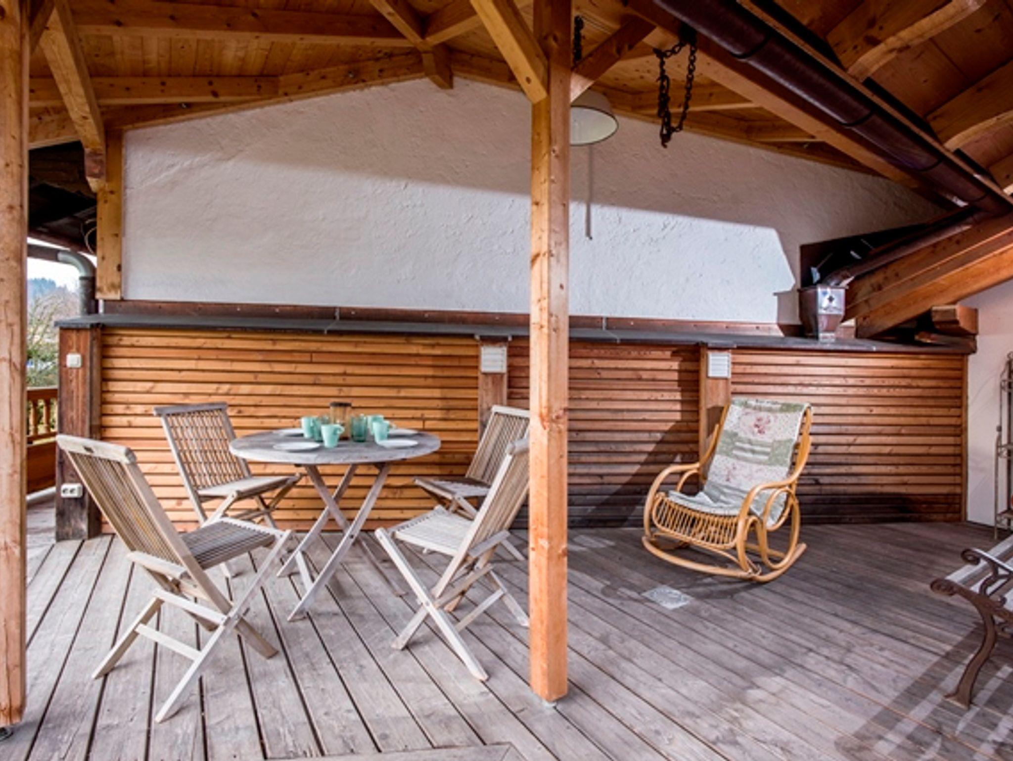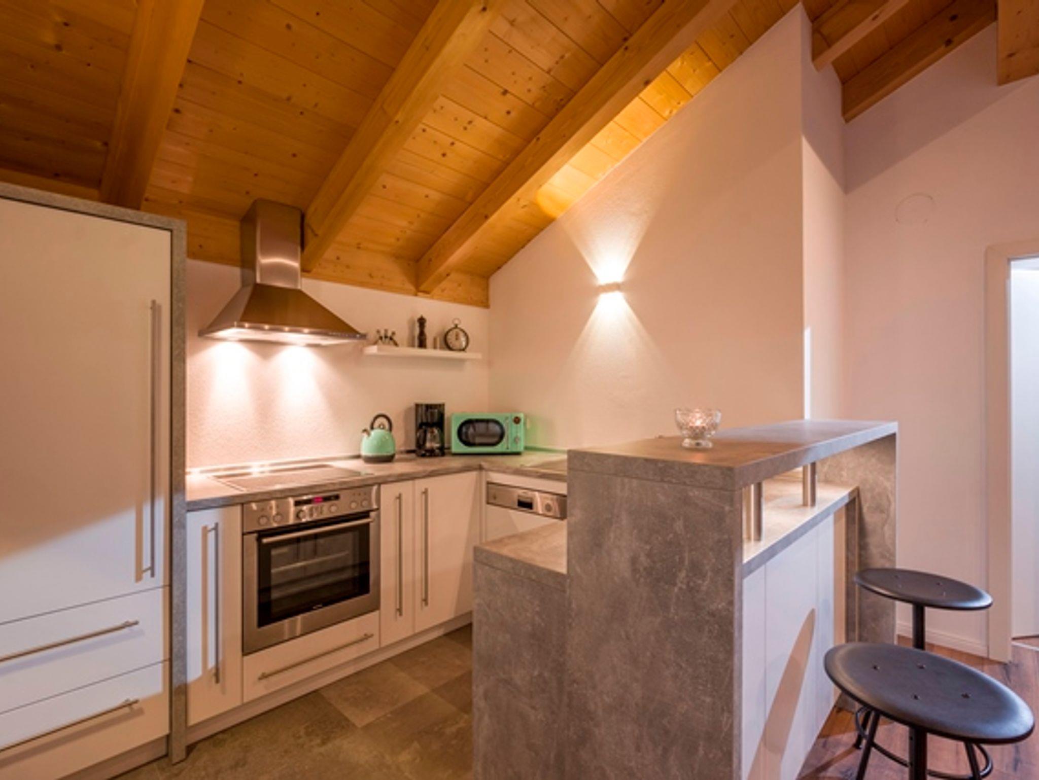 Geräumige Dachgeschosswohnung im 1. Stock mit Eingangsbereich, komplett ausgestatteter Einbauküche, Wohnzimmer mit ausziehbarer Couch, zwei Schlafzimmern (2x Einzelbett, 1x Doppelbett), Bad mit WC, Bidet und Dusche, ein separates WC und ein kleiner Trockenraum (für Skibekleidung etc.), Fußbodenheizung, Überdachte Terrasse, WLAN kostenlos, TV über Internet