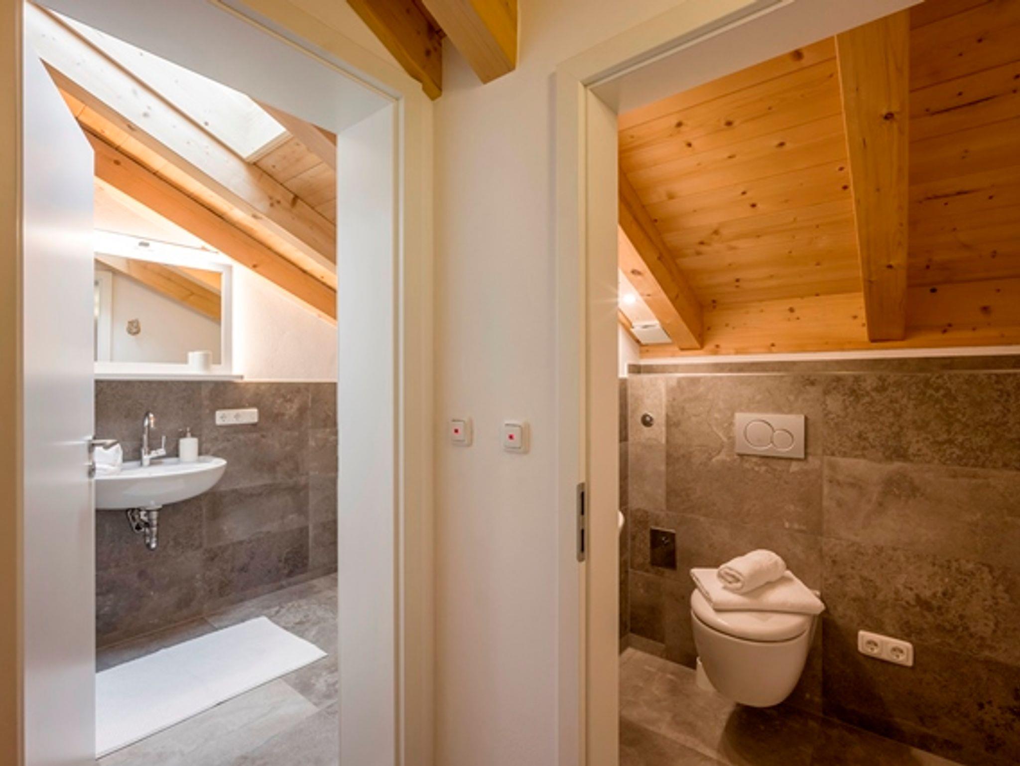 Geräumige Dachgeschoßwohnung im 1. Stock mit Eingangsbereich, komplett ausgestatteter Einbauküche, Wohnzimmer mit ausziehbarer Couch, zwei Schlafzimmern (2x Einzelbett, 1x Doppelbett), Bad mit WC, Bidet und Dusche, ein separates WC und ein kleiner Trockenraum (für Skibekleidung etc.)