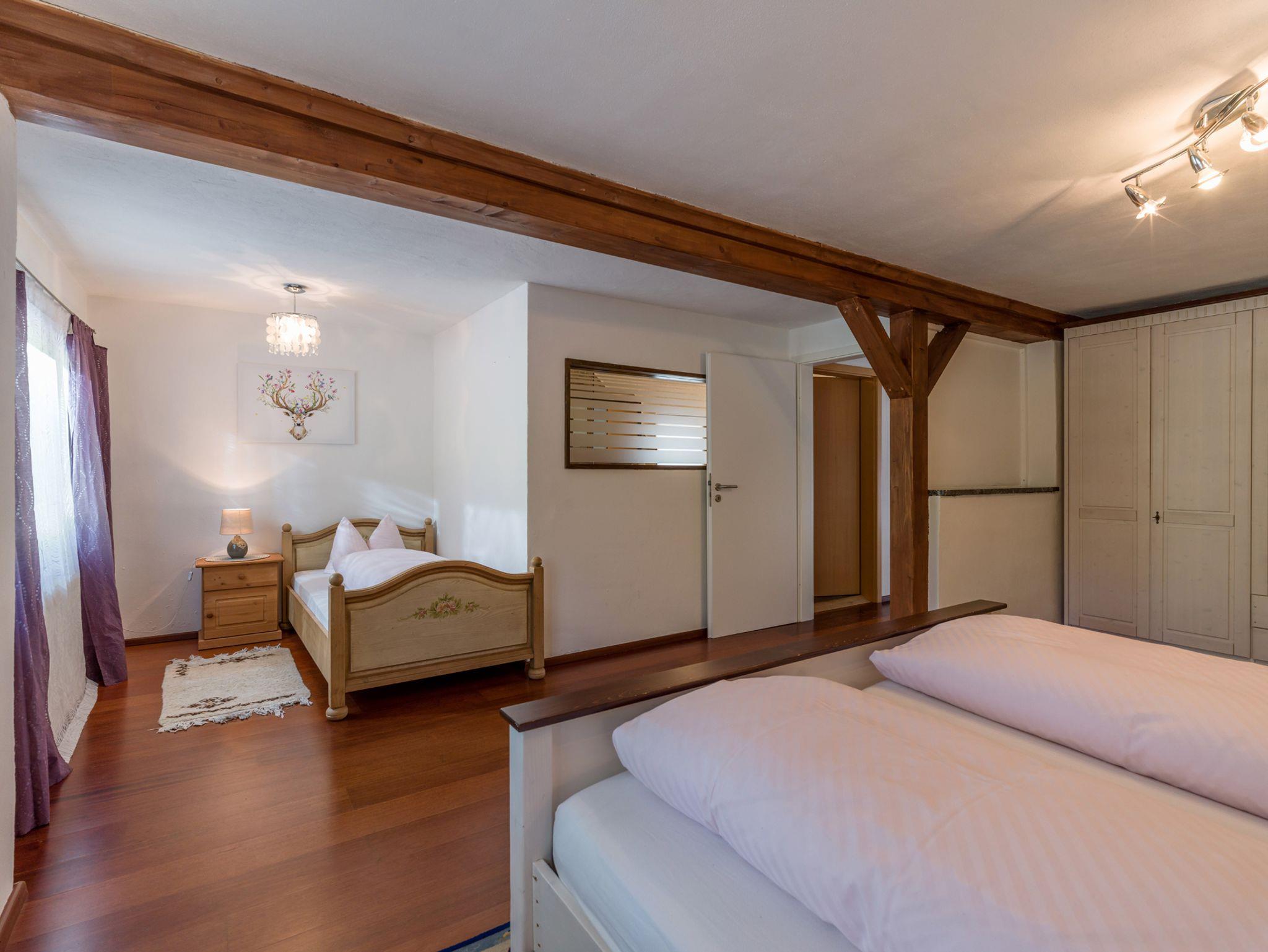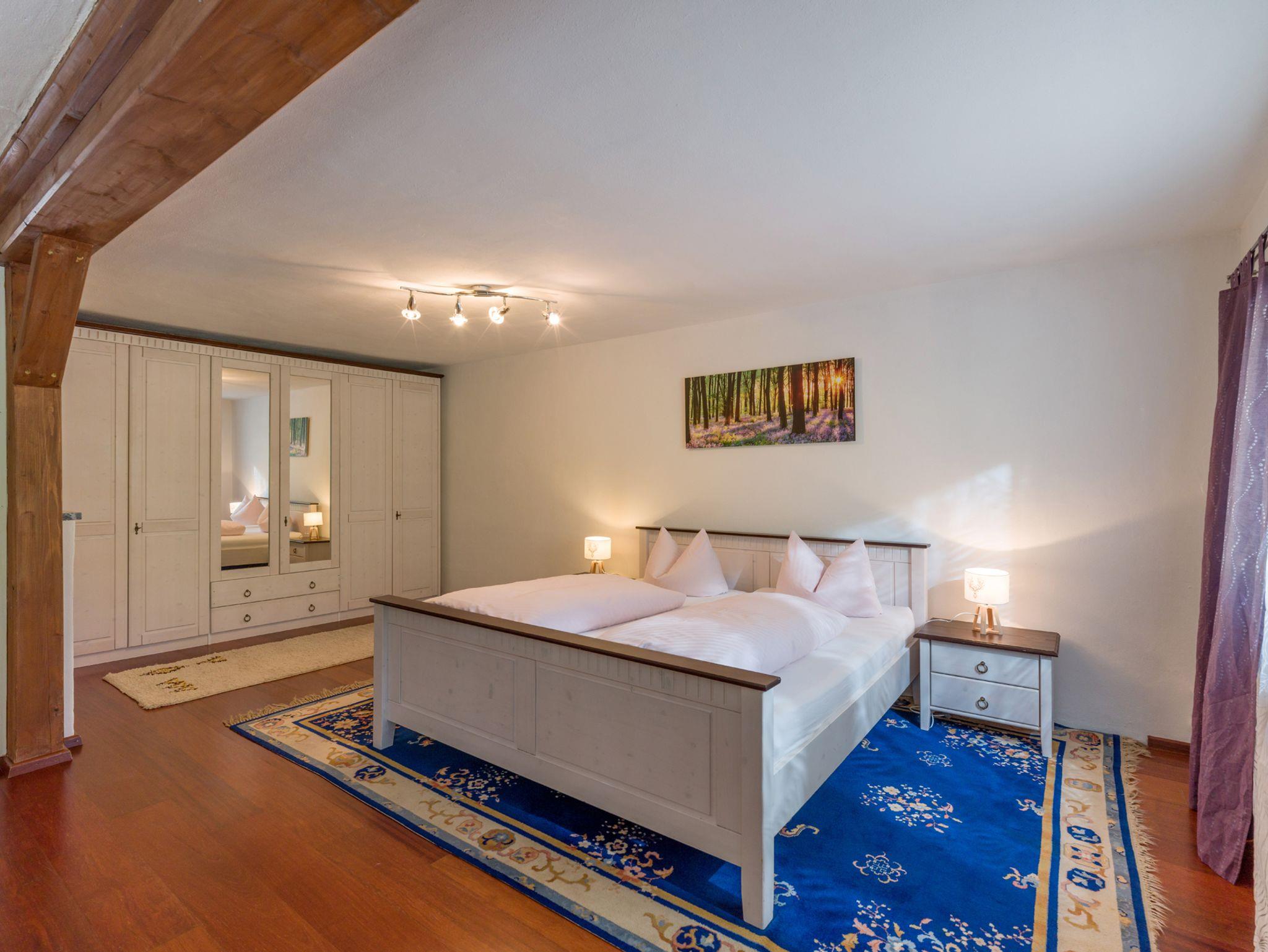 Das Ferienhaus (ca.85 qm) befindet sich am hinteren Ende des Gästehauses und verfügt über einen eigenen Eingang mit Garderobe im großem Flur. Im großen Wohnraum (ca. 35 qm) ist eine komplett ausgestattete Küche integriert, sowie ein Esstisch mit Stühlen. Dort befindet sich auch eine Couch, Satelliten Fernseher ; kostenlosem W-Lan und ein Einzelbett (90x200cm). Ein zusätzliches Bett wäre bei Aufbettung mit 5 Personen möglich. Über 3 kleine Stufen gelangt man zum großzügig geschnittenen Bad mit WC, Badewanne mit Glasduschwand; Bodenheizung und einem separaten Schlafzimmer mit Doppelbett (2 x 90x200cm) und einem Einzelbett (90x200cm). Das Ferienhaus verfügt über einen direkten Zugang zur Terrasse/Garten.