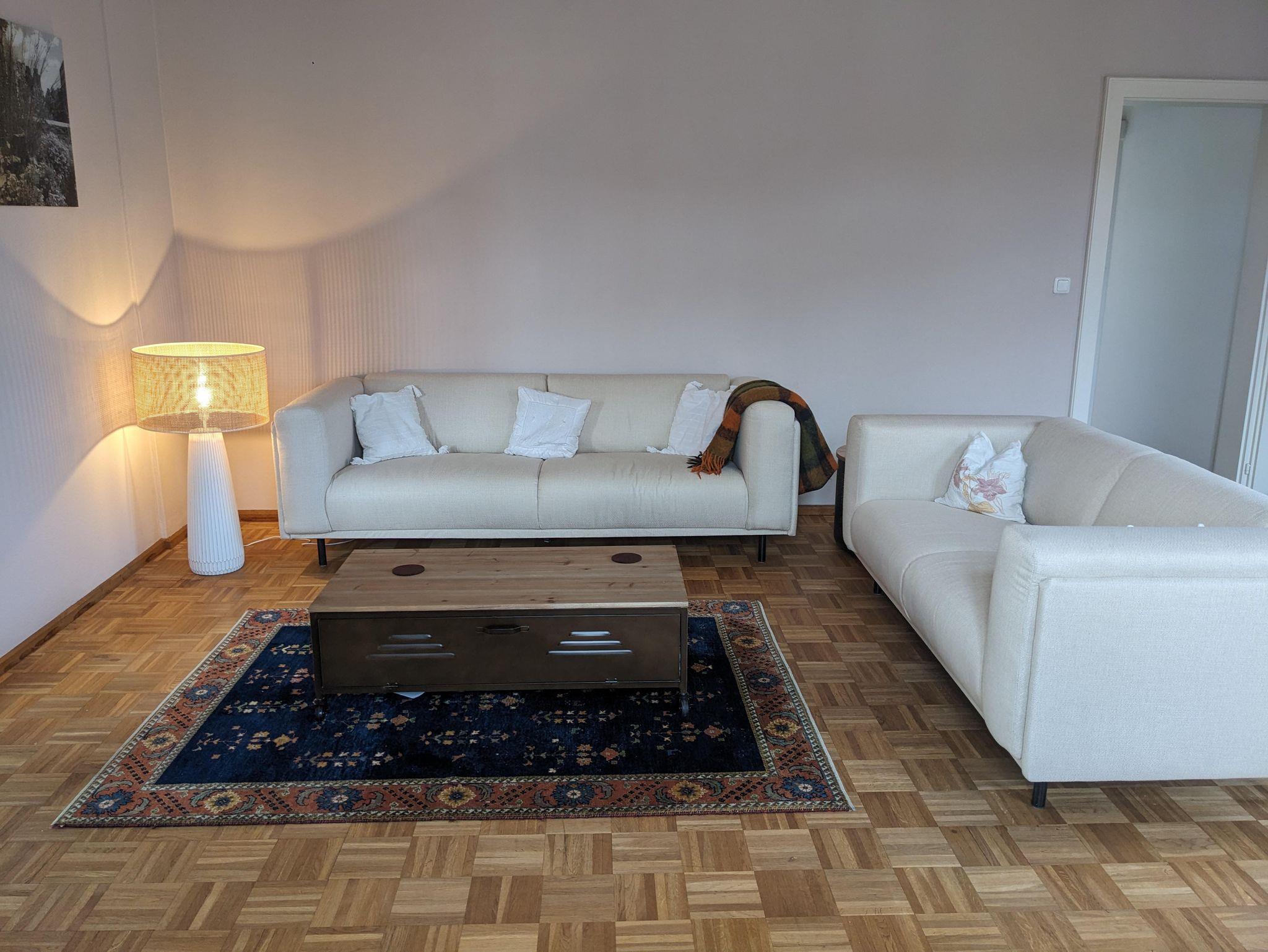 Ein Schlafzimmer mit 1,80 m breitem Doppelbett, das andere Schlafzimmer mit cremefarbenem Metalltagesbett 90 cm breit und einem 1,20 cm breitem Bett. Ein großes Wohnzimmer mit einer Sitzgruppe bestehend aus 2 Sofas, einem stillgelegten dekorativen Schwedenofen, einem Schreibtisch, TV, Internetradio, Ambientenbeleuchtung, freier WLAN-Zugang. Vollausgestattete Wohnküche mit hochwertiger Einbauzeile mit Granit-Platten, Induktionsherd, Kaffeevollautomat, freistehende Gefrierkombination und einem Esstisch für 6 Personen.
