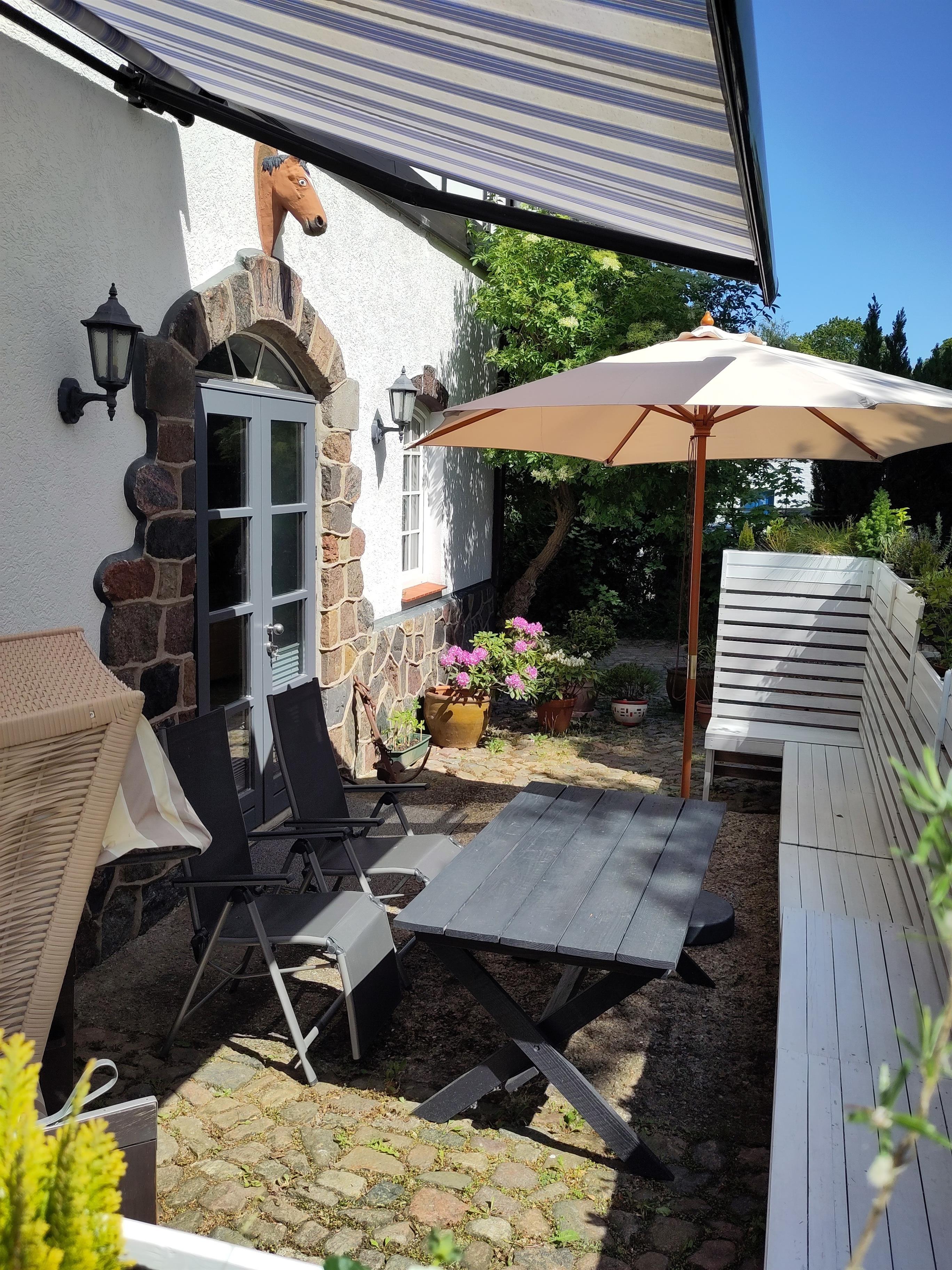 Vor der Wohnung, angrenzend an einen großen Vorgarten, ist auf einer ca. 25m² großen Terrasse Platz zum gemütlichen Sitzen, Sonnen im Strandkorb, Grillen etc.