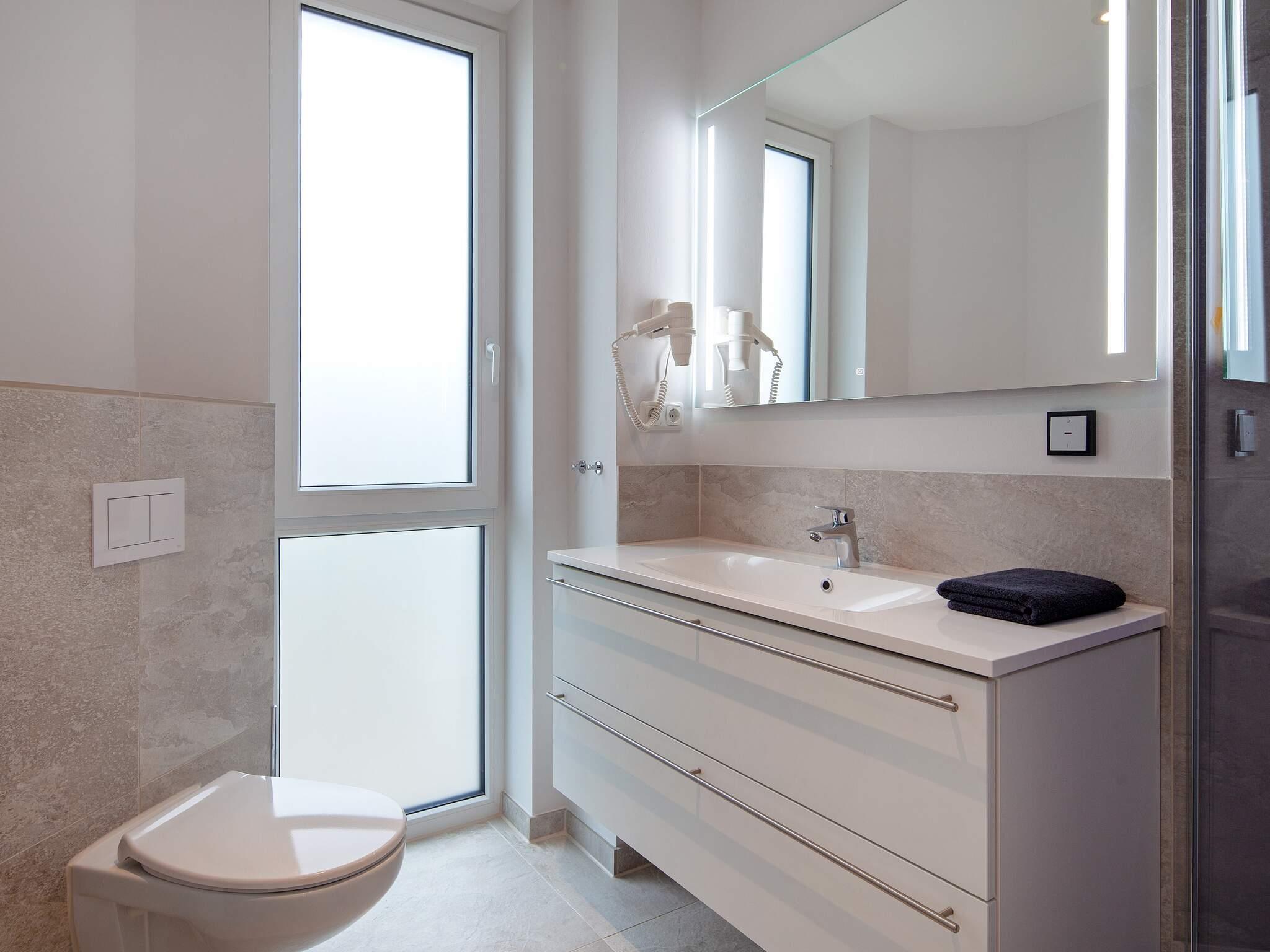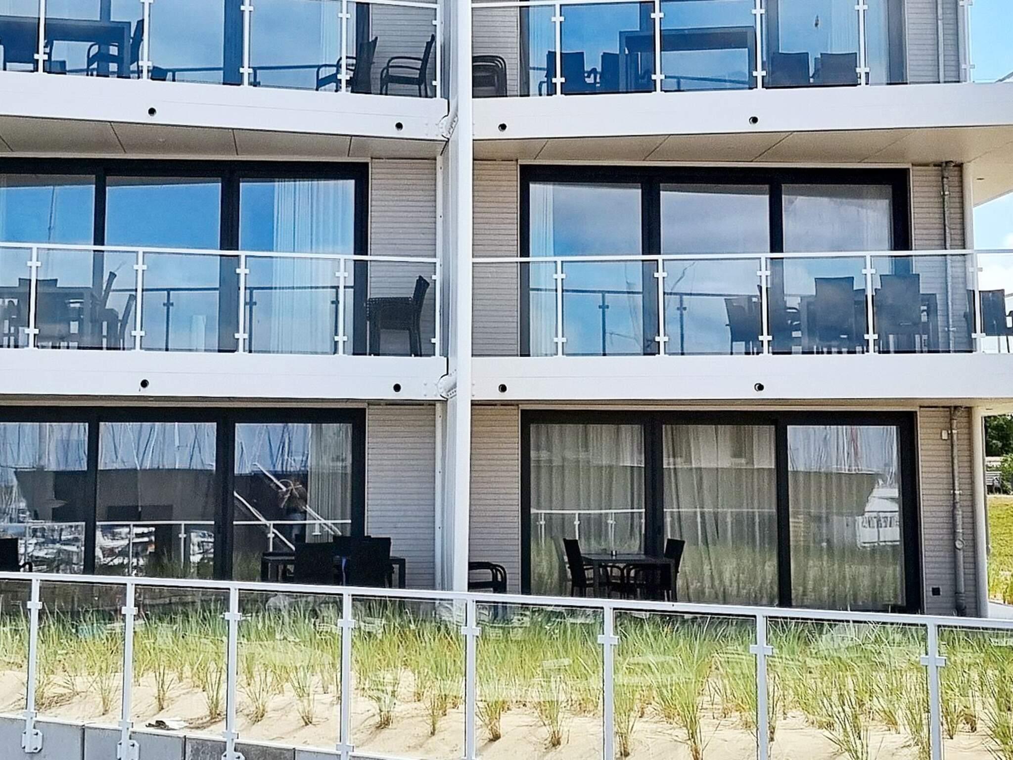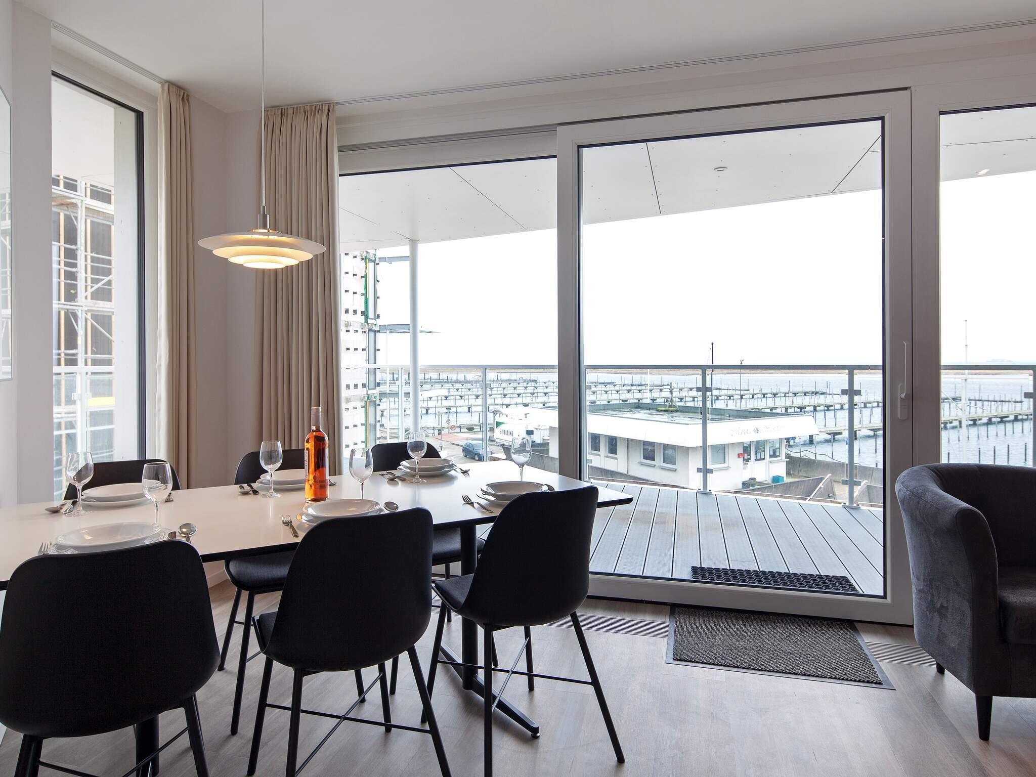 Der er en særlig glæde ved at se havnen fra sin egen terrasse – sejlbådene, der glider ind, Østersøens glimt og det rolige liv ved vandet. Denne moderne lejlighed på 2. sal tilbyder netop det med en rummelig altan, hvor overdækkede liggestole og et bord med stole indbyder til afslapning, spisning eller blot at nyde udsigten fra morgen til aften.