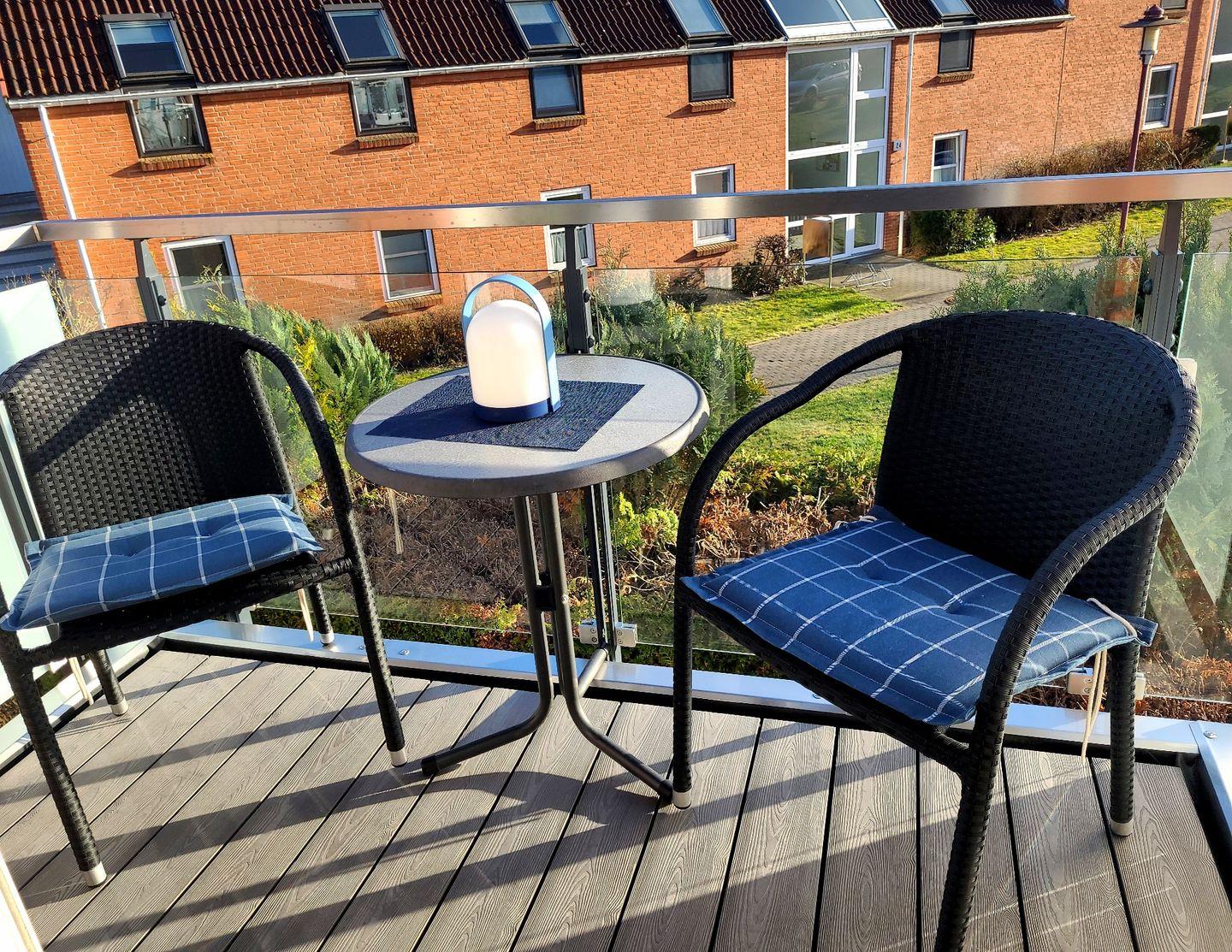 Im geräumigen Wohnzimmer finden Sie einen Esstisch, den Smart-TV, das gemütliche Sofa, welches zum Schlafsofa (Liegefläche 160x200 cm) für eine Person umfunktioniert werden kann und den Zugang zum möblierten Balkon. Außerdem verfügen Sie hier über die integrierte, gut ausgestattete Küche.