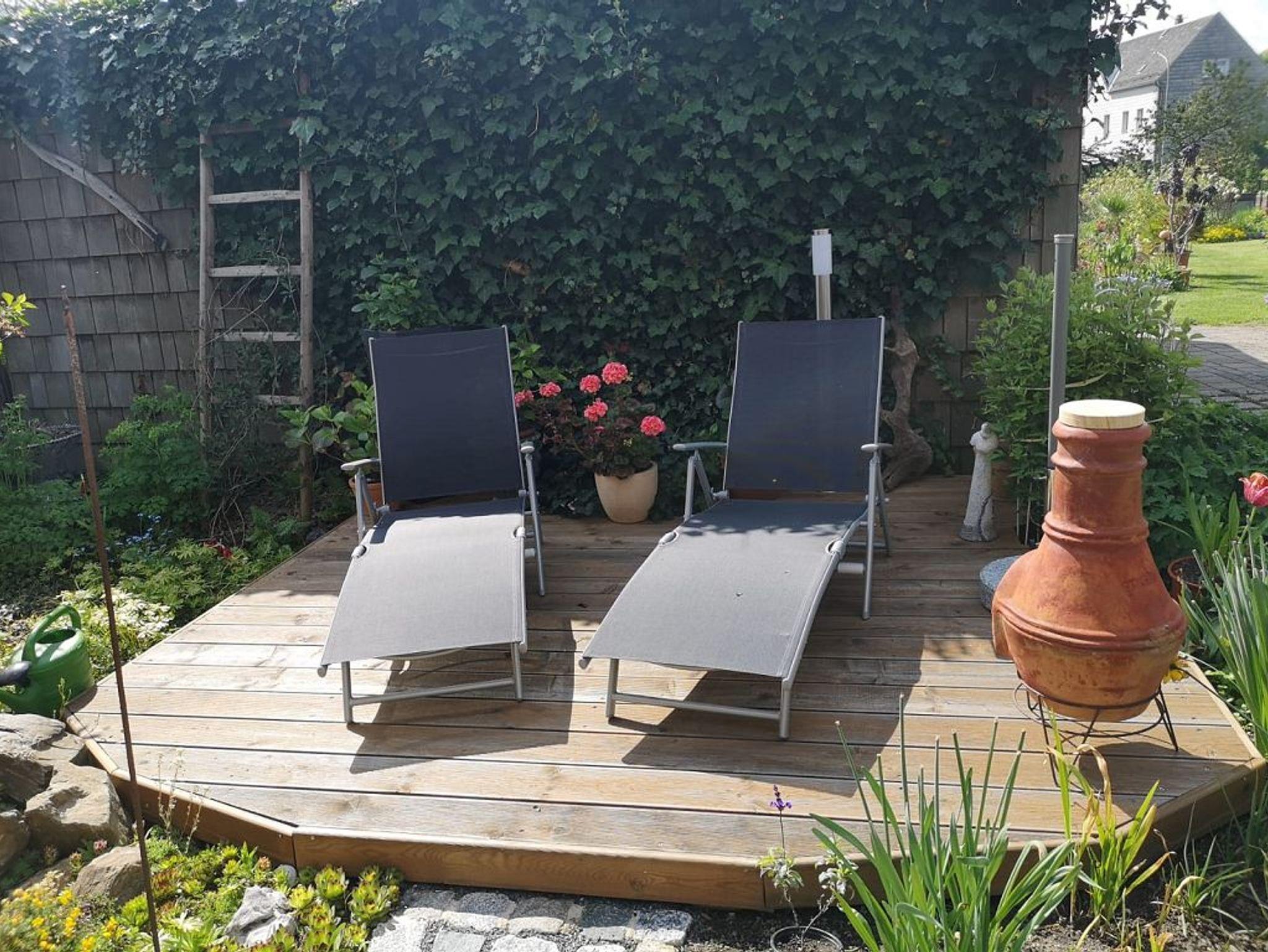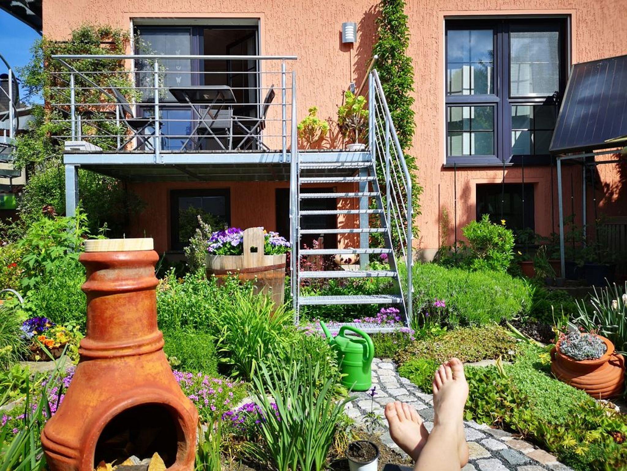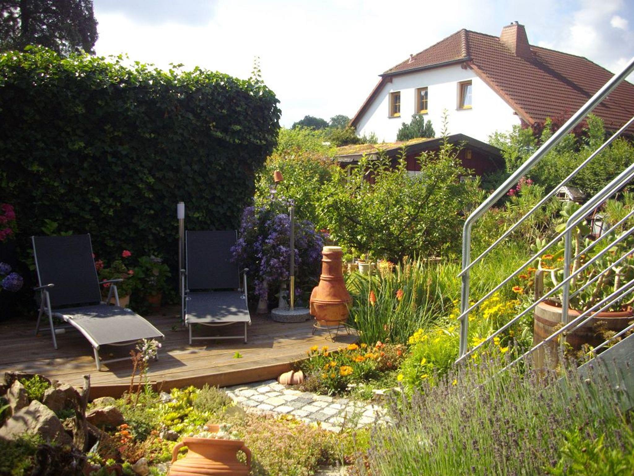 Die Wohnung wurde 2019 liebevoll neu eingerichtet. Sie besteht aus Wohnzimmer, großer Küche mit Essplatz, 2 Schlafzimmern mit Doppelbetten, Arbeits- / Spielezimmer, Badezimmer mit Dusche und separatem WC. An das Arbeitszimmer angebaut ist ein Balkon mit Abgang zur Terrasse. Ausgestattet ist die Wohnung mit allen erforderlichen Geräten, 2x SAT-TV (Wohnzimmer und 1 Schlafzimmer), Waschmaschine, Herd, Geschirrspüler, Kaffeemaschine, Microwelle etc. In der gesamten Wohnung ist kostenloses W-LAN nutzbar. Auf Balkon und Terrasse sind Gartenmöbel, Sonnenschirm, 2 Liegen und Grill vorhanden. Der Schwimmteich im üppig blühenden Garten kann mitbenutzt werden. Die Beerensträucher und Obstbäume laden zum Naschen ein (je nach Jahreszeit).