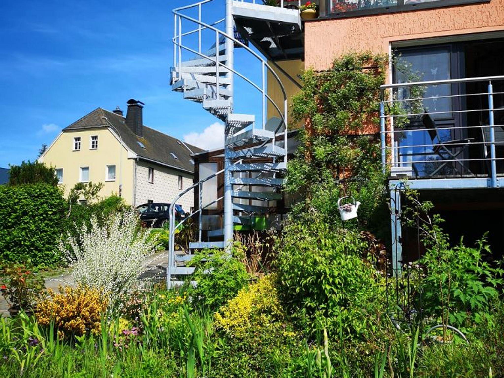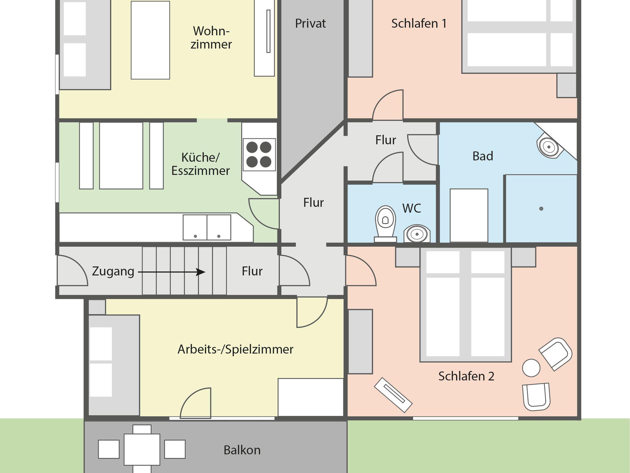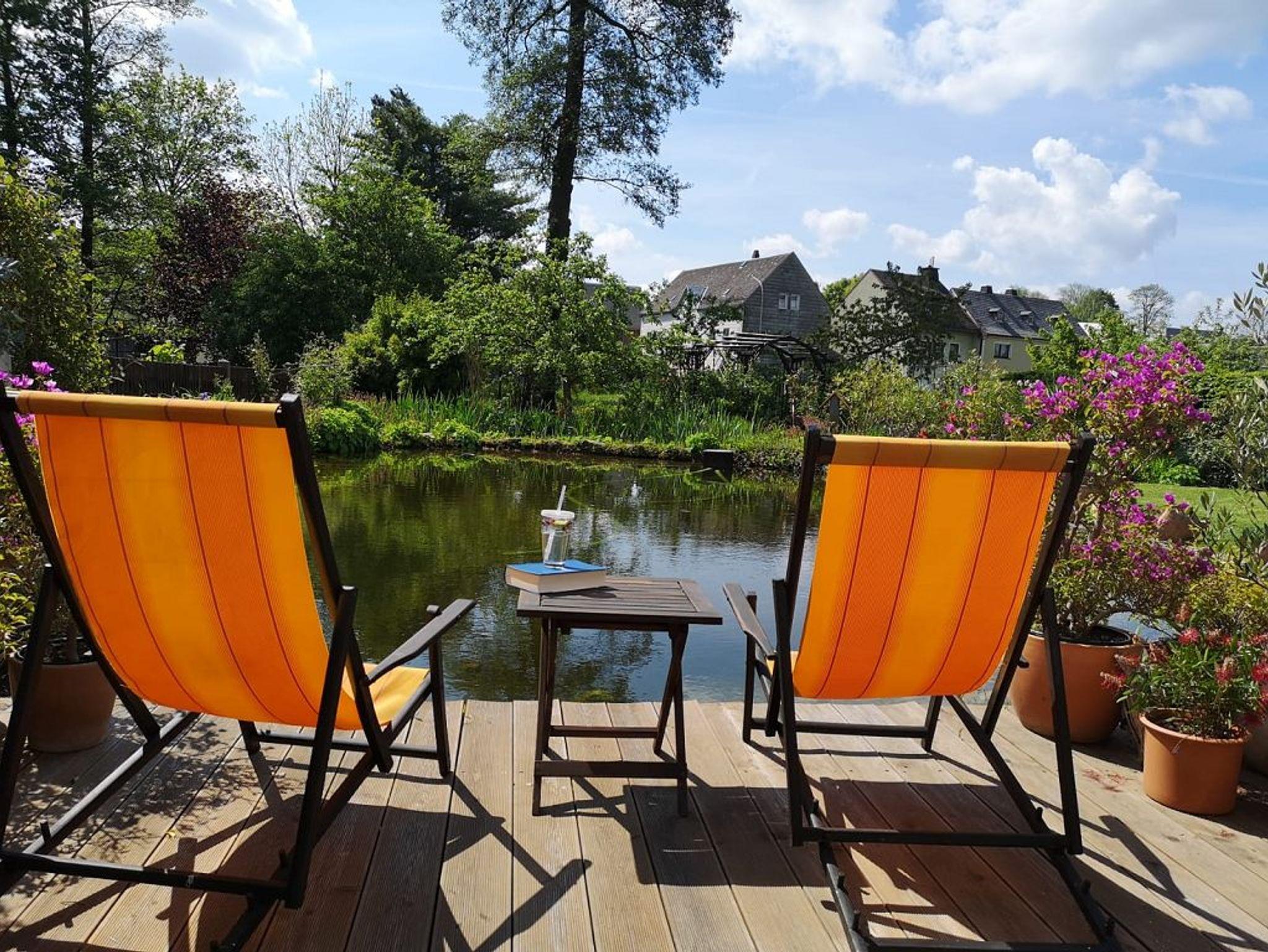 Die Wohnung wurde 2019 liebevoll neu eingerichtet. Sie besteht aus Wohnzimmer, großer Küche mit Essplatz, 2 Schlafzimmern mit Doppelbetten, Arbeits- / Spielezimmer, Badezimmer mit Dusche und separatem WC. An das Arbeitszimmer angebaut ist ein Balkon mit Abgang zur Terrasse. Ausgestattet ist die Wohnung mit allen erforderlichen Geräten, 2x SAT-TV (Wohnzimmer und 1 Schlafzimmer), Waschmaschine, Herd, Geschirrspüler, Kaffeemaschine, Microwelle etc. In der gesamten Wohnung ist kostenloses W-LAN nutzbar. Auf Balkon und Terrasse sind Gartenmöbel, Sonnenschirm, 2 Liegen und Grill vorhanden. Der Schwimmteich im üppig blühenden Garten kann mitbenutzt werden. Die Beerensträucher und Obstbäume laden zum Naschen ein (je nach Jahreszeit).