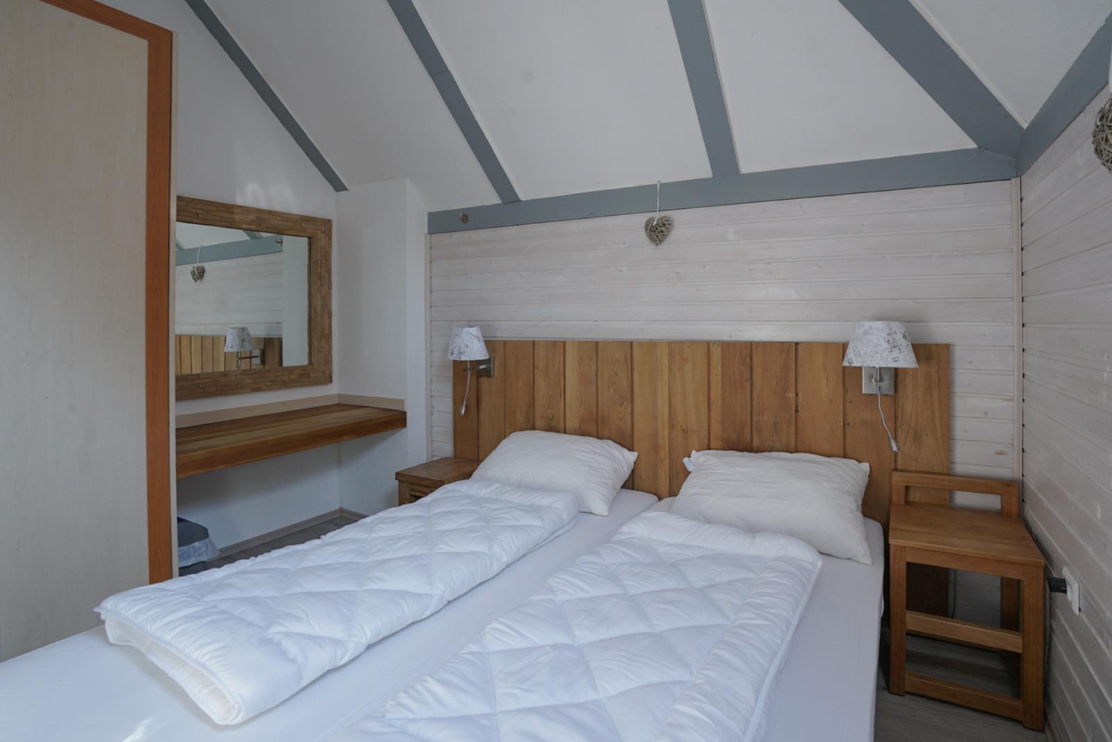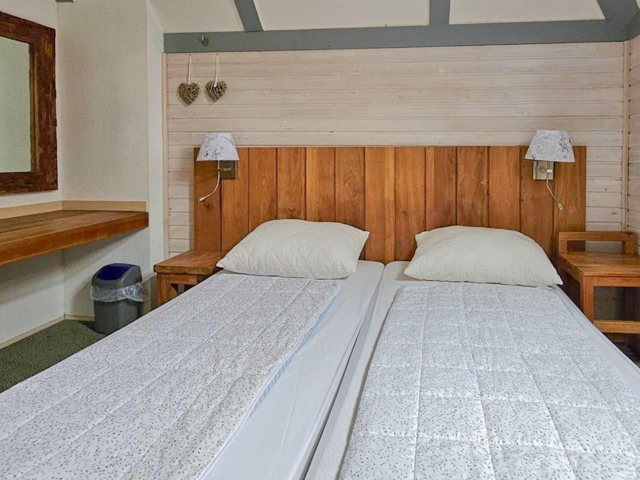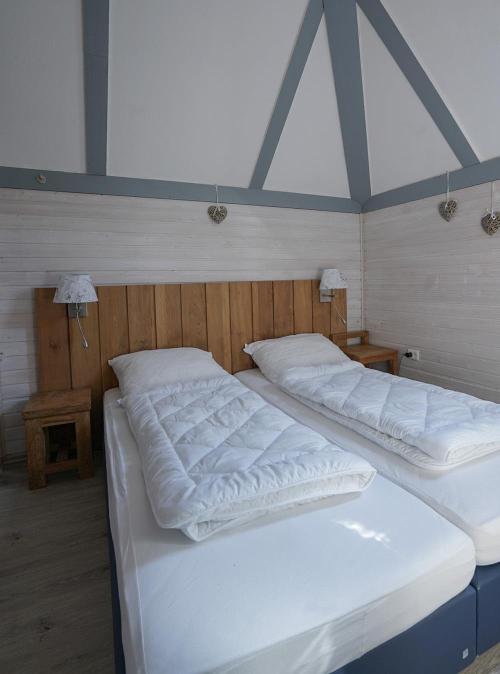 Im Obergeschoss liegen 2 weitere Schlafzimmer, das eine mit Doppelbett, das andere mit 2 separaten Betten. Darüber hinaus lädt im Obergeschoß ein großer Balkon zum Entspannen ein und darunter im Erdgeschoß eine schöne Terrasse. Beide Schlafzimmer im DG verfügen je über einen eigenen Balkonzugang (Süden). Von hieraus können Sie die Blicke über den gesamten Ferienpark schweifen lassen.