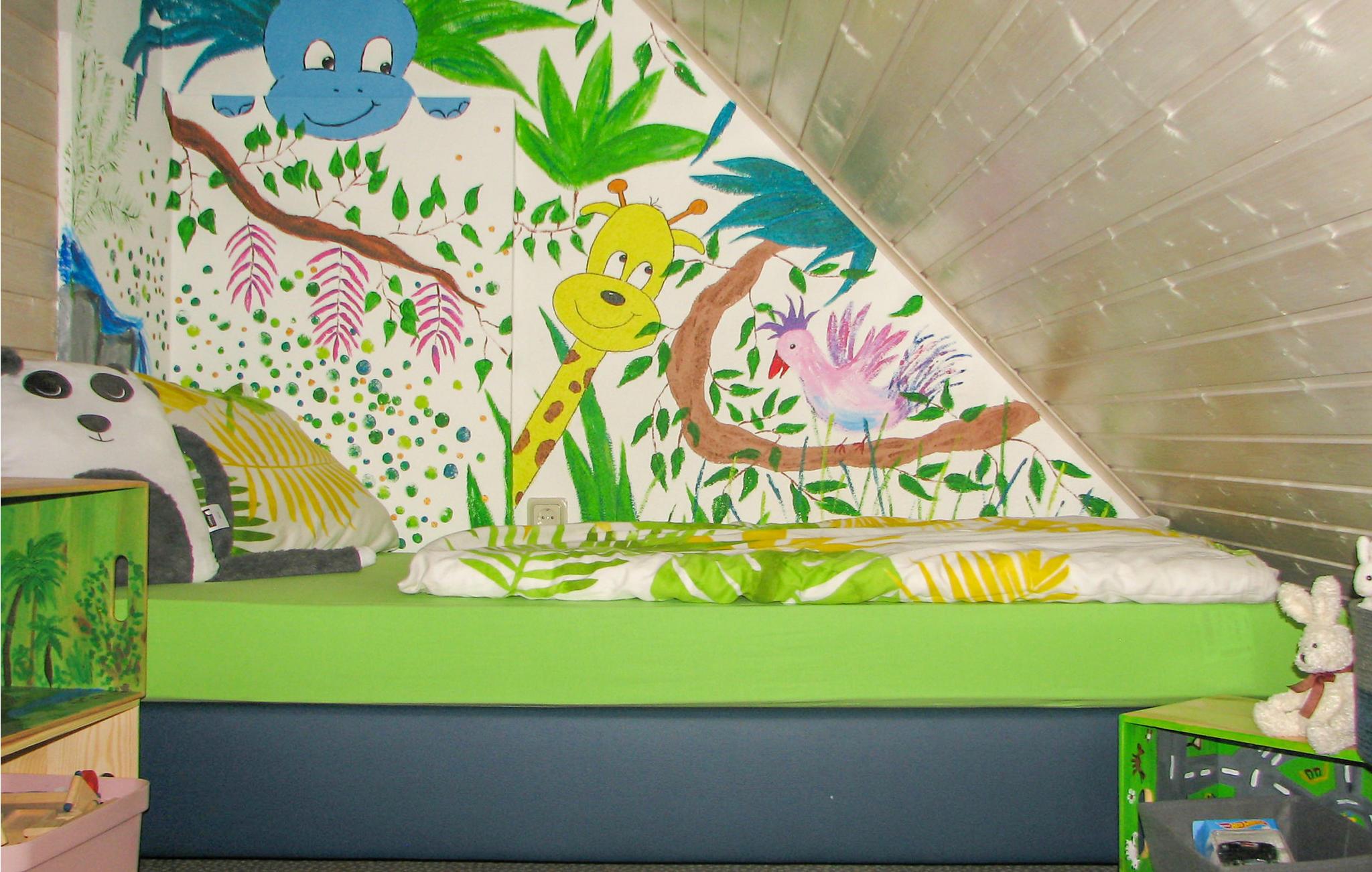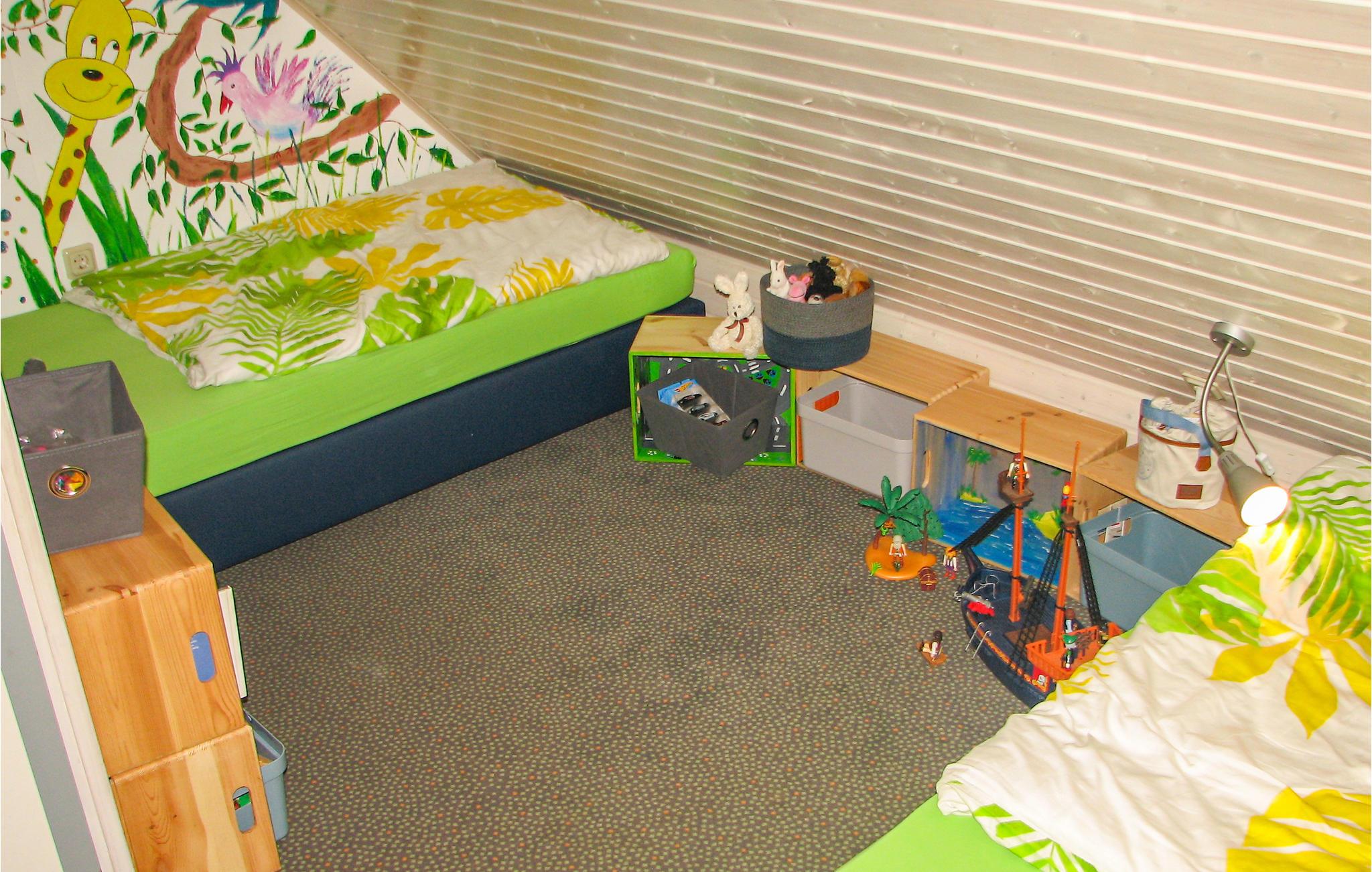 Via en vindeltrapp i 2. etasje kommer man opp til ytterligere to soverom med skråtak: Jungelrommet er for de yngste gjestene eller for modige voksne med et ungt hjerte. Her er det to enkeltsenger og mye å oppdage: F.eks. pirater, dukkehus, jernbane og lekekasser.