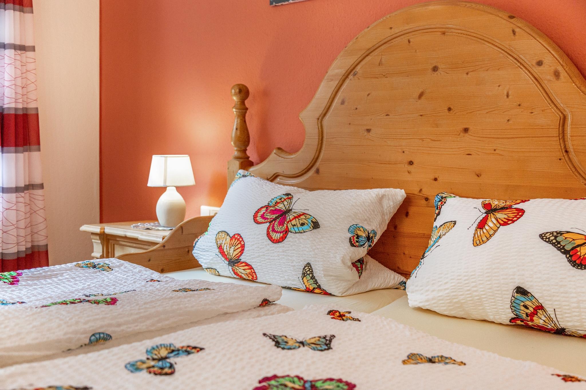 Die Wohnung verfügt über 2 Schafzimmer auf 2 Etagen. Das Bettzeug ist für Allergiker geeignet. Bettwäsche brauchen Sie nicht mitbringen. Fernseher und CD-Radio sind vorhanden ebenso kostenloses WLAN. Wir haben auch ein Babybett, Hochstühlchen und eine Wickelauflage im Haus. Unsere Wohnung ist eine Nichtraucherwohnung. Haustiere auf Anfrage.