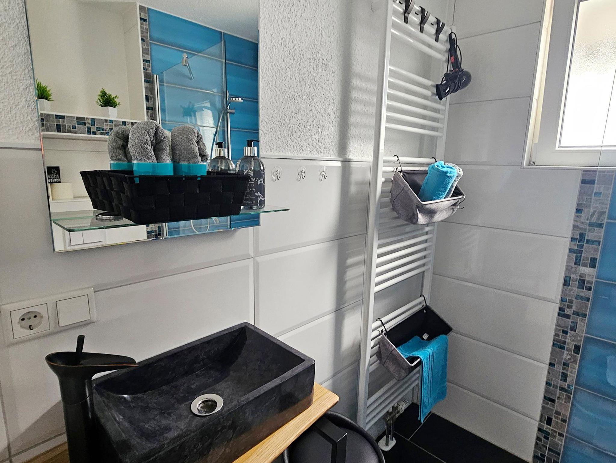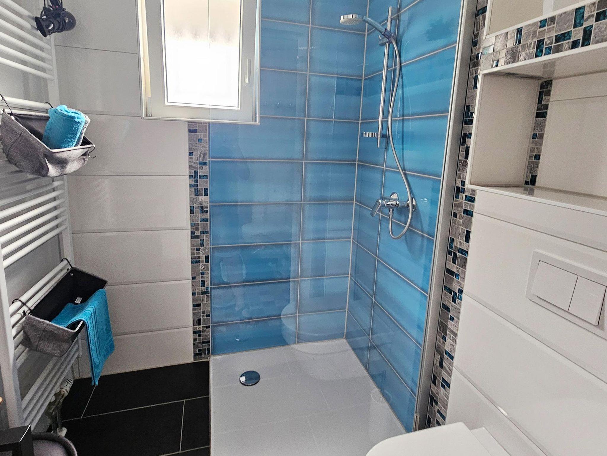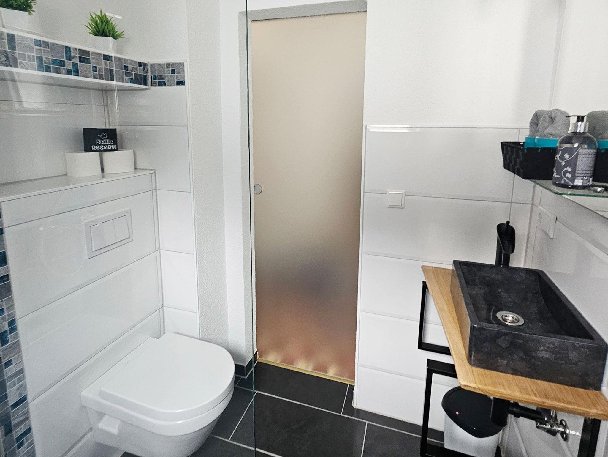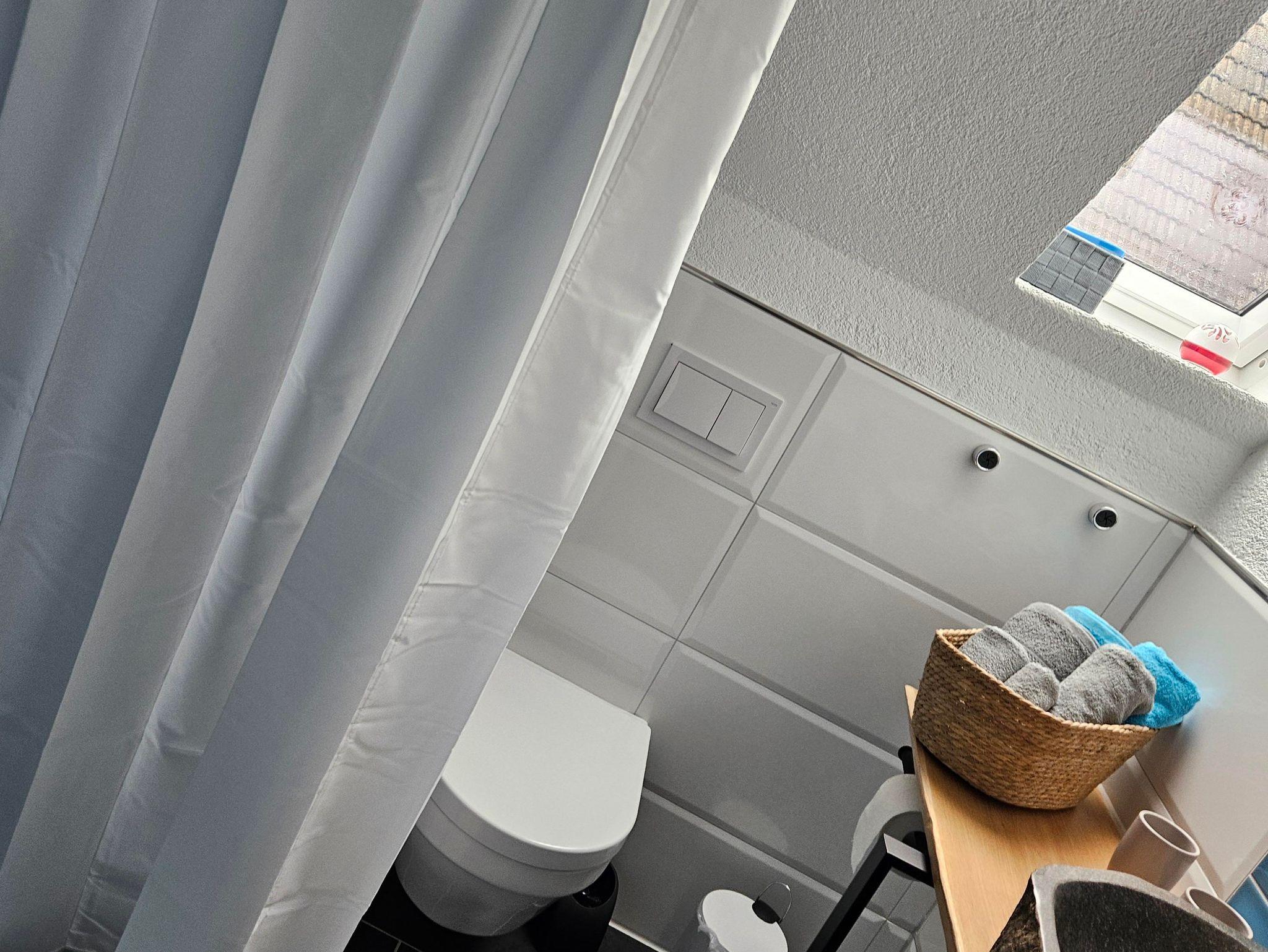 Information: Die Türbreite zum Badezimmer fällt etwas geringer aus wie gewohnt und beträgt nur etwa 80 cm.