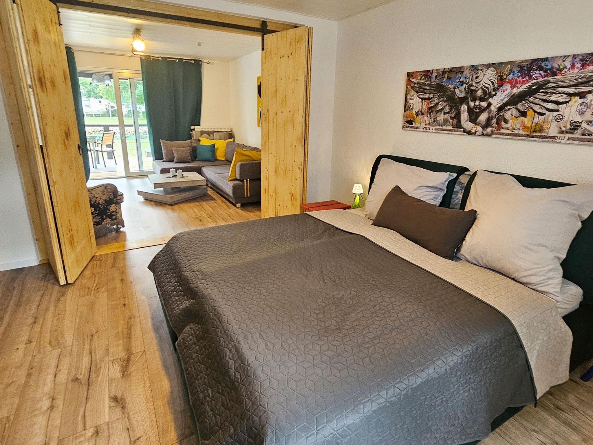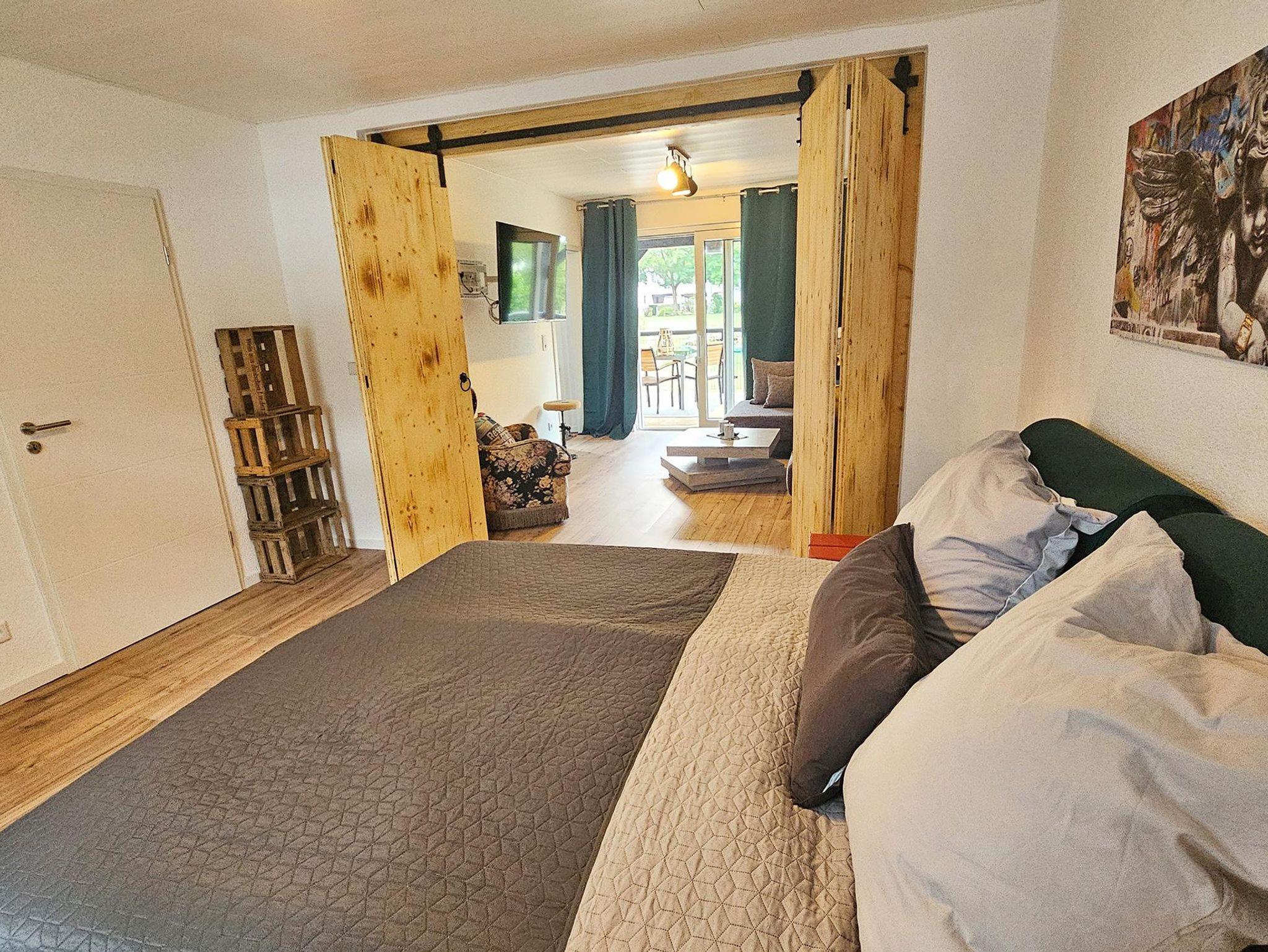 Der Garten und die herrliche Sonnenterrasse laden Dich ein. Der große Schlaf-Wohnbereich lässt sich durch eine moderne Schiebewand ruckzuck in zwei Räume teilen. So hat jeder seine Privatsphäre - ob zu Zweit oder zu Viert.