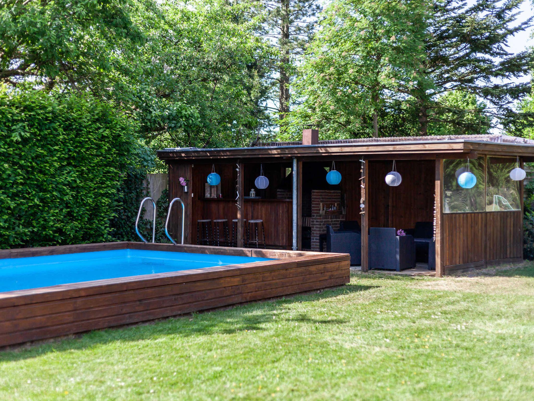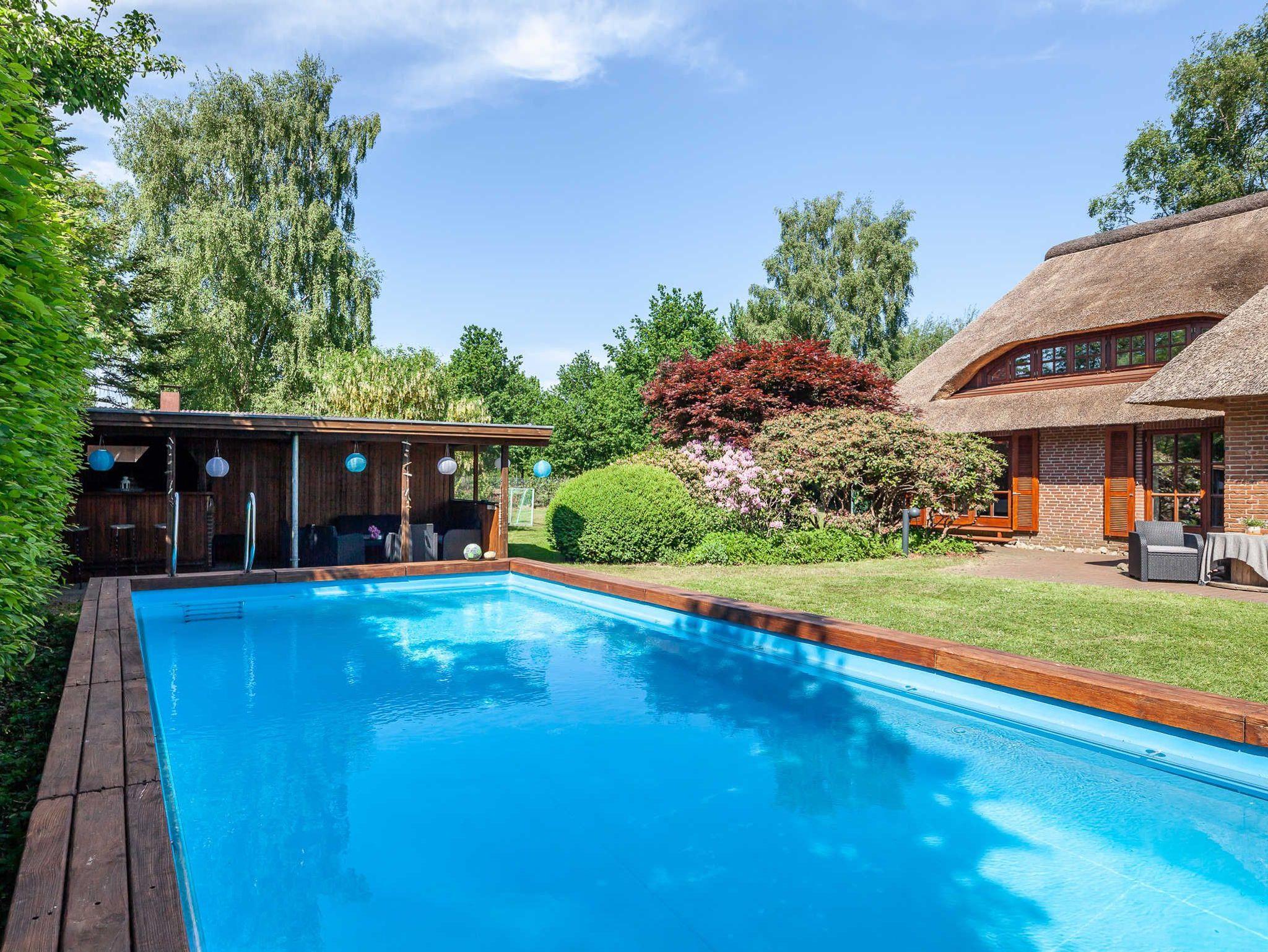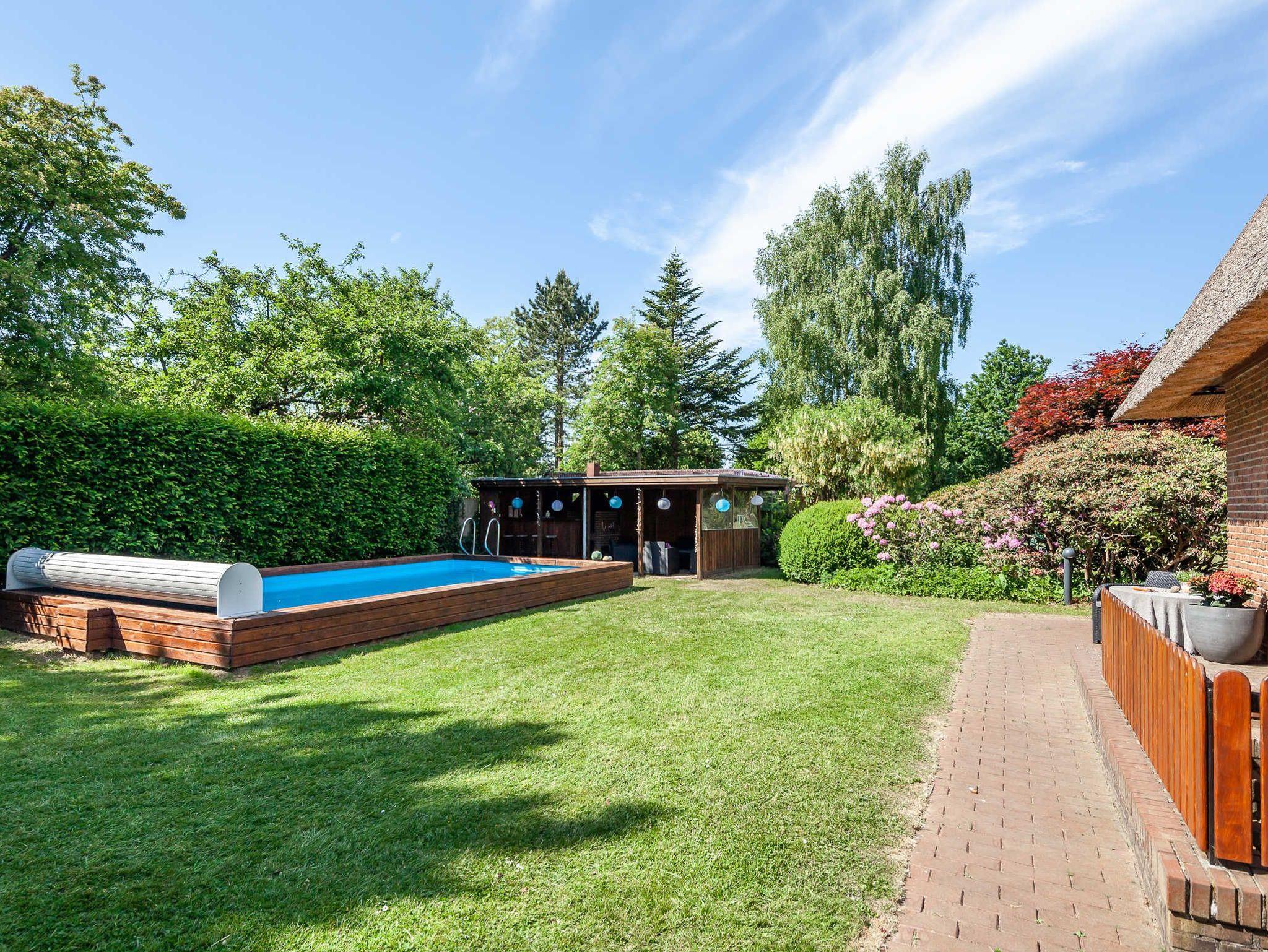 Der 2500 Quadratmeter große Garten ist komplett eingezäunt und liebevoll bepflanzt. Er bietet neben den beiden Sonnenterrassen einen großen Pool (8 x 4 Meter und 1,50 Meter tief), der für eine Erfrischung nach der Sauna oder an heißen Tagen einfach wundervoll ist. Der Poolbereich hat eine überdachte Poolbar und eine urige Grillecke für gesellige Barbecue Abende im Ferienhaus.