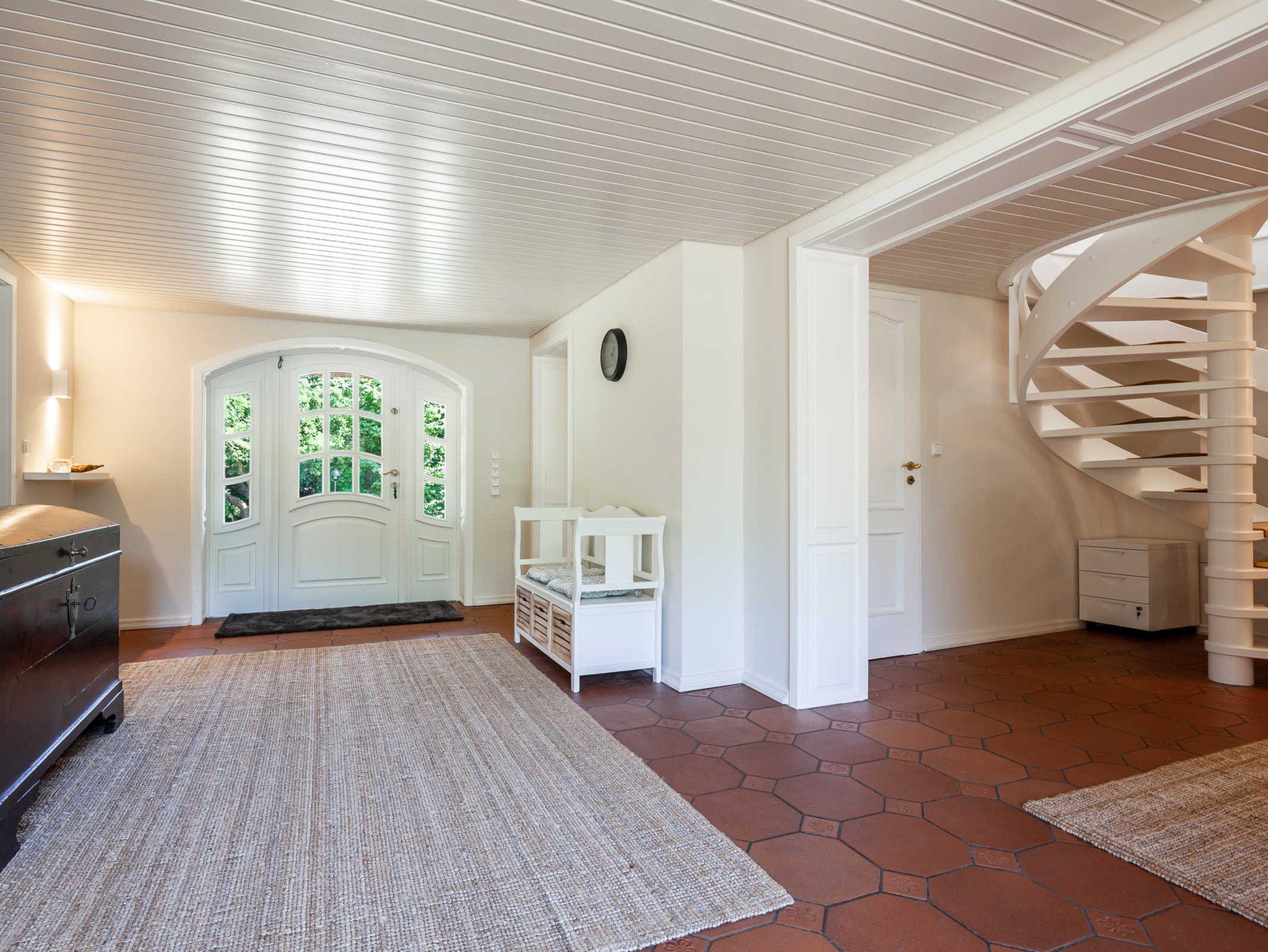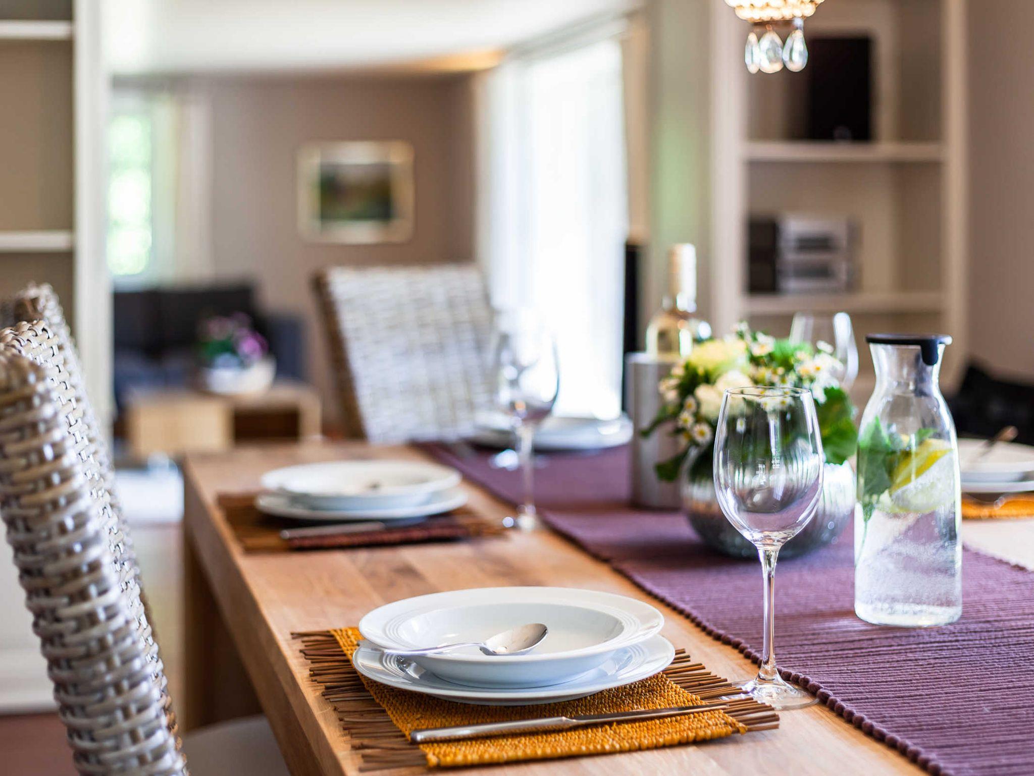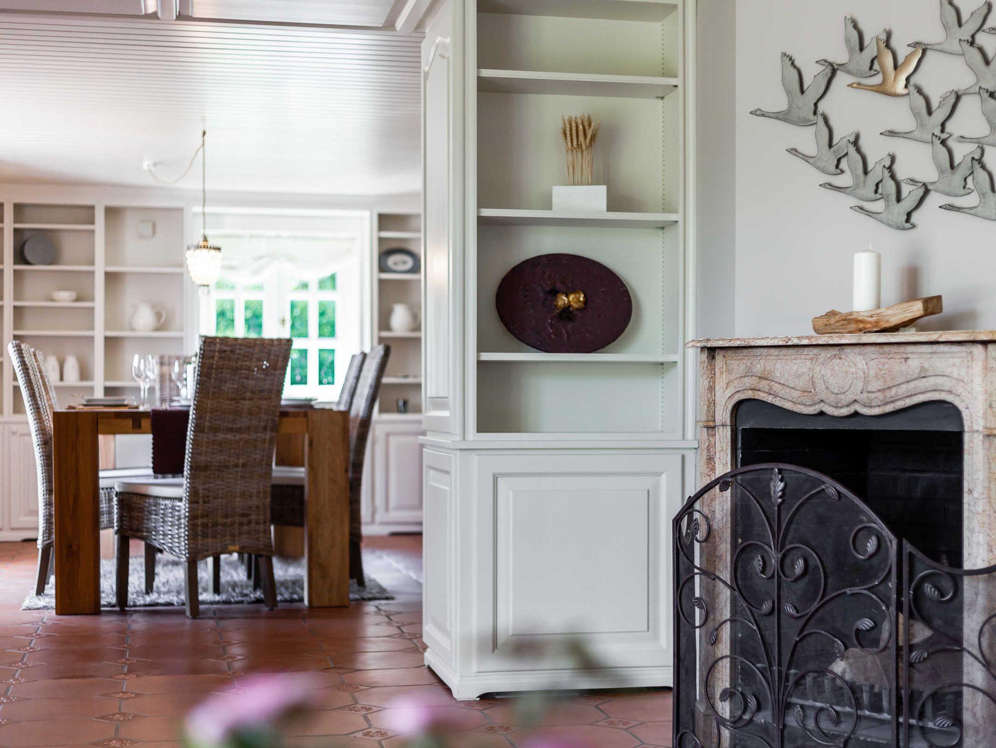 Das Ferienhaus heißt seine Gäste in einem großen weiten Flur mit angrenzendem Garderobenbereich willkommen. Der Wohnbereich mit Kamin und gemütlicher Sofaecke ermöglicht auch den direkten Zugang auf die möblierte Sonnenterrasse mit Blick auf den See. Das separate Esszimmer bietet am großen Esstisch ausreichend Platz für alle Gäste und lädt zu gemütlichen gemeinsamen Urlaubsessen ein.