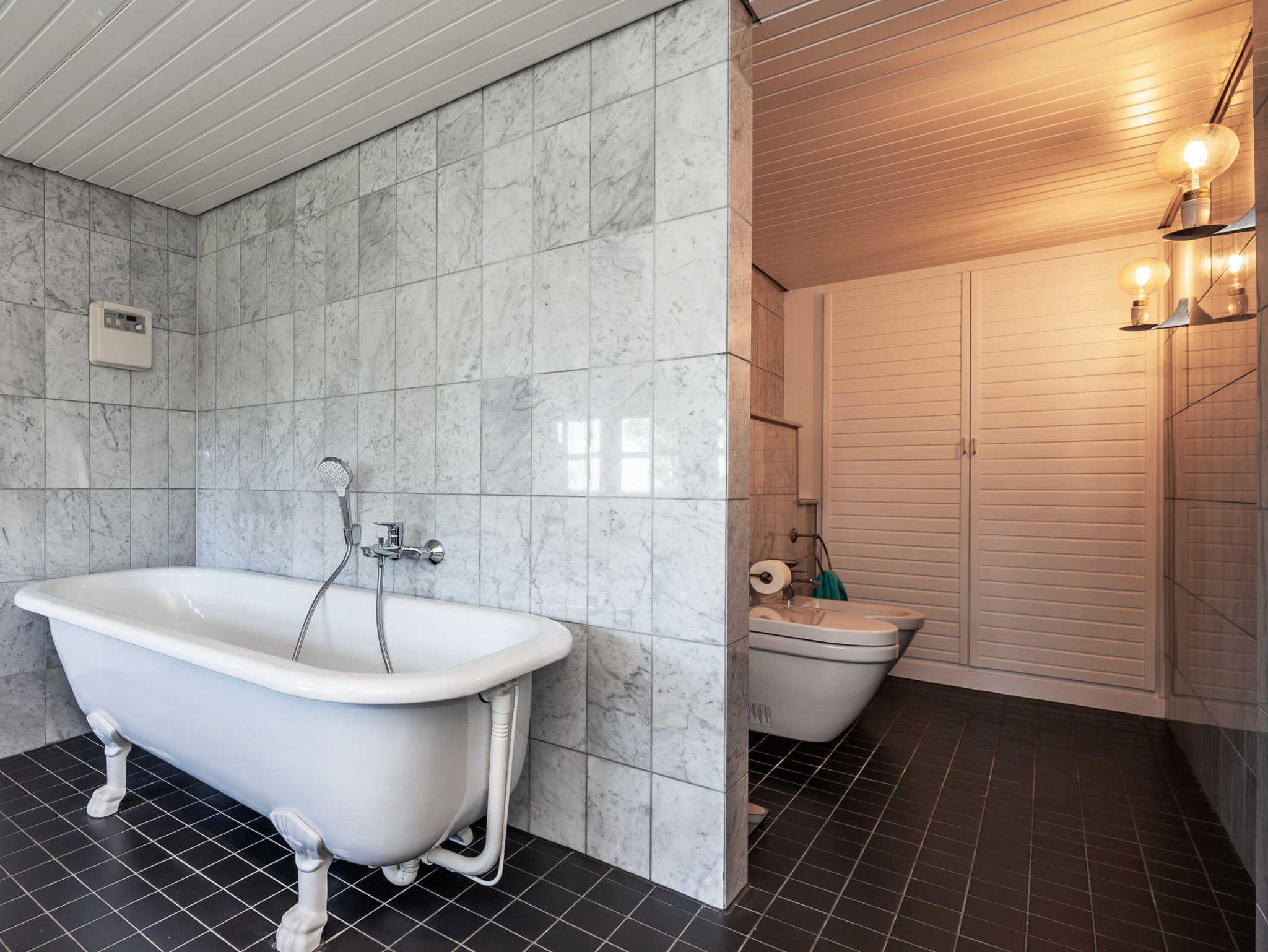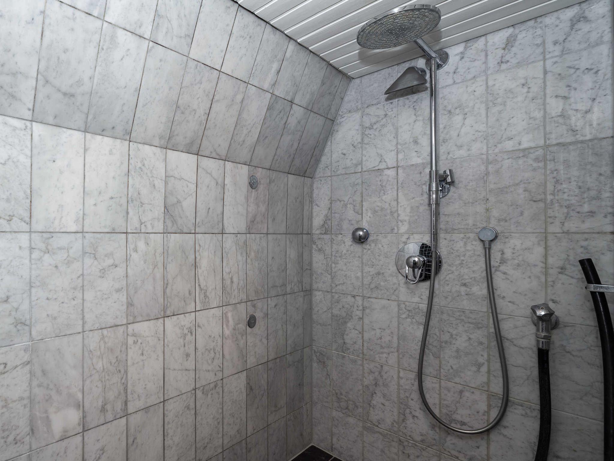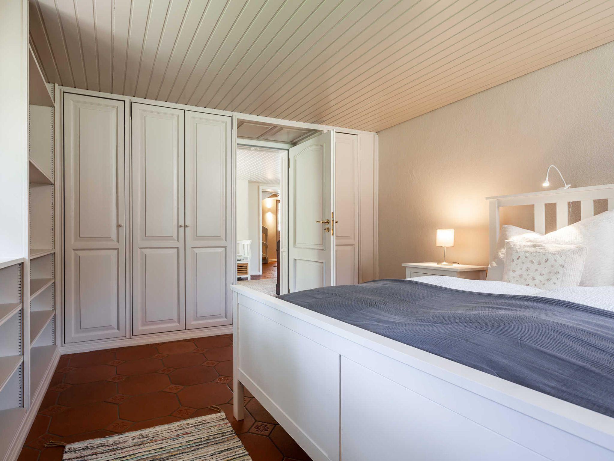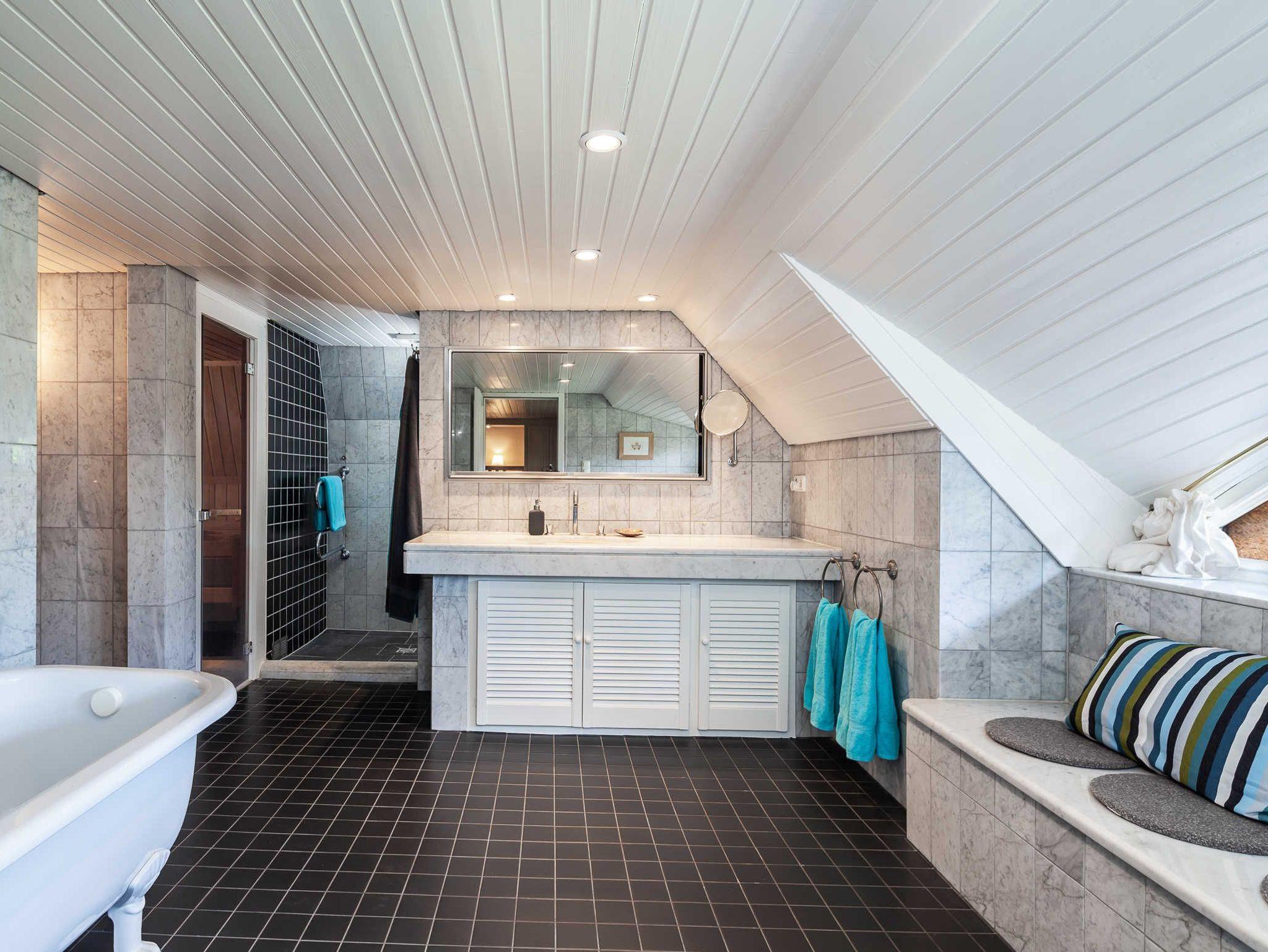 Über die urige Wendetreppe gelangen die Gäste in den oberen Bereich des Ferienhauses. Hier befindet sich ein weiteres Schlafzimmer mit einem Doppelbett und Kleiderschrank. Es schließt sich das zweite Bad an, das sich mit echten Marmorfliesen und einer freistehenden Badewanne schmückt. Die geschlossene Sauna ist ein besonderes Highlight für kühlere Tage. Nach dem Saunagang lässt es sich herrlich von der Mamorbank mit Blick auf den See entspannen. Desweiteren gibt es einen Duschbereich mit Duschbrause und Abspülschlauch nach dem Saunagang.